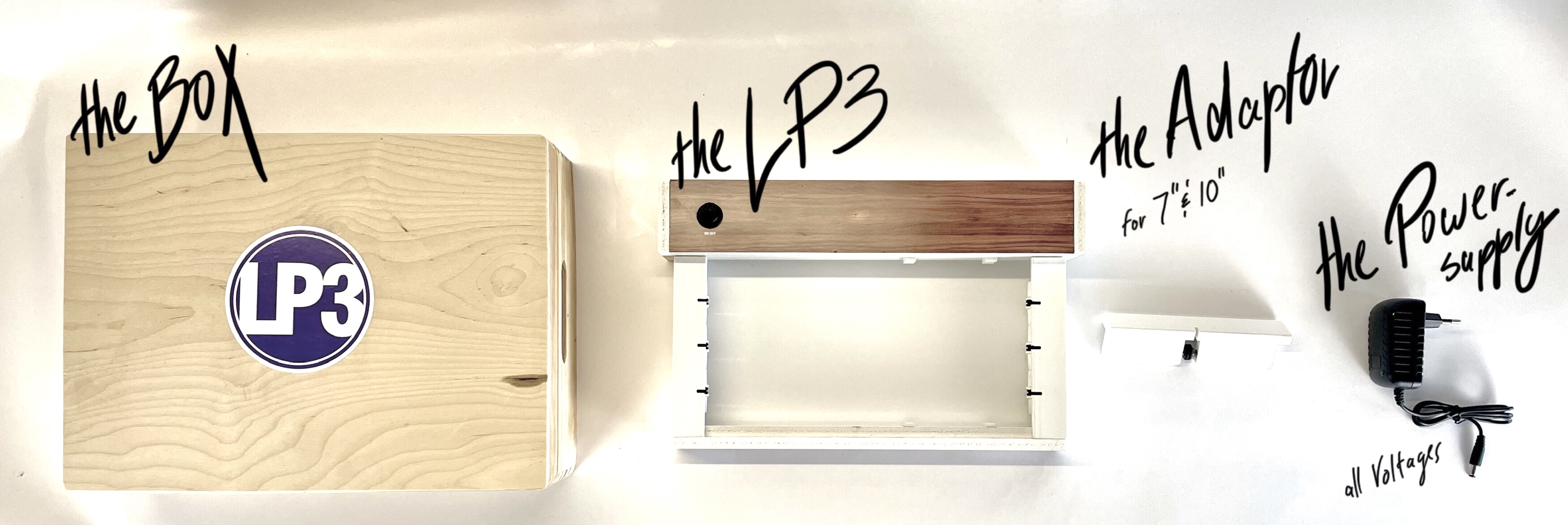 all the above is included in your order: LP3, 7“10“adapter, multivoltage powersupply and box that holds everything.