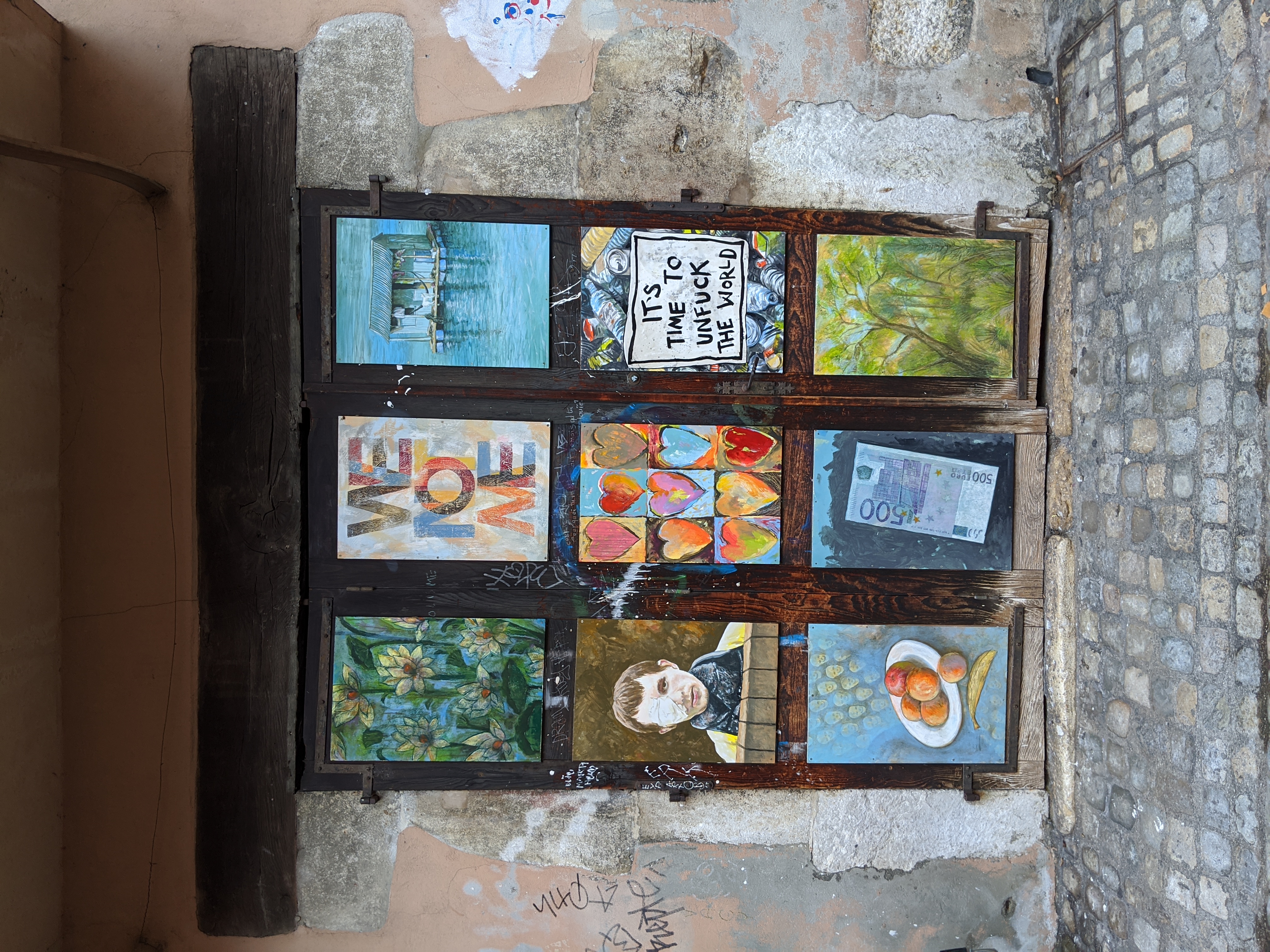 The city streets and market are heaving. As we stop to buy stuff in one of the shops, I’m wondering what the sticker on an adjacent lamppost means. It has the EU circle of stars, the word FREXIT, and a big cross. Is this pro-Frexit, crossing out the EU? Or anti-Frexit, crossing out the word? Whoever they are they need better visual design.