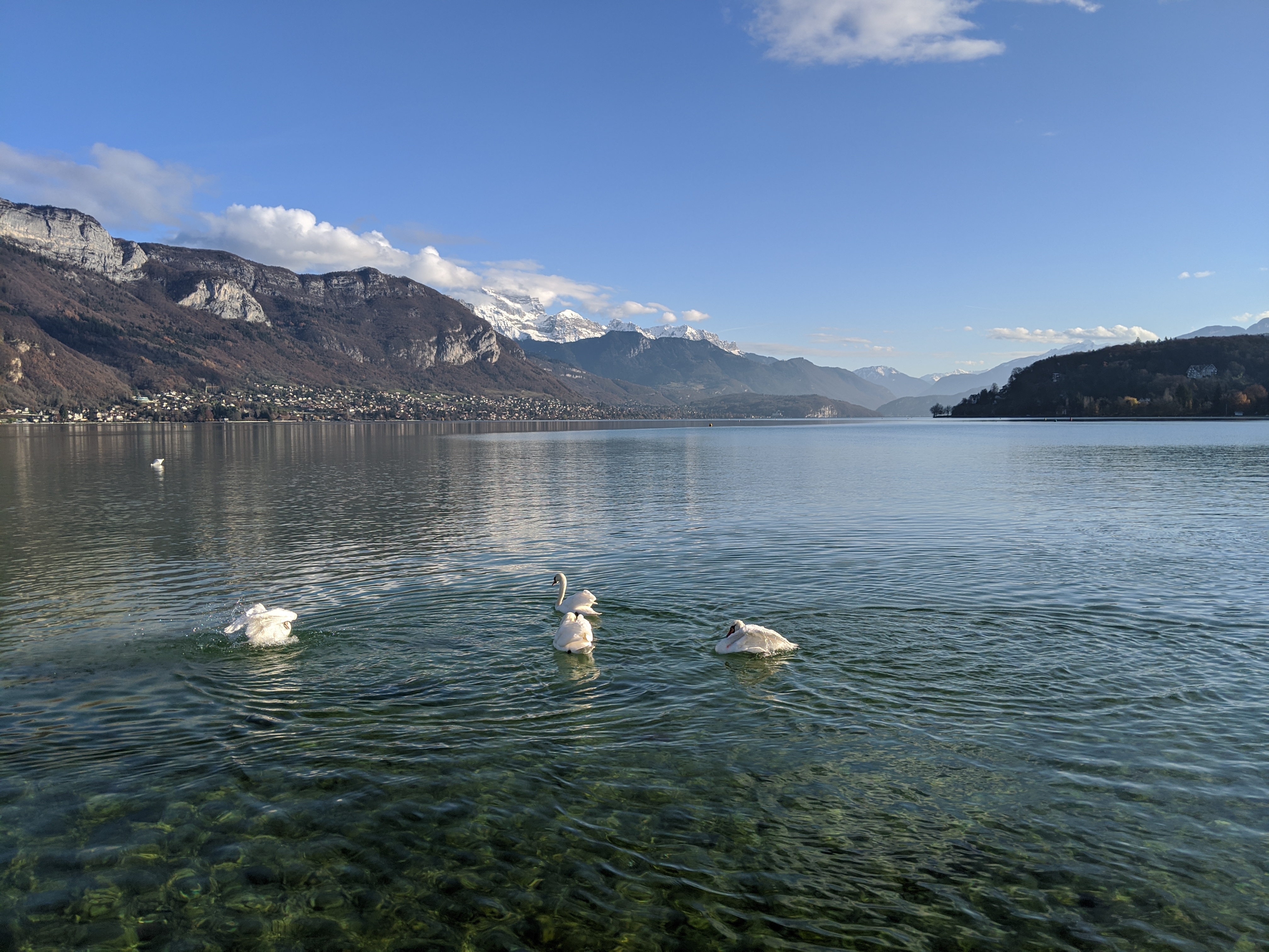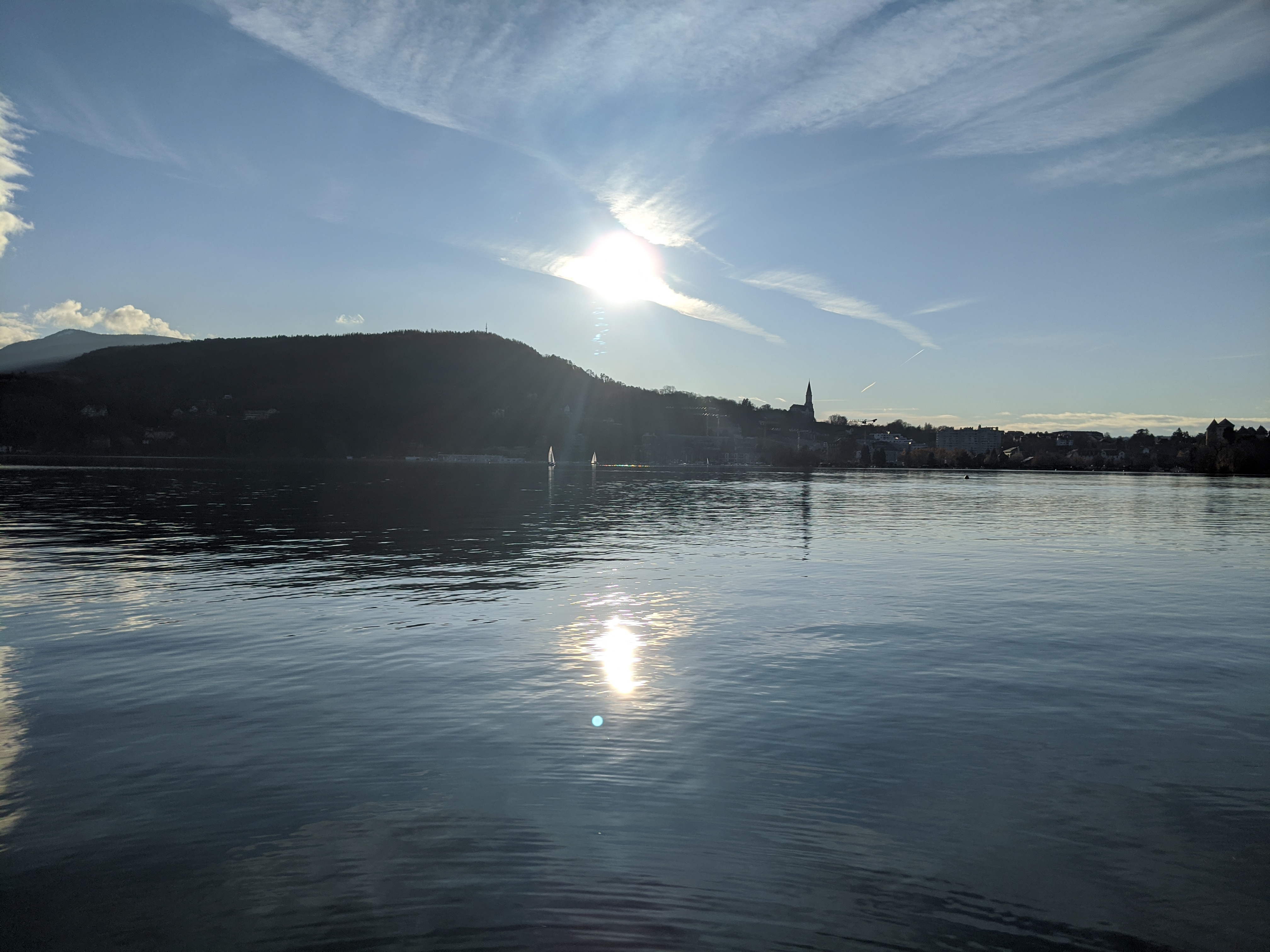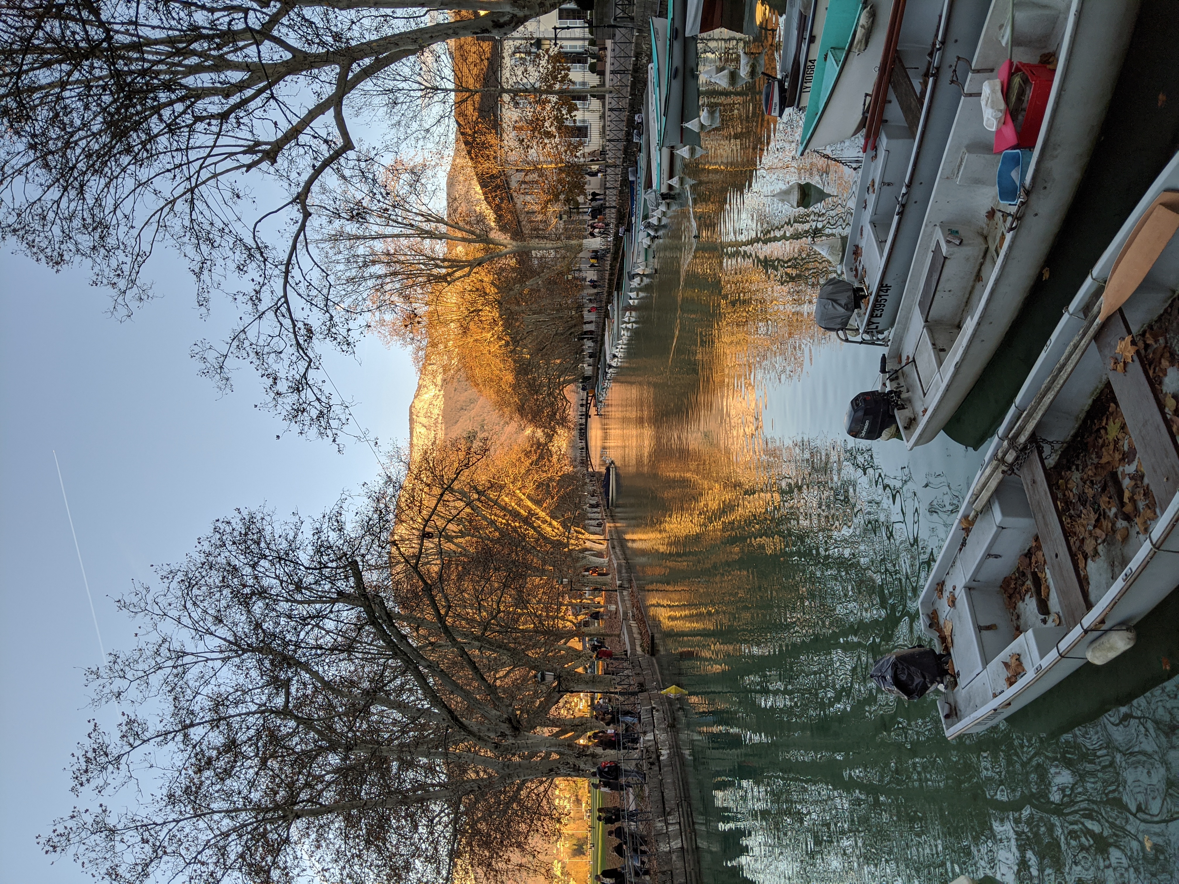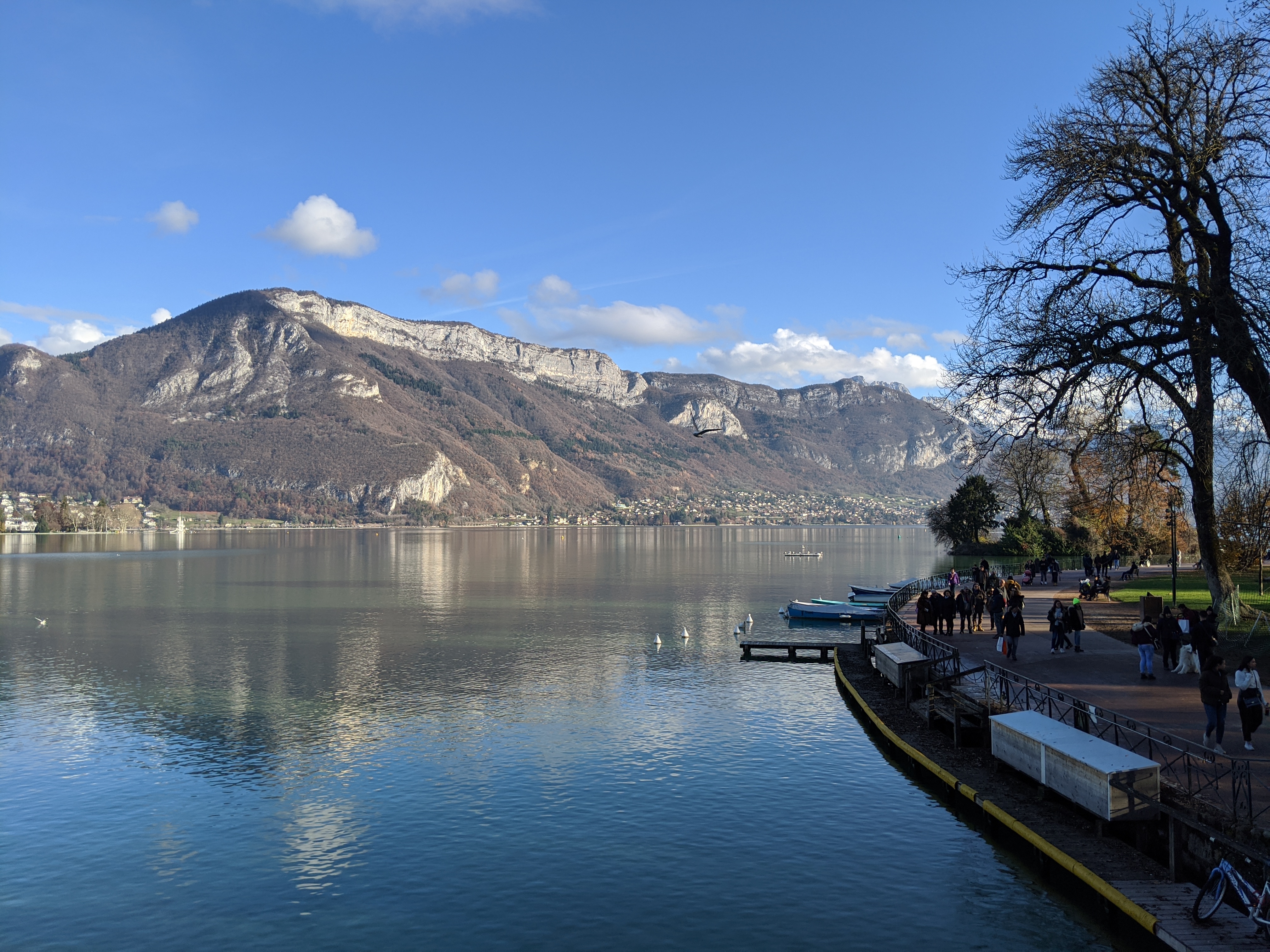We avail ourselves of some vin chaud blanc and go sit outside the market, on a bench by the touristy boats at what counts as a “port” around here. Helen is DESPERATE that we go on a boat trip on Sunday, having seen how great the lake is.