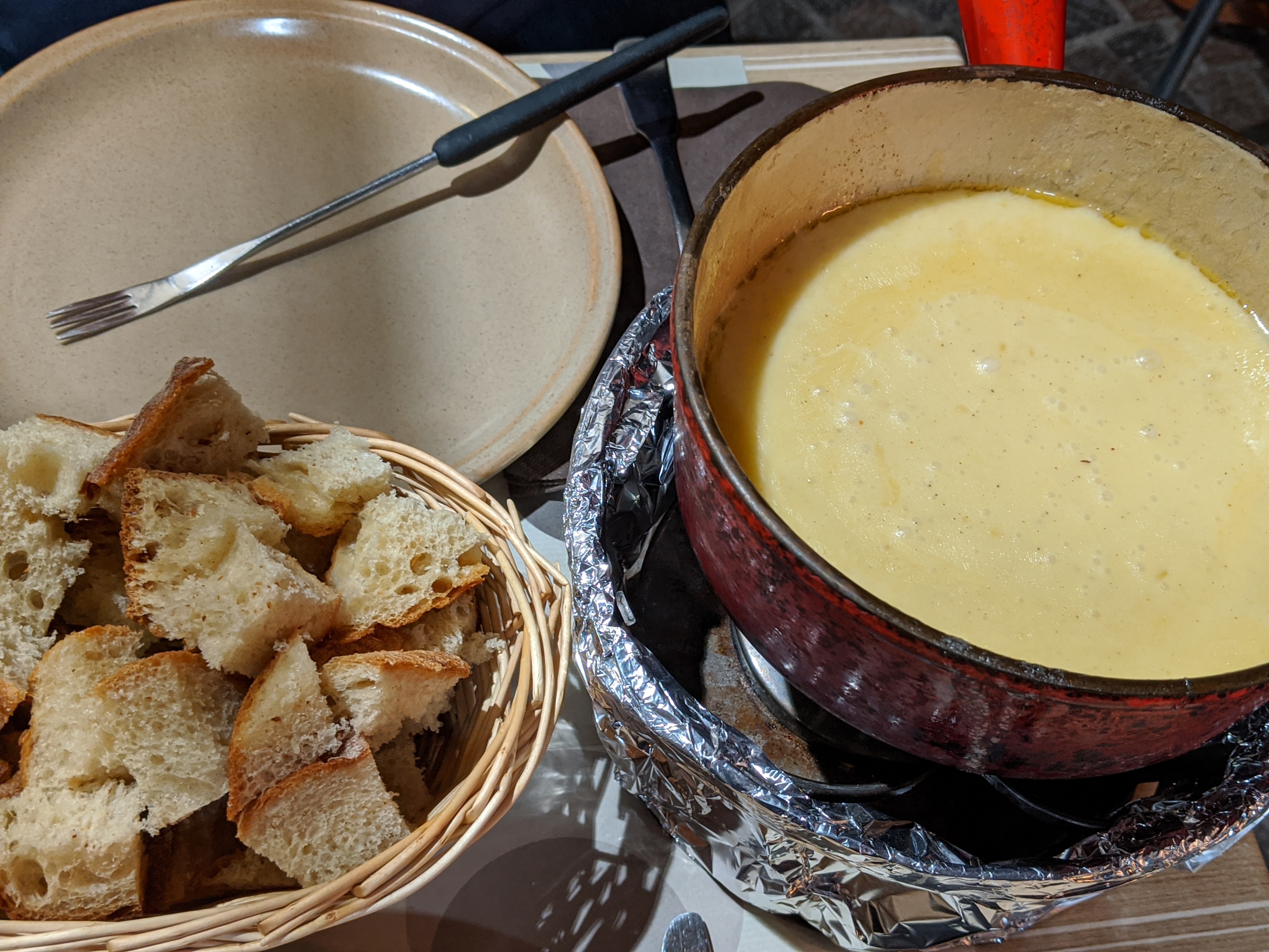 There are options which come with weird stuff like potatoes and salad and charcuterie, but ours is just fondue and the exactly right amount of bread to eat the whole damn lot. It’s AMAZING.