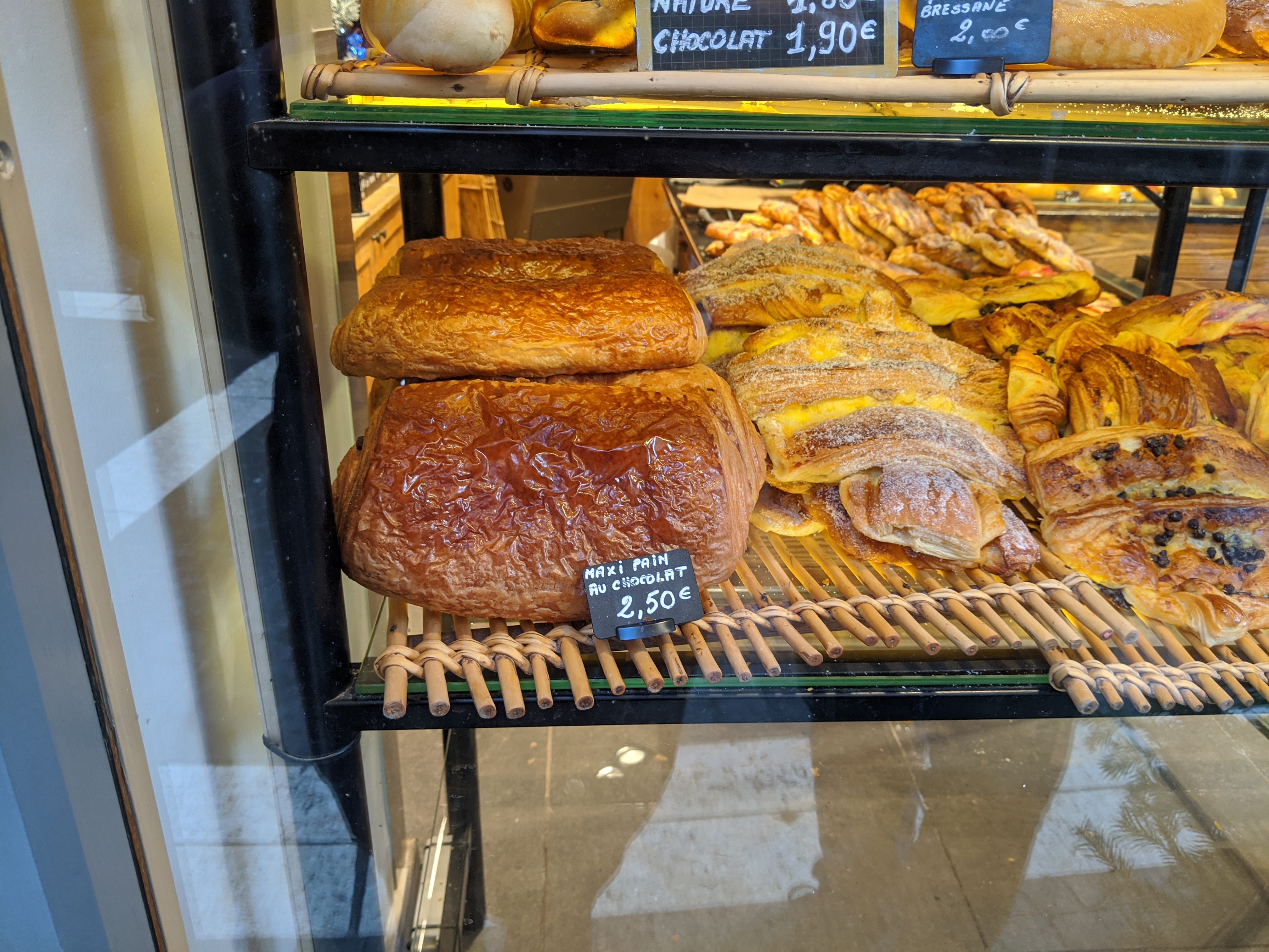 A patisserie caught our eye, as a potential place to buy Sunday morning breakfast. In particular it was showing off, in Helen’s words, “pain au chocolat as big as yer head”.