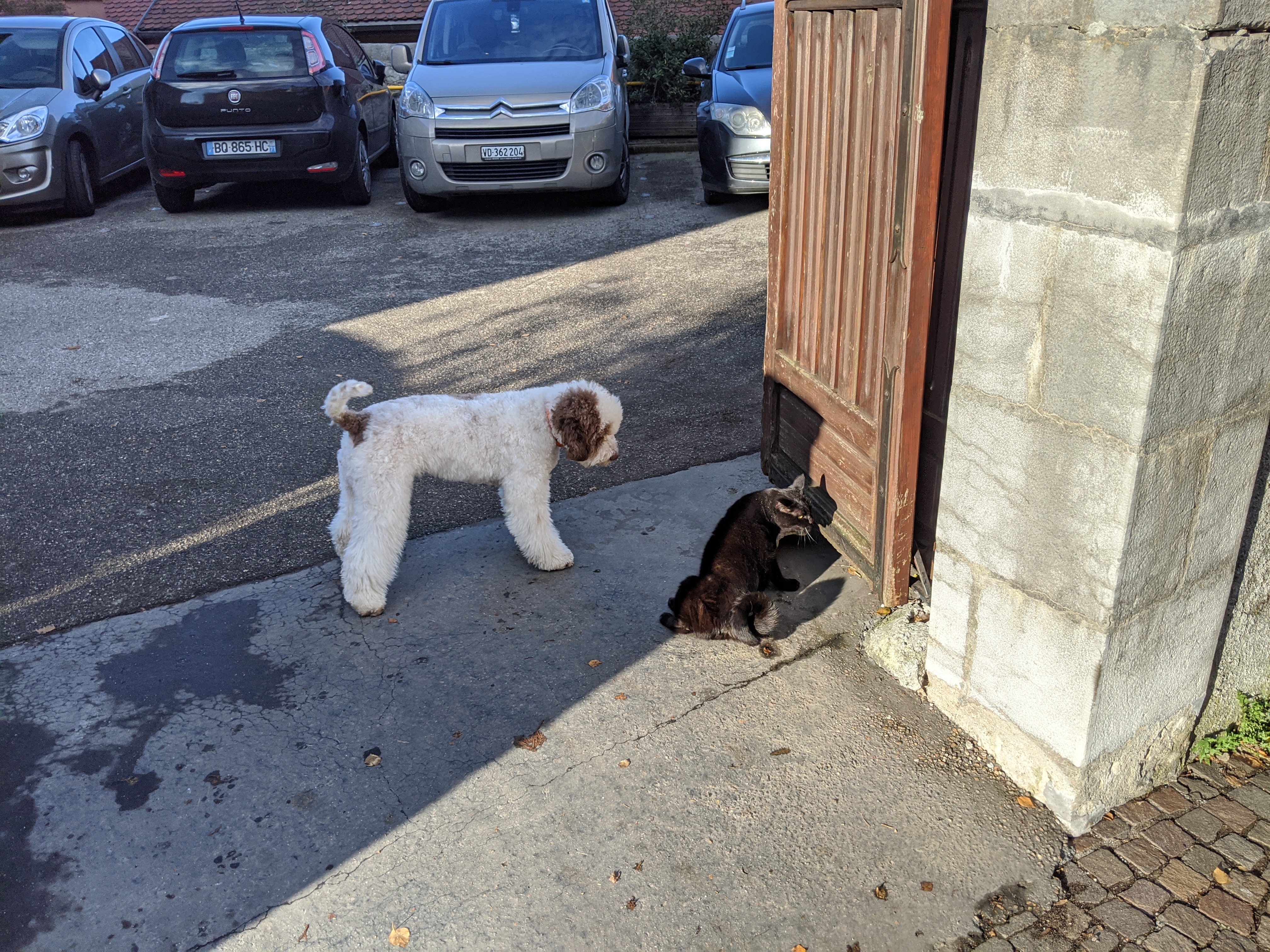 Only another 5 or 6 steps later, at the entrance to a hotel’s car park there’s a cat and a dog. The dog seems a bit like a puppy, and wants to play with the cat who is having absolutely none of it. An old French man next to us is roaring with laughter and we feel bad for not being able to speak with him.