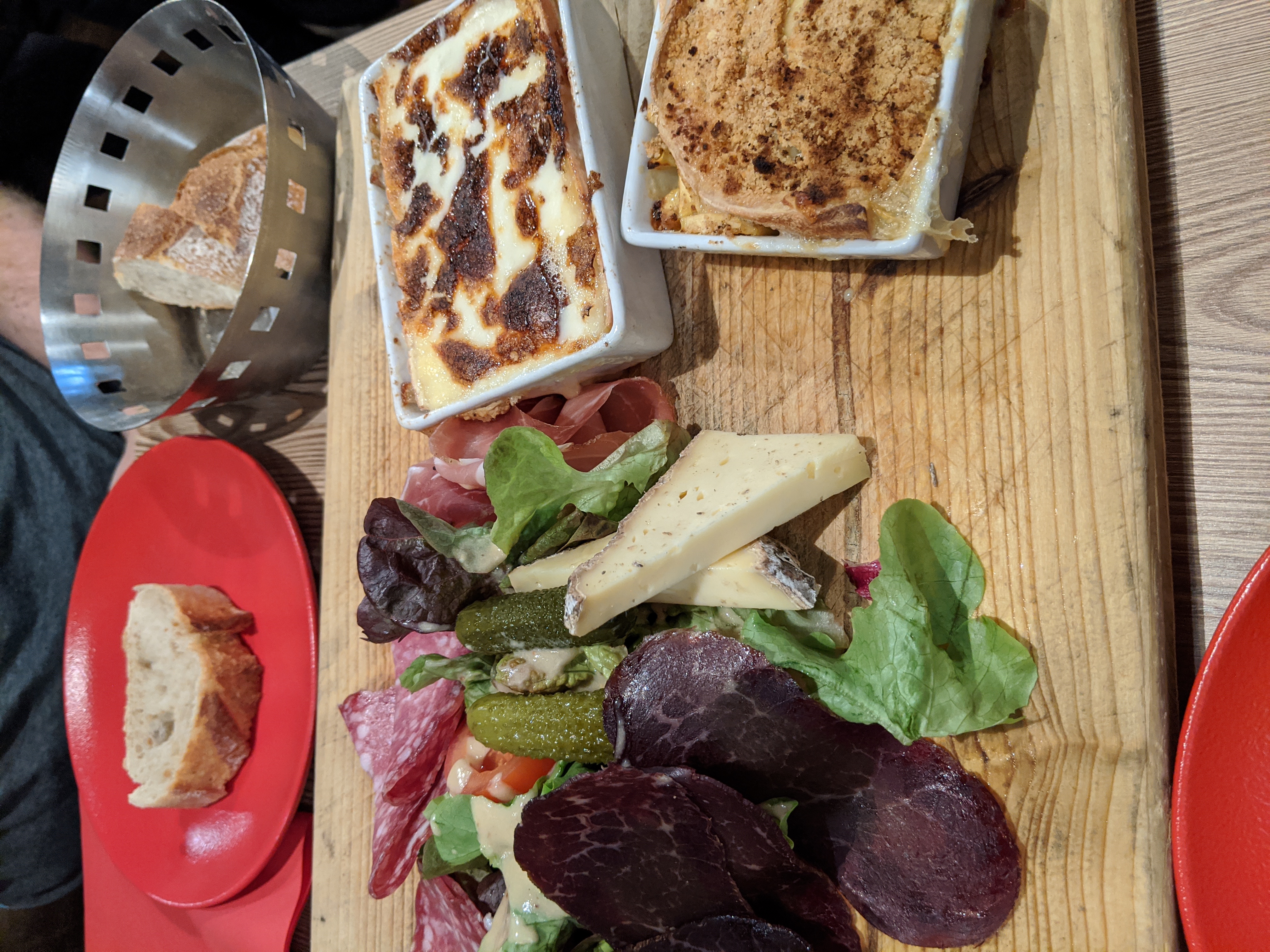 We opt for a “plateau Savoyard”, a dish meant for one person – our waiter is very confused by our desire to share it. It’s a platter of local specialities, what with Annecy being in the Savoie region ‘n that. What you’ll see here is cheese and lardons in a dish, a load of cold meats and salad with some more cheese, and a savoury apple crumble containing cheese.