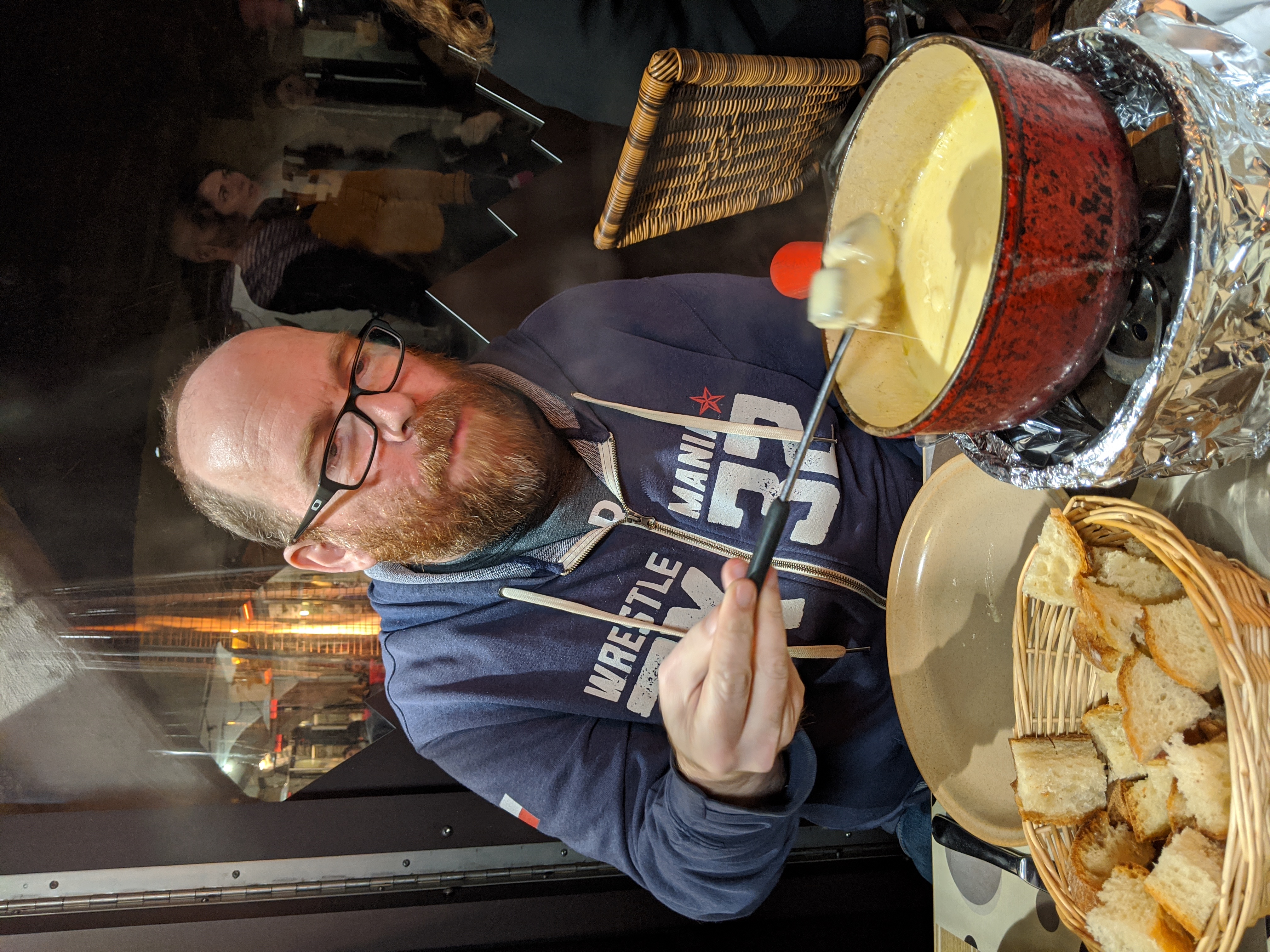 I think this might be the first real fondue I’ve had in my entire life. Back in 2014, Helen and I were meant to go for fondue on our second date but, if memory serves, I had to work late which meant we missed our booking. Then a couple of years later she booked us seats at this thing on the South Bank where you sat at a bench with strangers and the food was a bit crap. So this, at the age of 45, is really my debut. I suspect had I discovered it at the age of, say, 25, then I wouldn’t have actually reached 45.