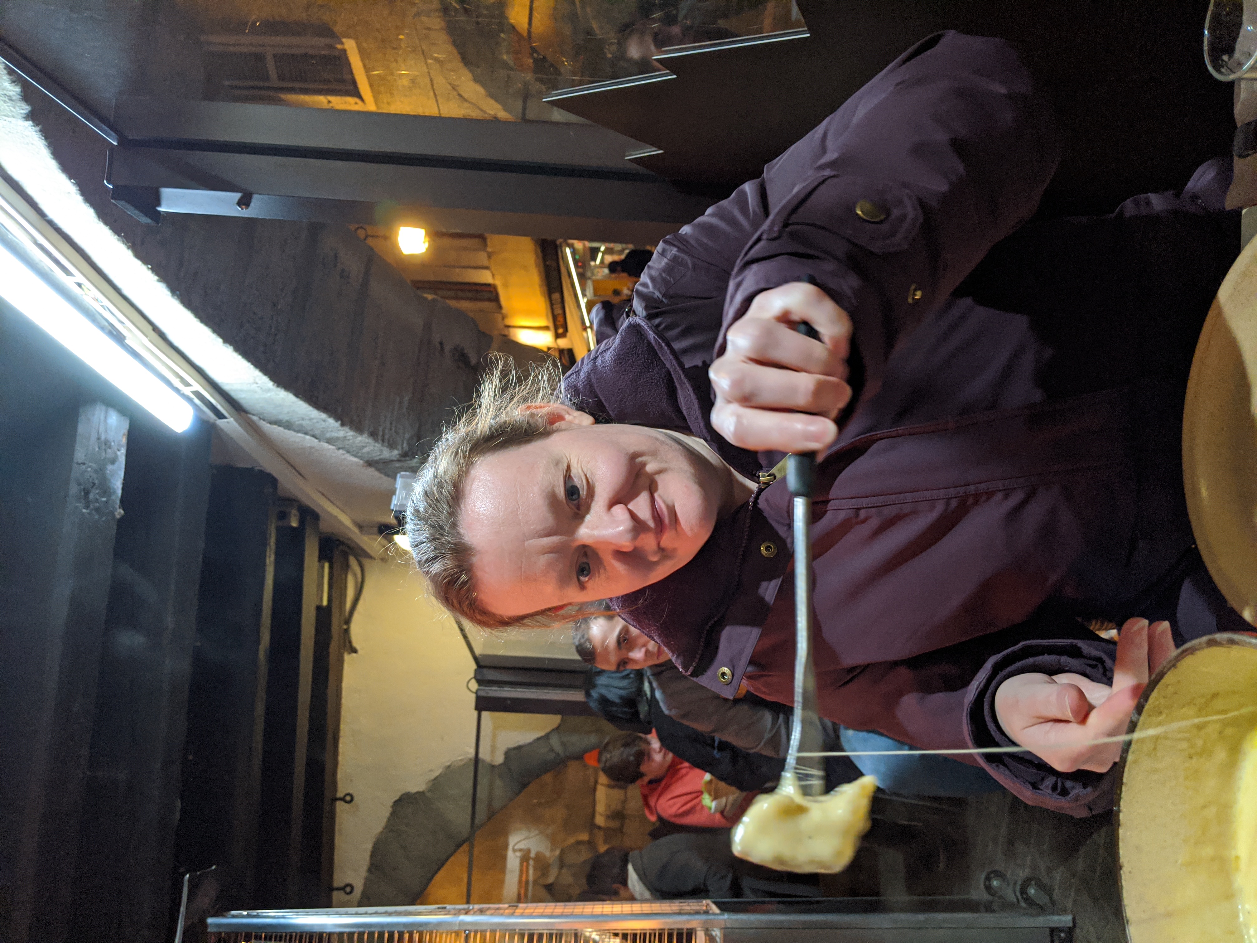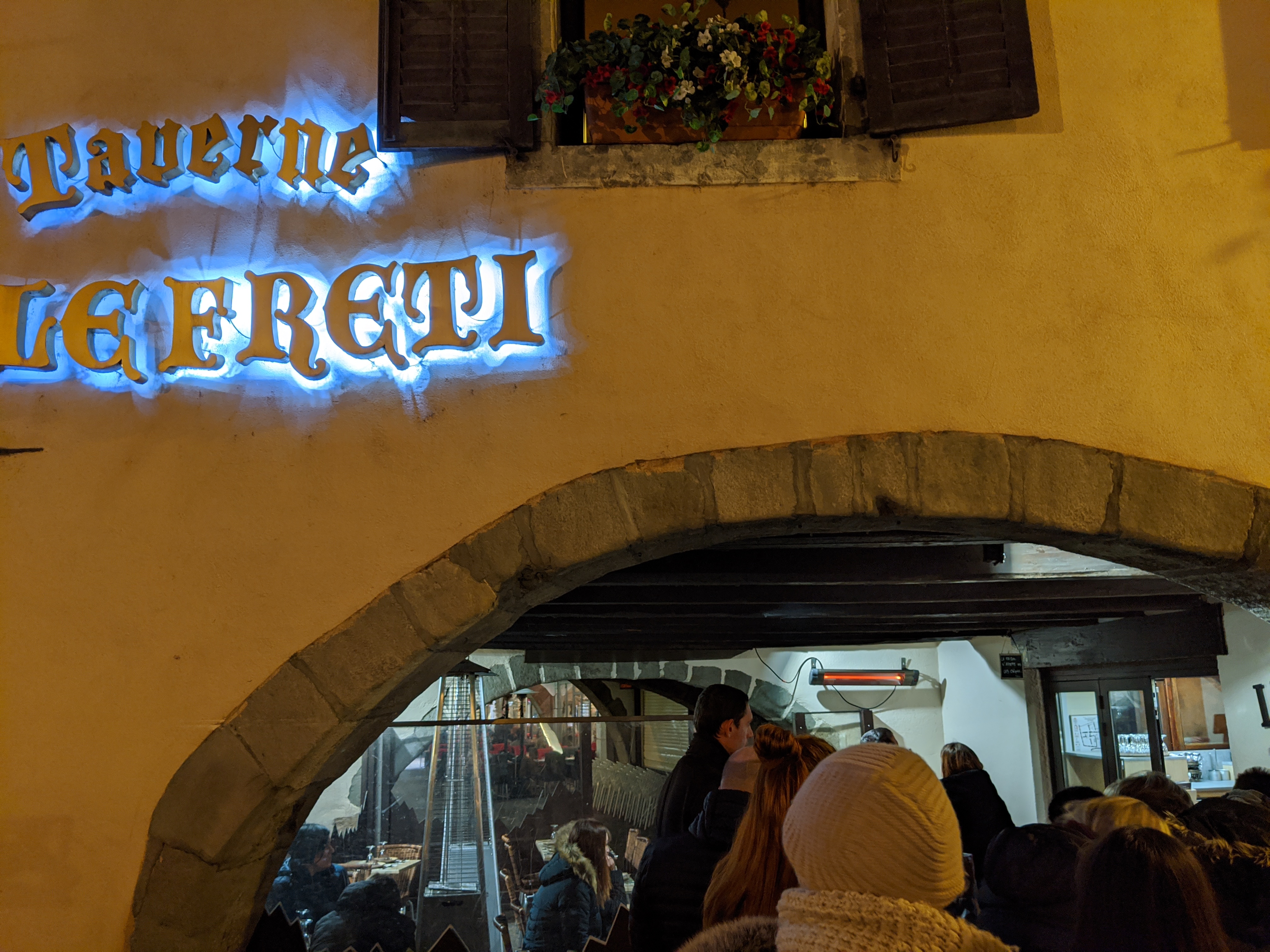 Back at Le Freti we decide the answer to that question is yes, because by now there’s a genuine queue of 12 people or so. We join it, and behind us it grows rapidly. At about 7.01pm a waiter starts to let people in, firing rapid questions at each group in the queue. How many people? OK. Have you booked? OK. If not booked, you have to sit outside and there will be NO RACLETTE. OK that’s fine by us.