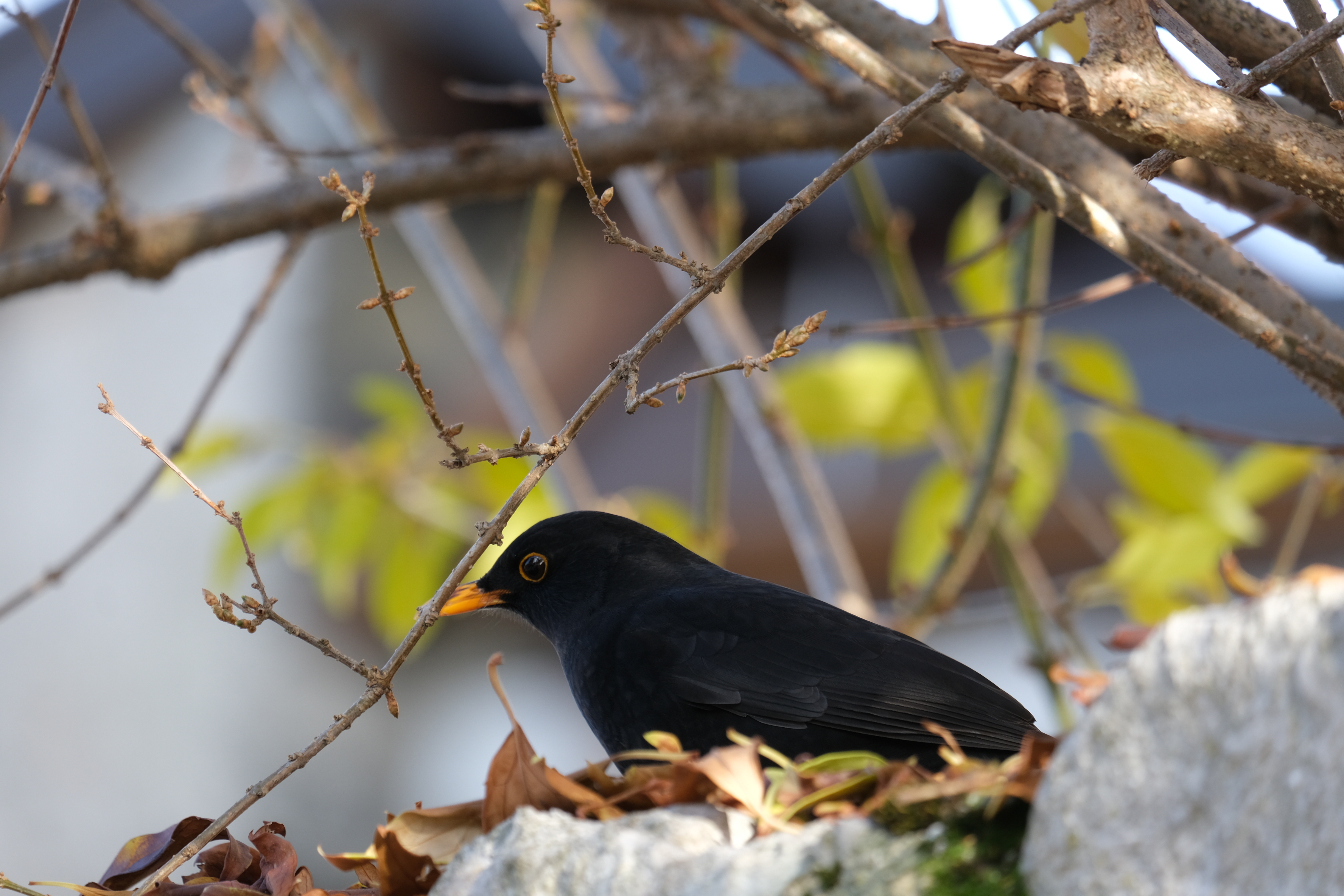 First, I am somewhat transfixed by a group of sparrows flitting about in the trees on top of a wall – but then we’re both amused by a blackbird that turns up, stands on the wall, and starts clearing it of all the leaves. Chirps, picks up leaves in beak, throws on ground, hops along a bit, repeat.