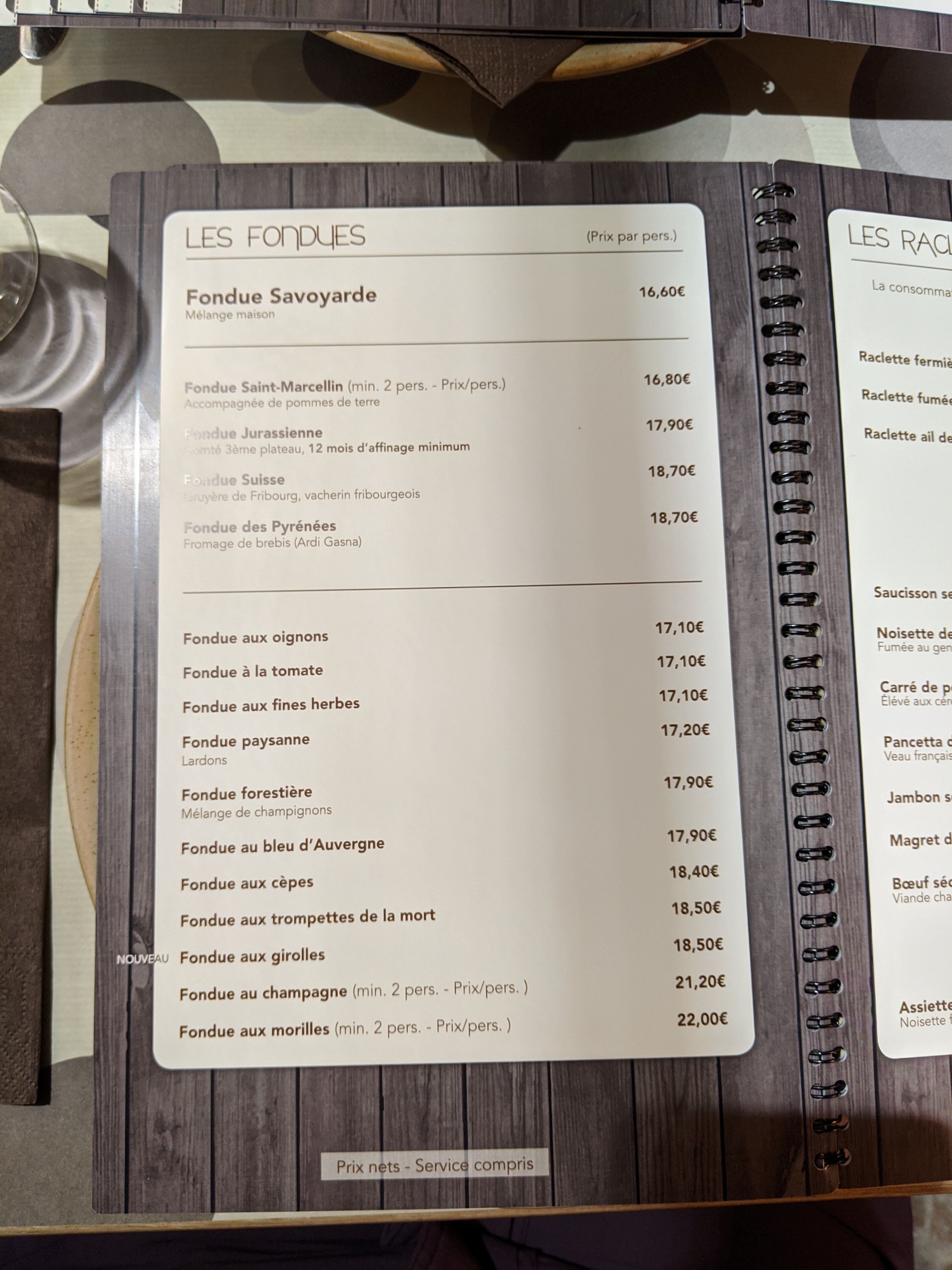 Our preferred venue is Le Freti, because I’d looked at its website a couple of weeks ago and they have 16 types of fondue on the menu. Fuck yes fondue.