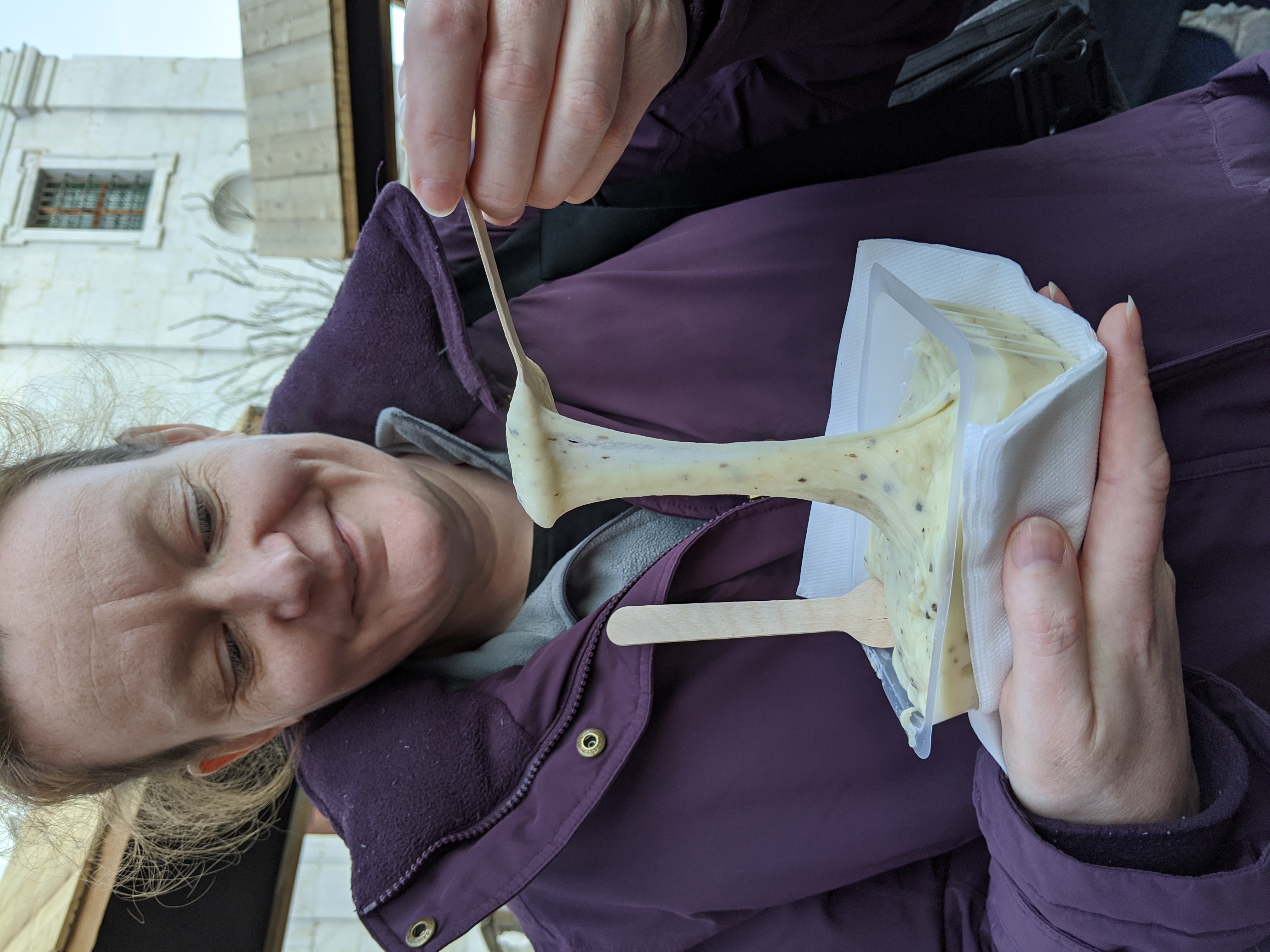 Once we’ve finished, we think it’s probably a good idea to try and walk some of the cheese bloat off. So, another circuit of the town and back towards the market. It’s way less busy than it had been all afternoon, because of course most people in the town are now packing out all the restaurants. This makes buying two more skieurs a quick and simple job, and once again Helen declares she is hammered pretty much as soon as she finishes it. I really don’t know what’s in it, and it does not have the same effect on me.