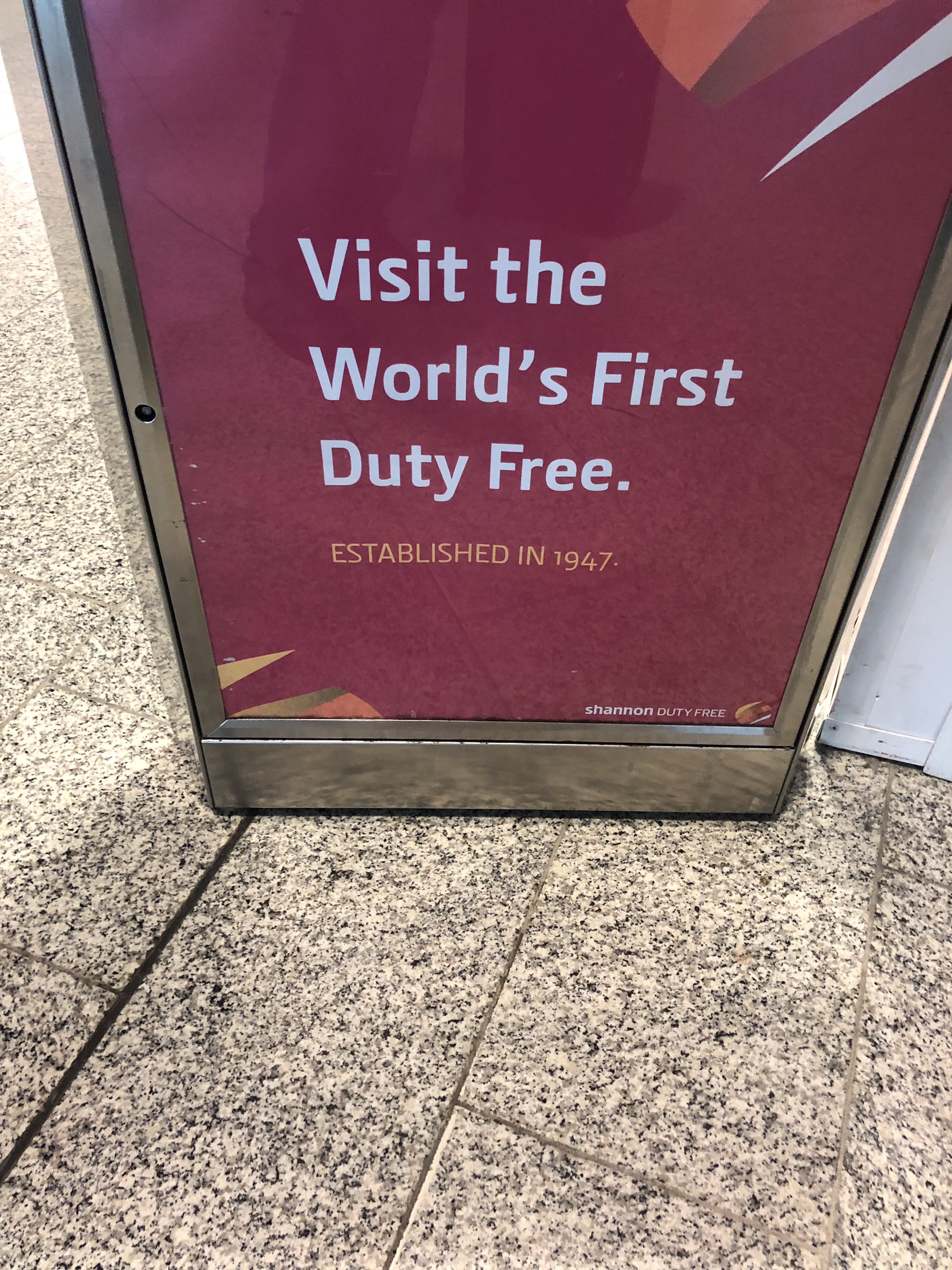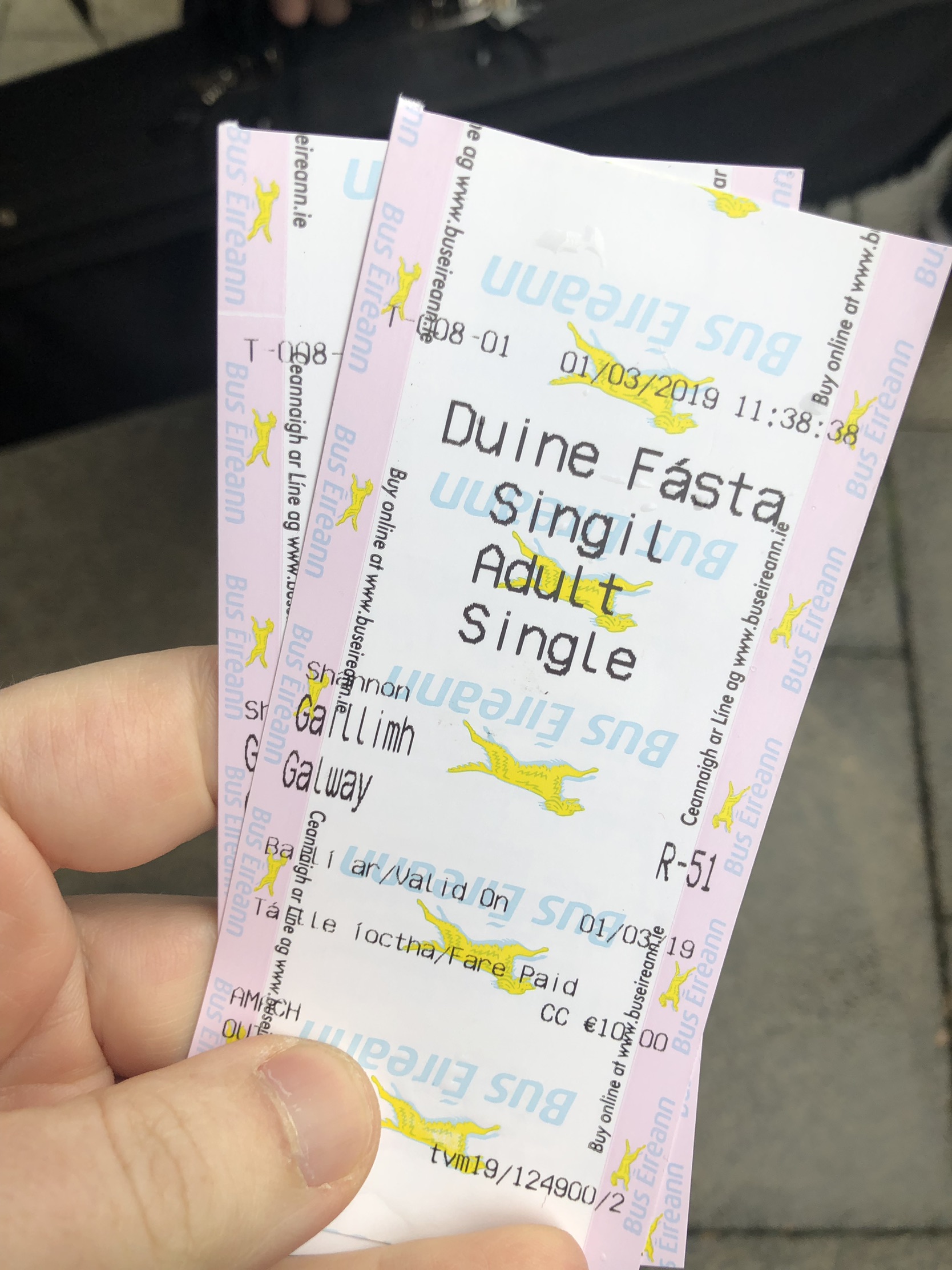 The bus ticket machine is a piece of piss to spot in the arrivals area, and I buy two tickets to our final destination: Galway. There’s a bus in 20-odd minutes, giving us time for comfort breaks and liquid purchases. Also some tourism: Shannon apparently was where the first ever duty free shop was? Outside the weather is bleak. Very bleak. But a pied wagtail is nice to see, near the smoking area.