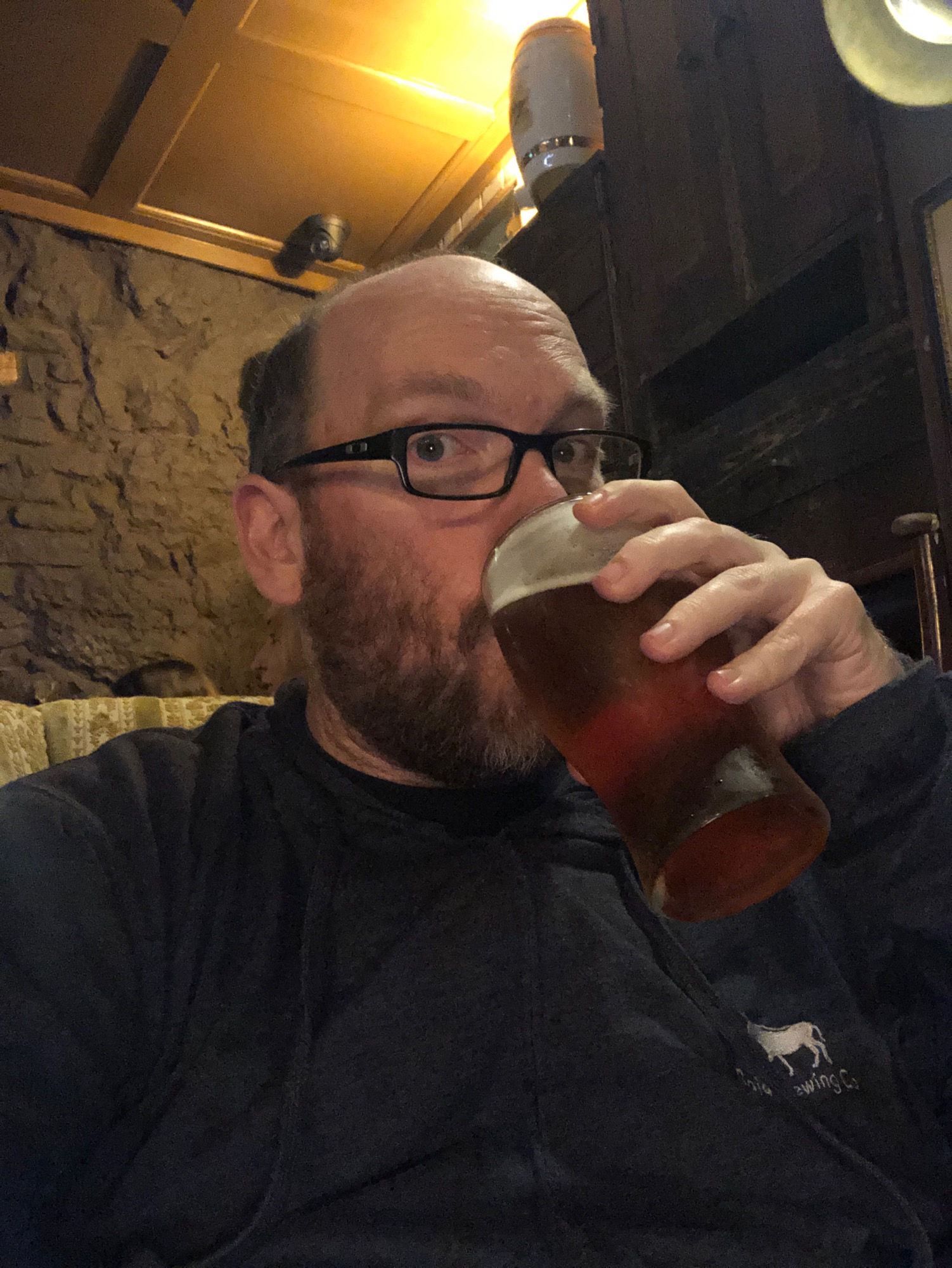 Beer wise, I’ve inadvertently bought a stout I’ve had before. Helen, justifiably expecting a decent selection of craft cider, has to settle for a pint of Thatchers that she doesn’t particularly like. But the atmosphere is nice and the seats are comfy. Behind us there’s a few people with a young dog which evidently lets off one of the worst farts in canine history, causing about 6 or 8 people to laugh and screw their faces up and bring their shirts up over their noses and stuff. Helen witnesses this to much amusement; I miss it all, and in fact the smell never reaches us.