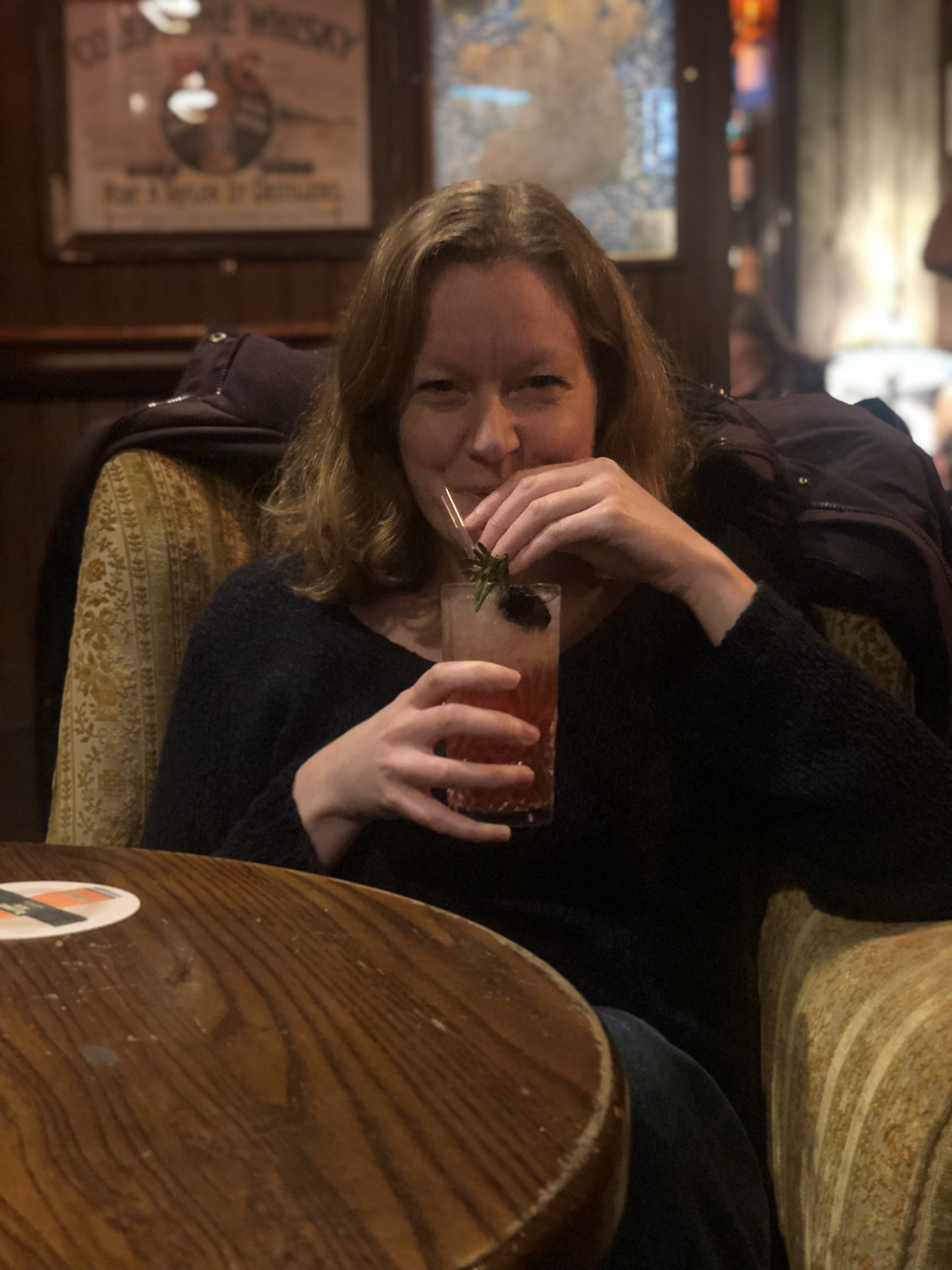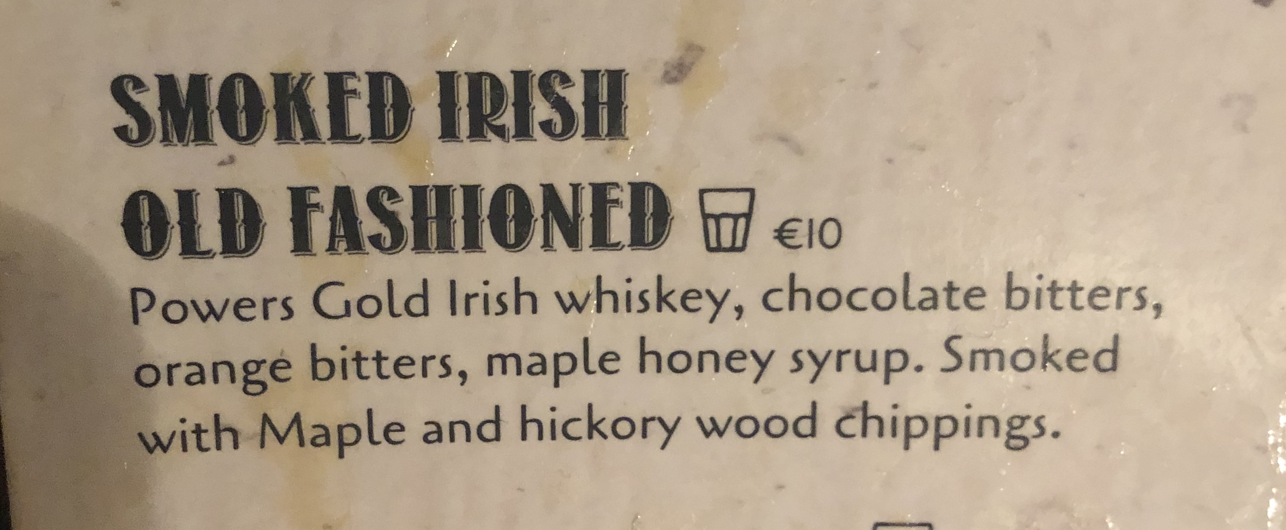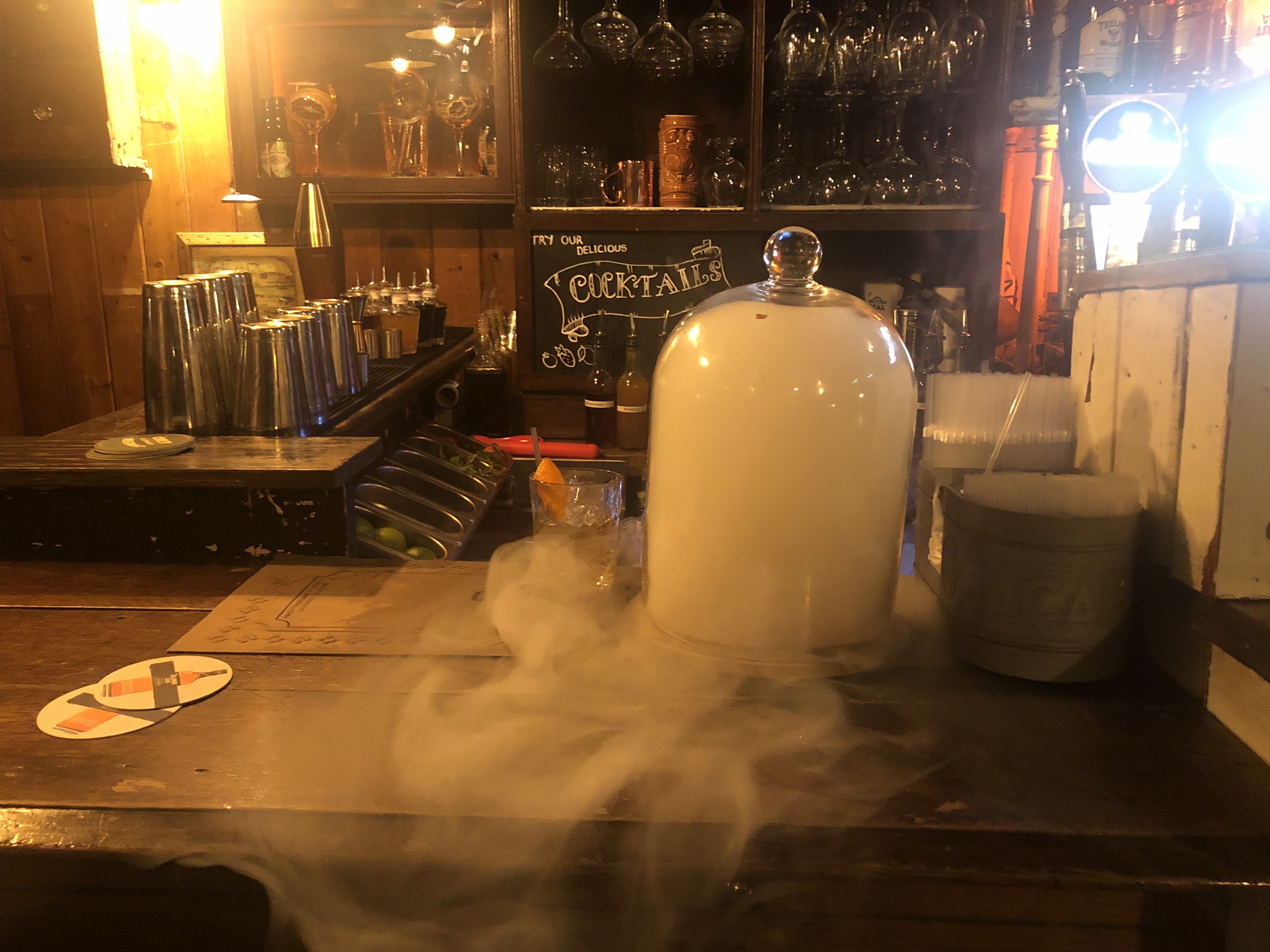 The main bar says we have to go to the back, where there’s a dedicated cocktail bar, to redeem. In an excellent turn of events we grab two very comfy seats next to the fire, and I go to the bar. I know we’re allowed either an Old Fashioned or a Whisky Sour; we go for two Old Fashioneds and I’m asked if we want them smoked or not. I know next to fuck all about cocktails but I do know that I like my booze smoked so yeah, one smoked and one not, please.
