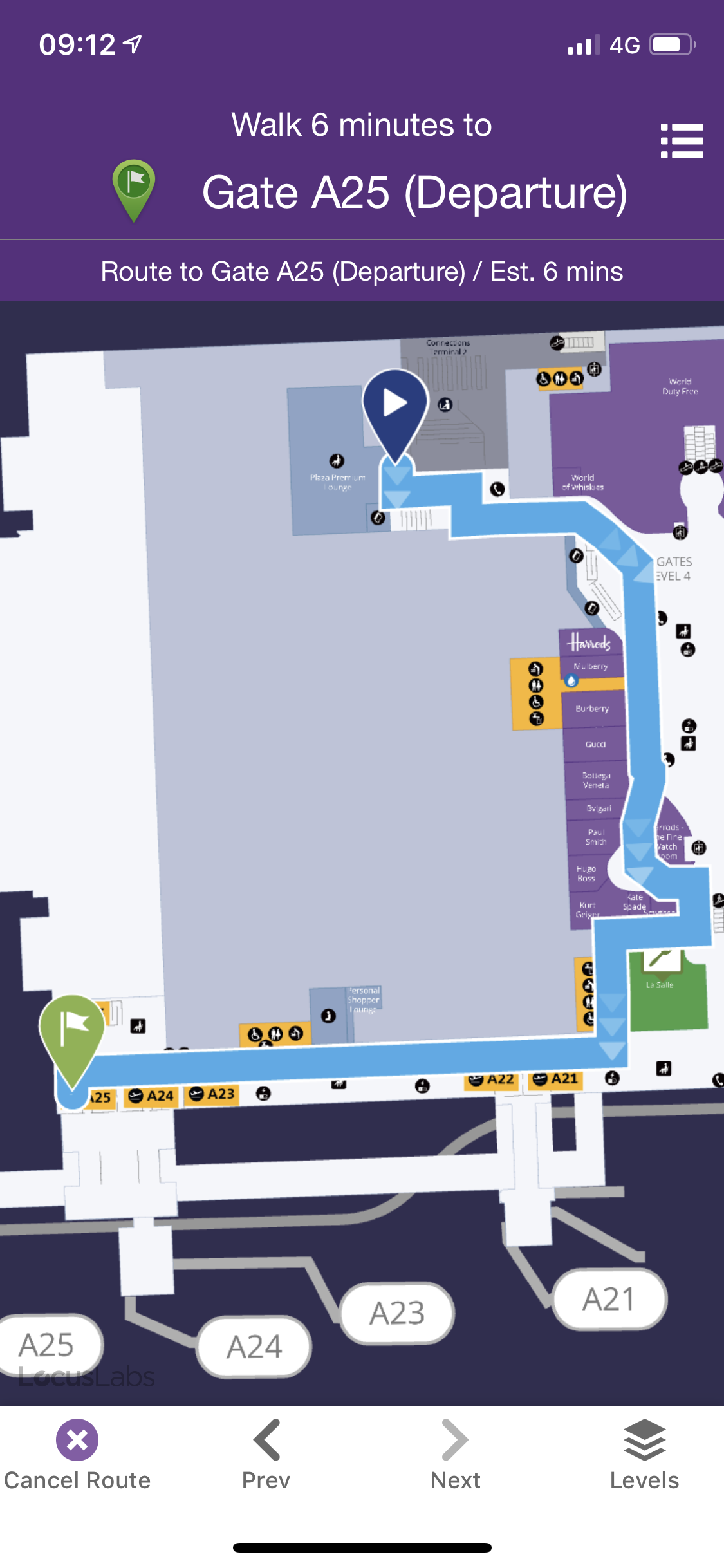 Helen has a G&T - required preparation ever since the Cessna adventure in Costa Rica - and with much time to spare, we each have a second. Just after 9am, an hour before take-off, we learn our gate. I like how the Heathrow iOS app provides walking directions inside.