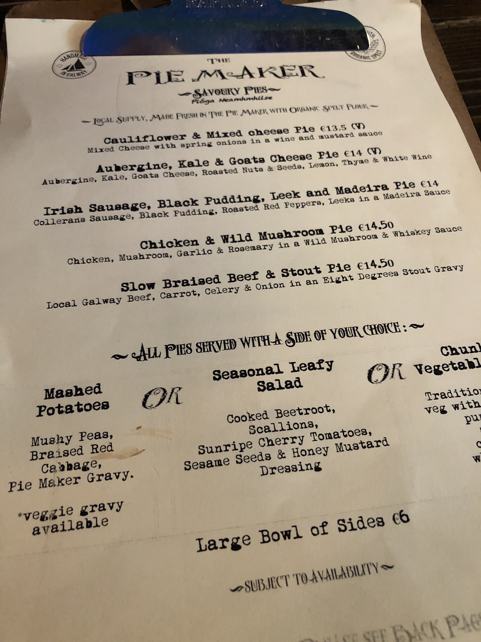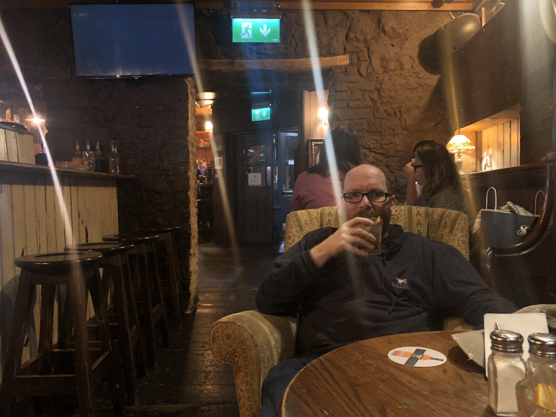 The pub has live music. Back when we’d checked in we had been given the full SP: there’s no breakfast provision by the hotel except they would, if we wanted, put a small bag with, like, a school-style breakfast pack outside our door in the morning. Otherwise we should use the pub which serves from 10:30am onwards. In the evenings they stop serving food at 8pm, and there will be live music until 11pm after which there’ll be a DJ until 2am. The Irish take music very seriously, it’s completely ingrained everywhere. I don’t think there’s even the concept of a quiet pub in this country.