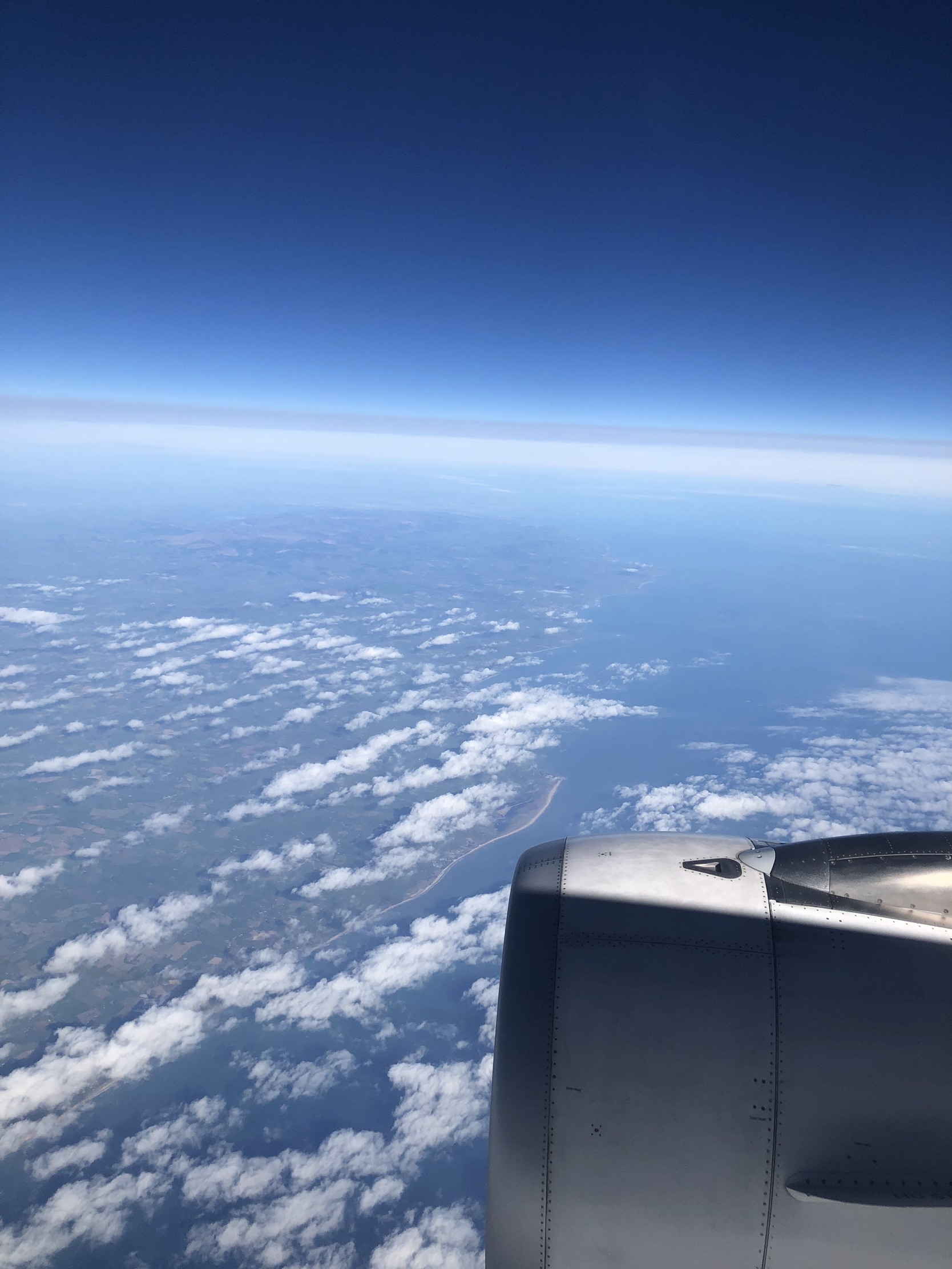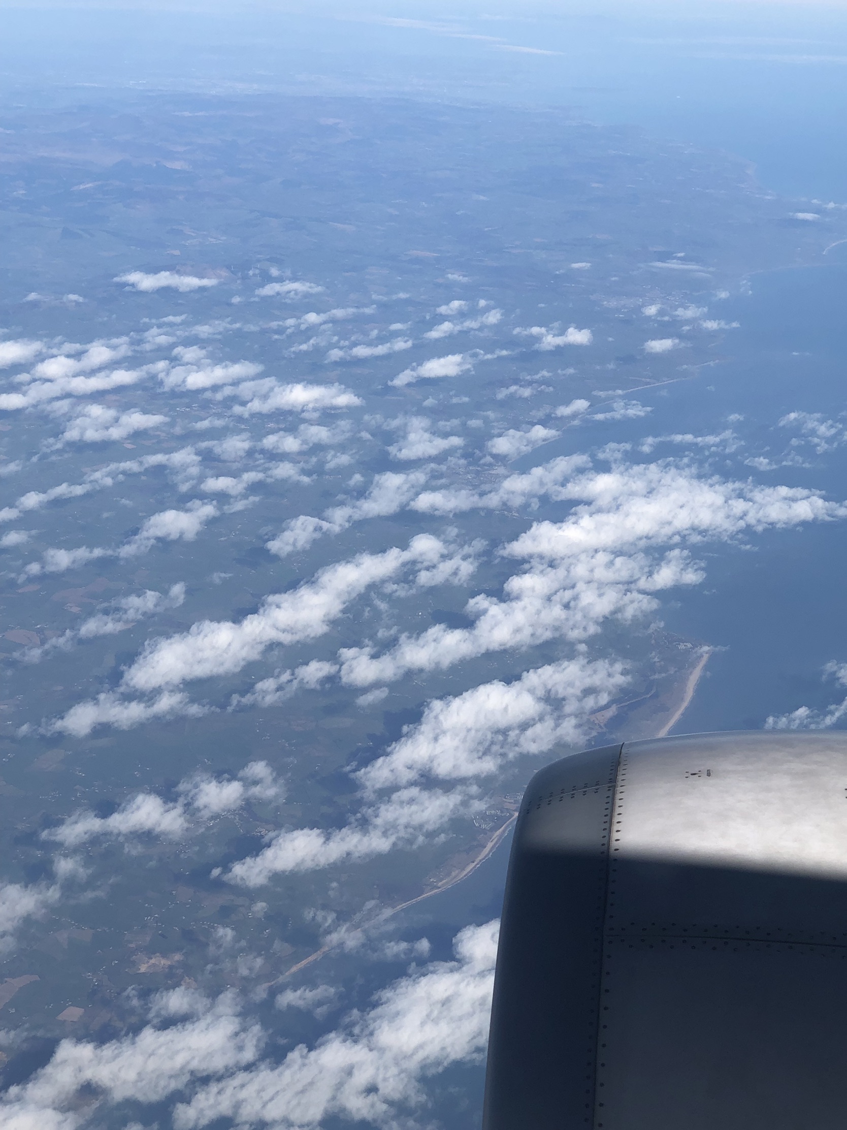 We pull away from the gate on time and taxi for bloody ages. It’s a grey day so no views are particularly great. The flight is, accordingly, pretty nondescript. Flying over Wales on St David’s Day, we can’t see the country at all. Mostly we just see clouds, though there are some gaps as we come over the Irish east coast.