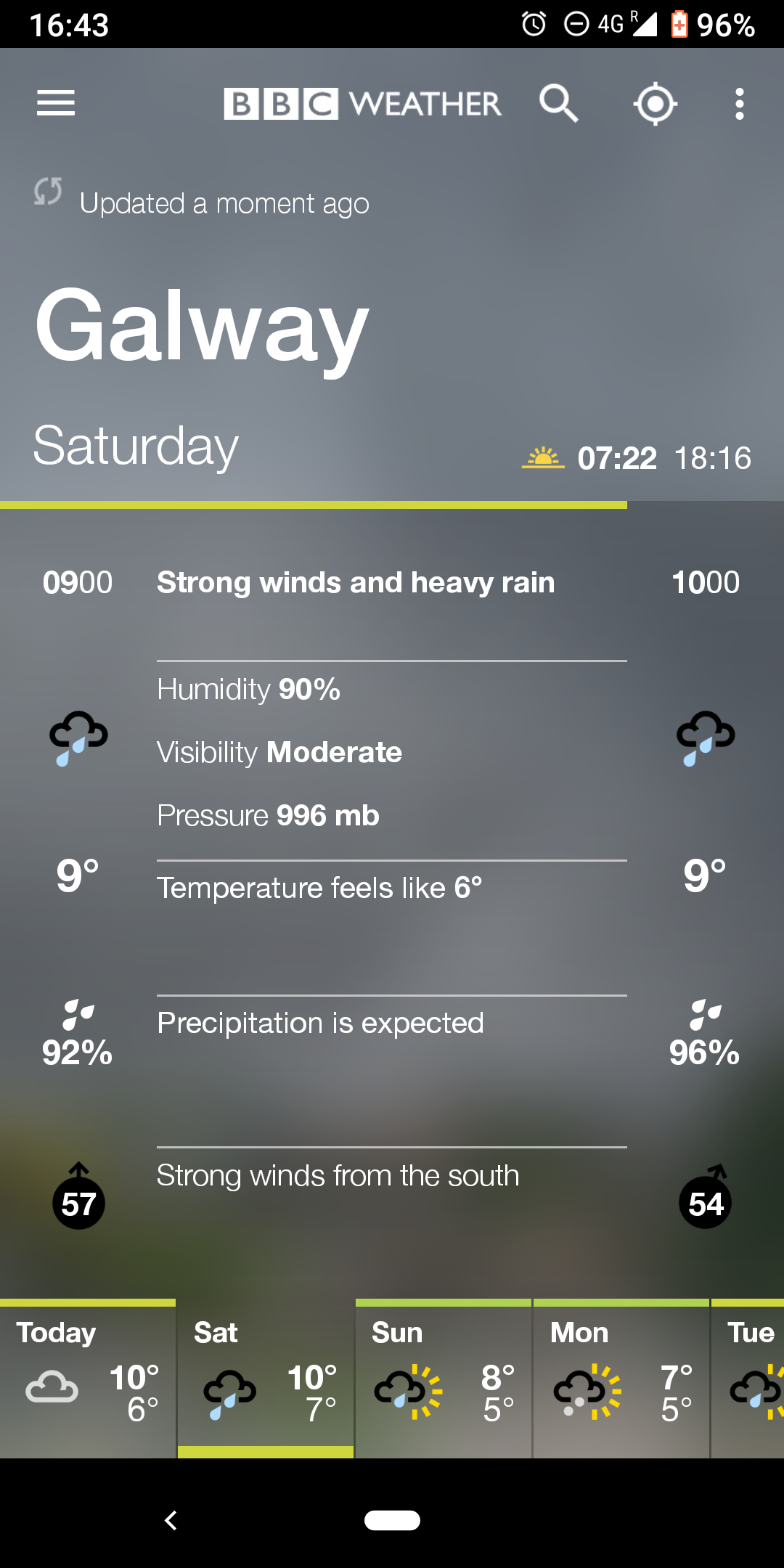We also debate, at length, Saturday morning. I’ve packed my running kit, taking up a good 25% of my luggage, and have been very much looking forward to turning up for Knocknacarra parkrun on Saturday morning. Indeed, part of the reason Helen chose Galway for my present was due to the proximity of a parkrun - she knows how much I like doing the tourism thing, ticking off boxes. But, well, the local weather has been shocking for a couple of days and is still pissing down while we eat pie. What’s more, the forecast for Saturday is absolutely dreadful: an essentially 100% chance of rain and ~60mph winds. It’s going to be a crazy muddy windy wet difficult run. The venue is 5-6km away from the hotel with reasonable public transport to get there but not to get back, especially if I’m covered in mud, which also would be bad to traipse into the hotel. Regrettably, I’m forced to conclude that parkrun is not happening. Bah!