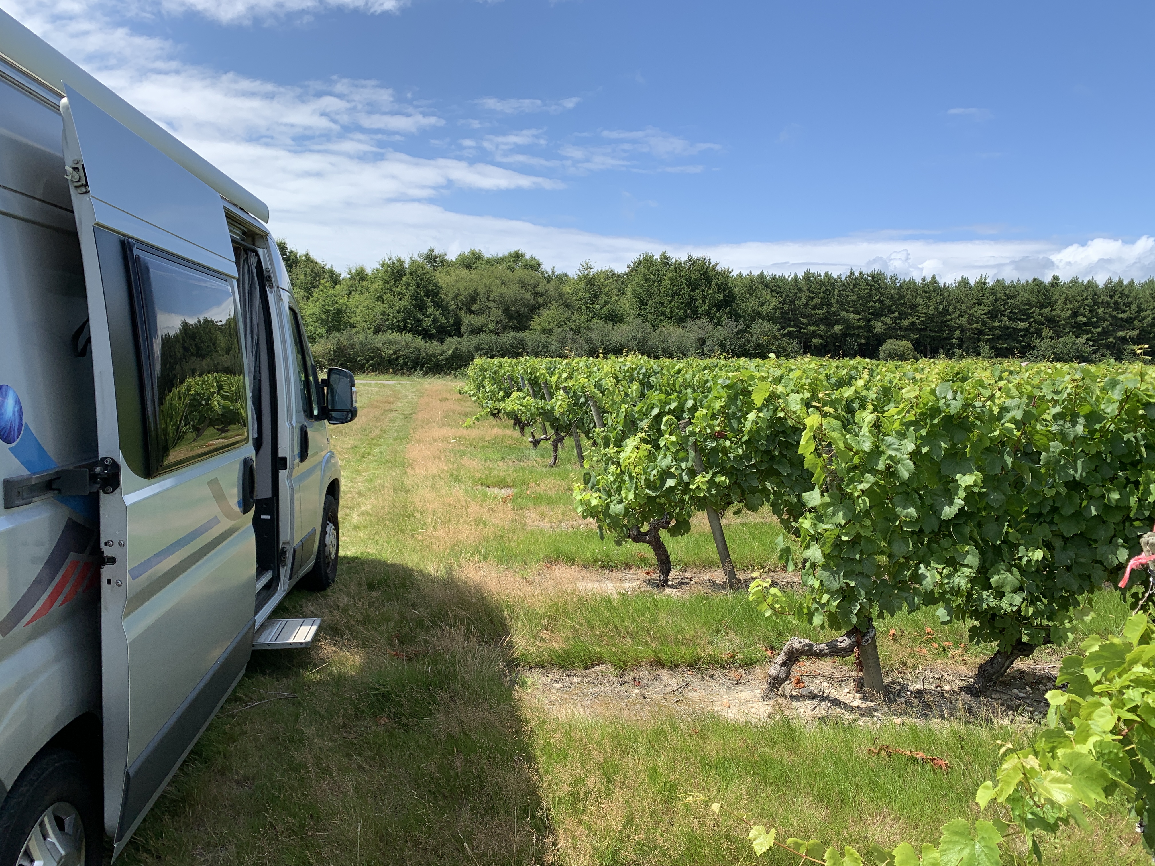 Terug bij onze Roady, lunchen we en daarna rijden we naar een France Passionplaats in Bourgneuf en Retz. Een prachtig plekje tussen de wijnranken. Heerlijk rustig. We genieten heerlijk met een boek in de zon.