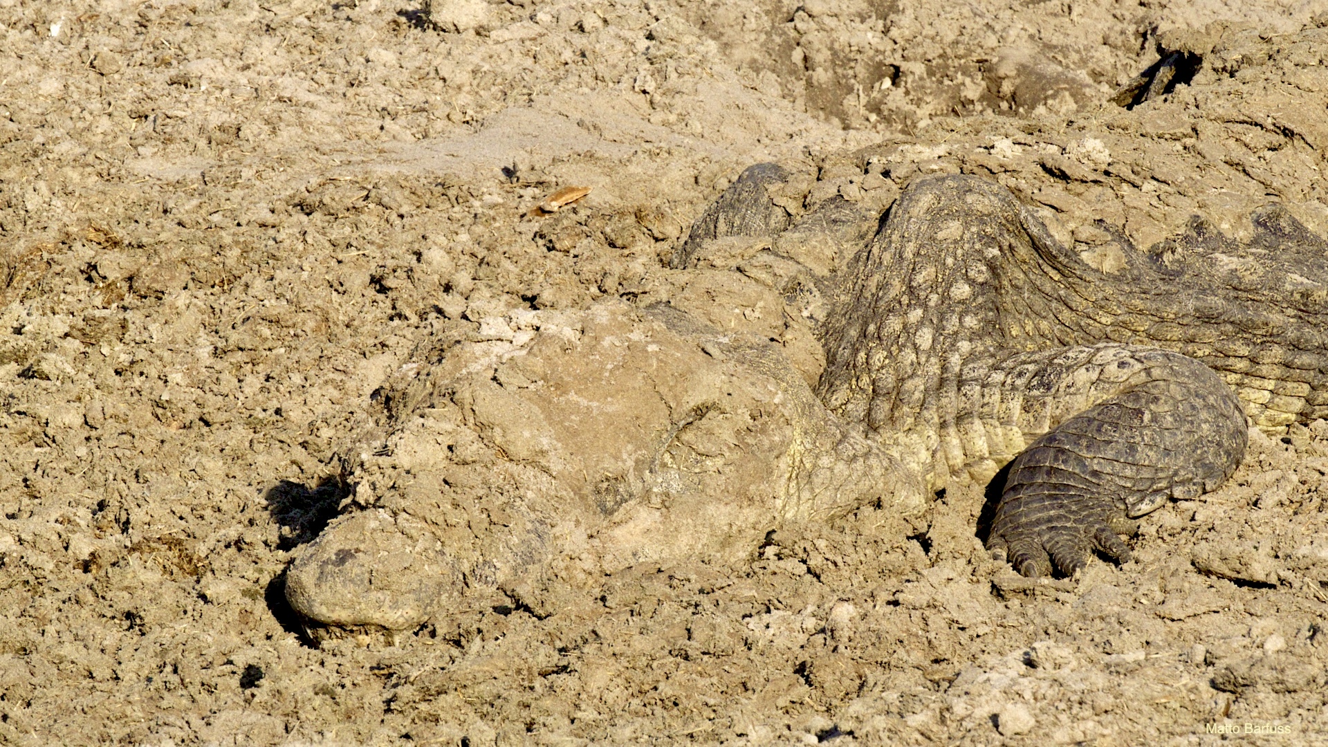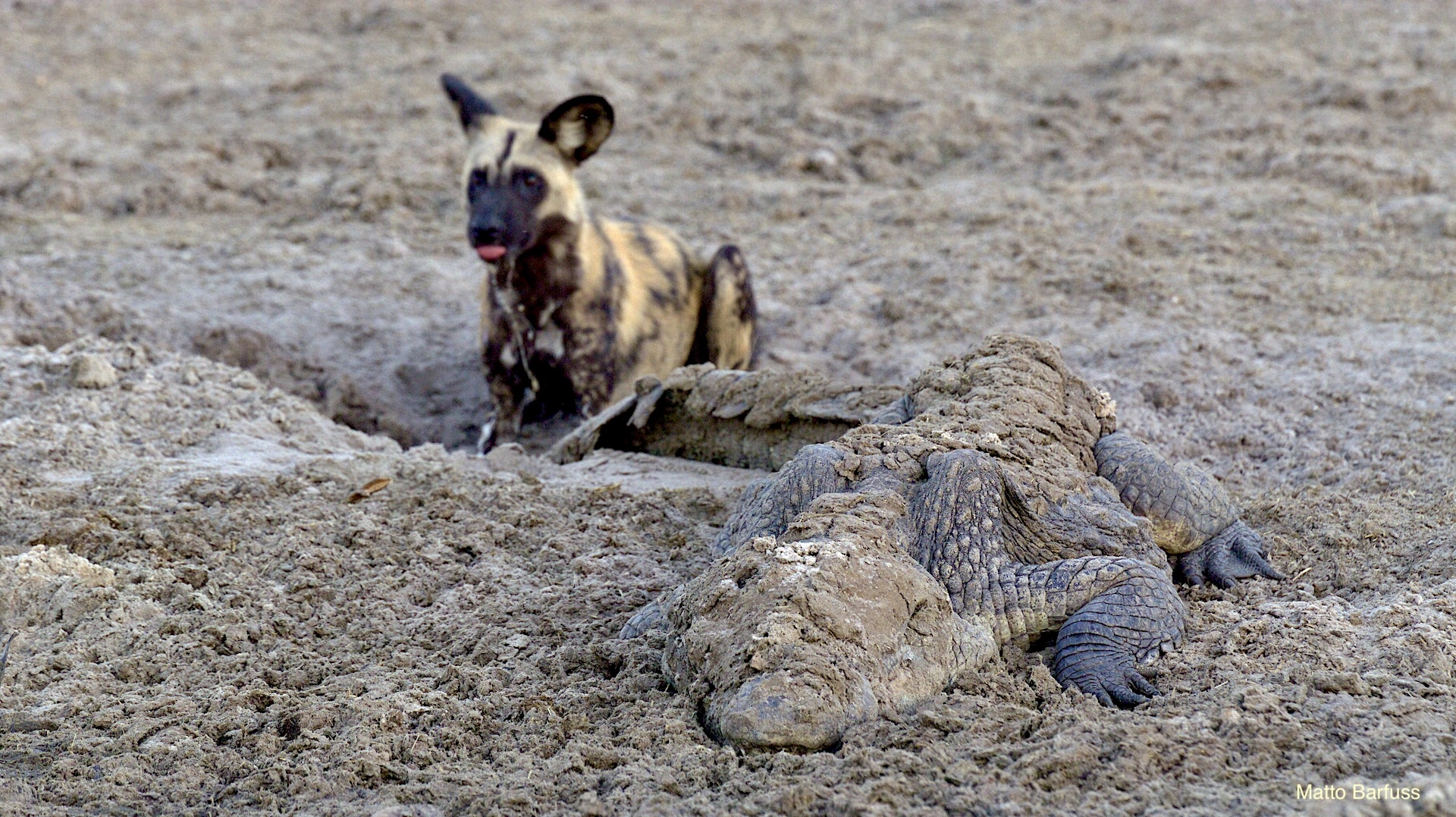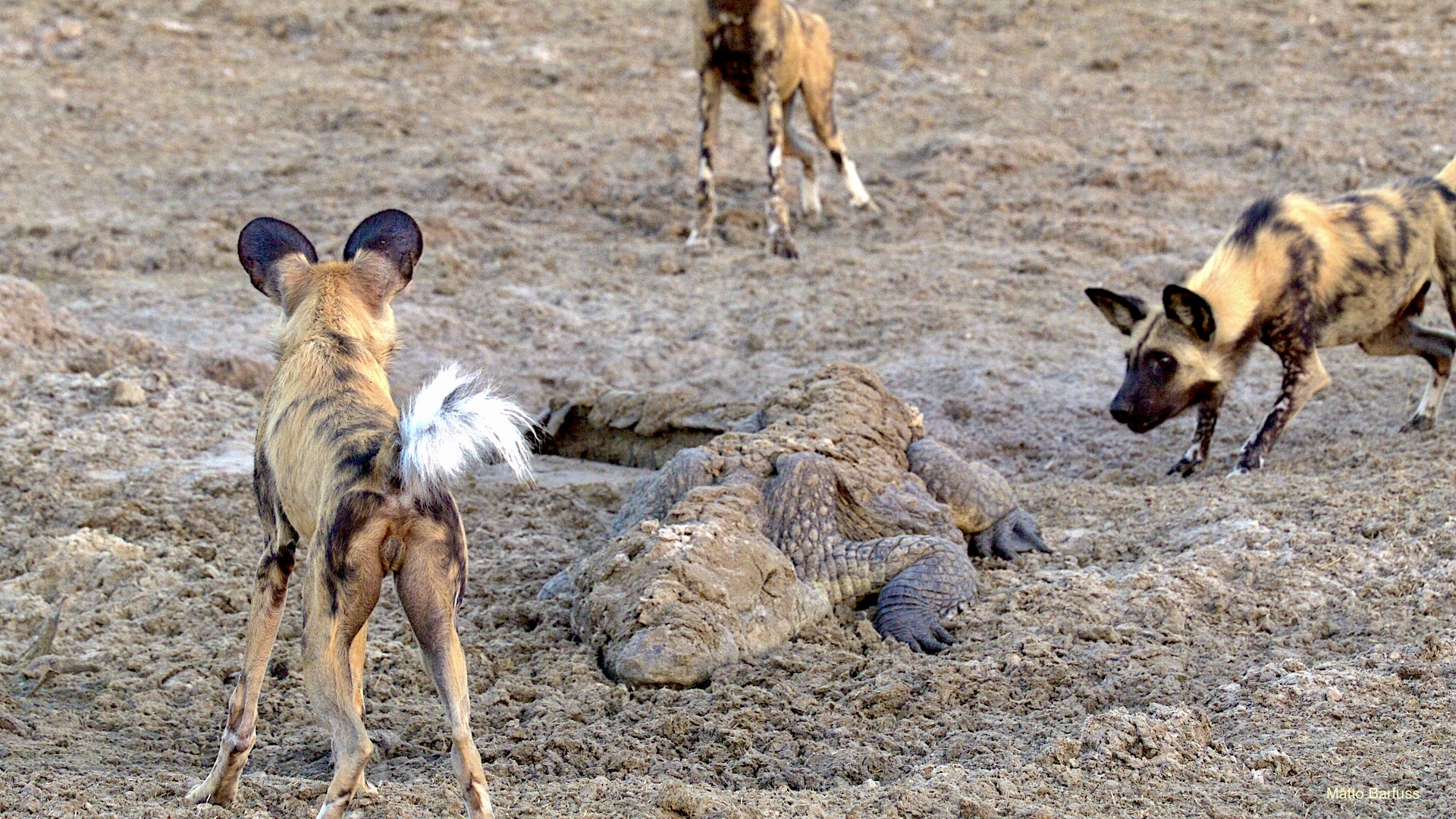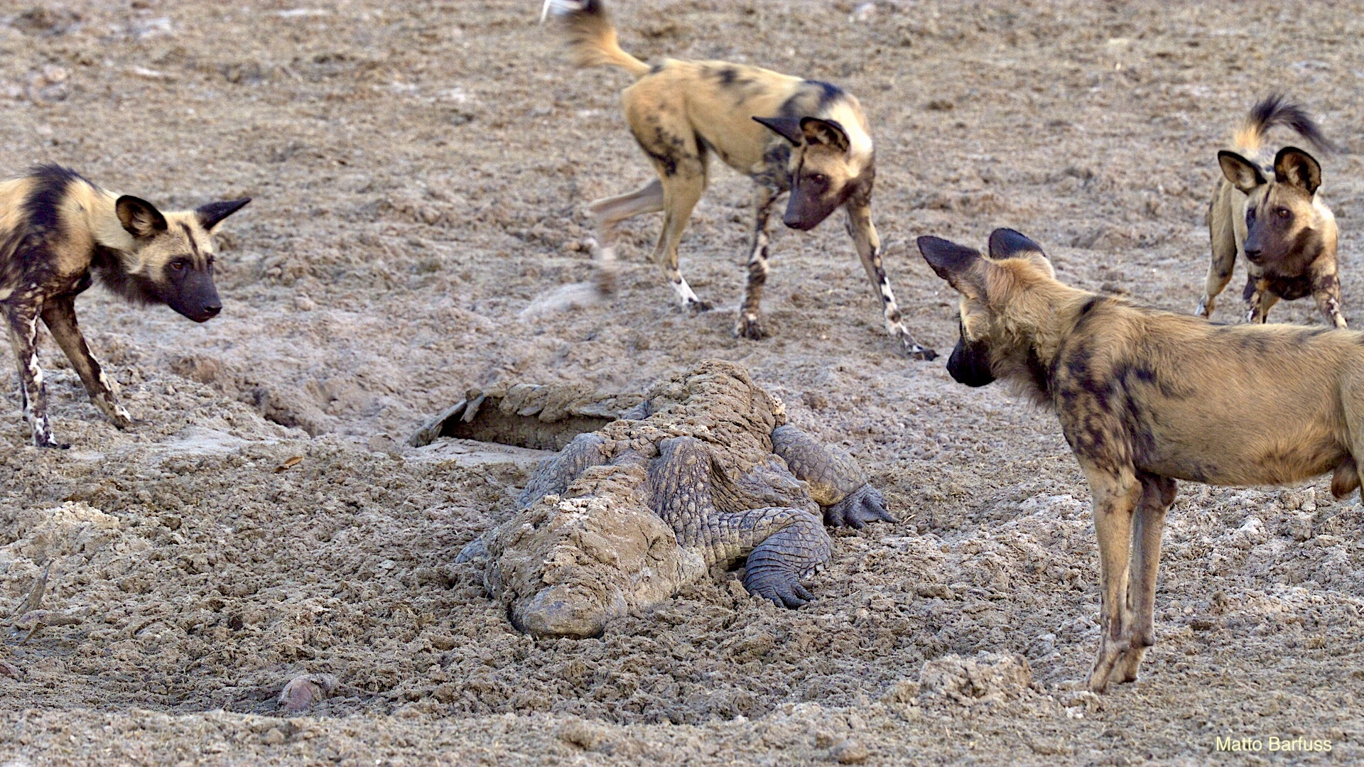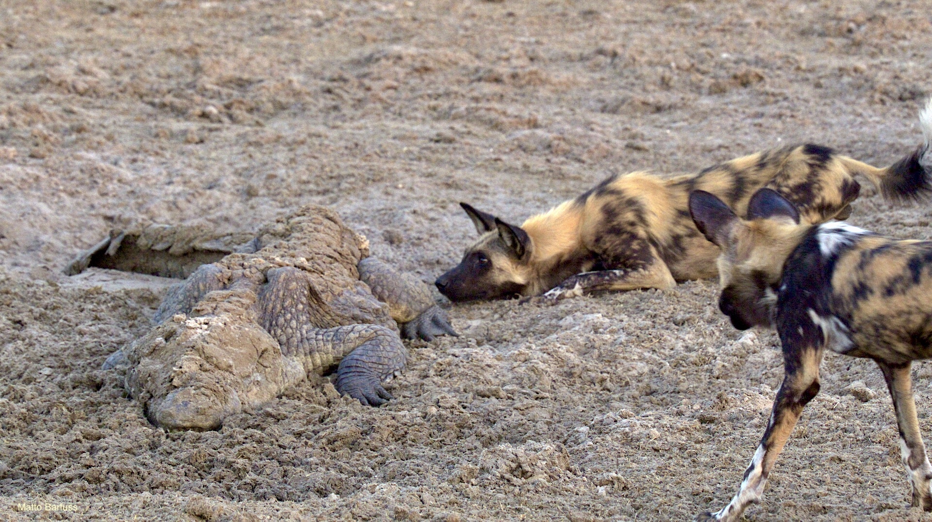 Dieses Krokodil hat schlicht seinen Tümpel an ‚Sonne&Hitze‘ verloren. Kein Problem. Das Krokodil „fährt sein System runter“ und wartet auf bessere Zeiten. Komisch, meinen die Wildhunde. Das Krokodil jedenfalls findet es nicht lustig, von hungrigen Hunden angegafft zu werden.