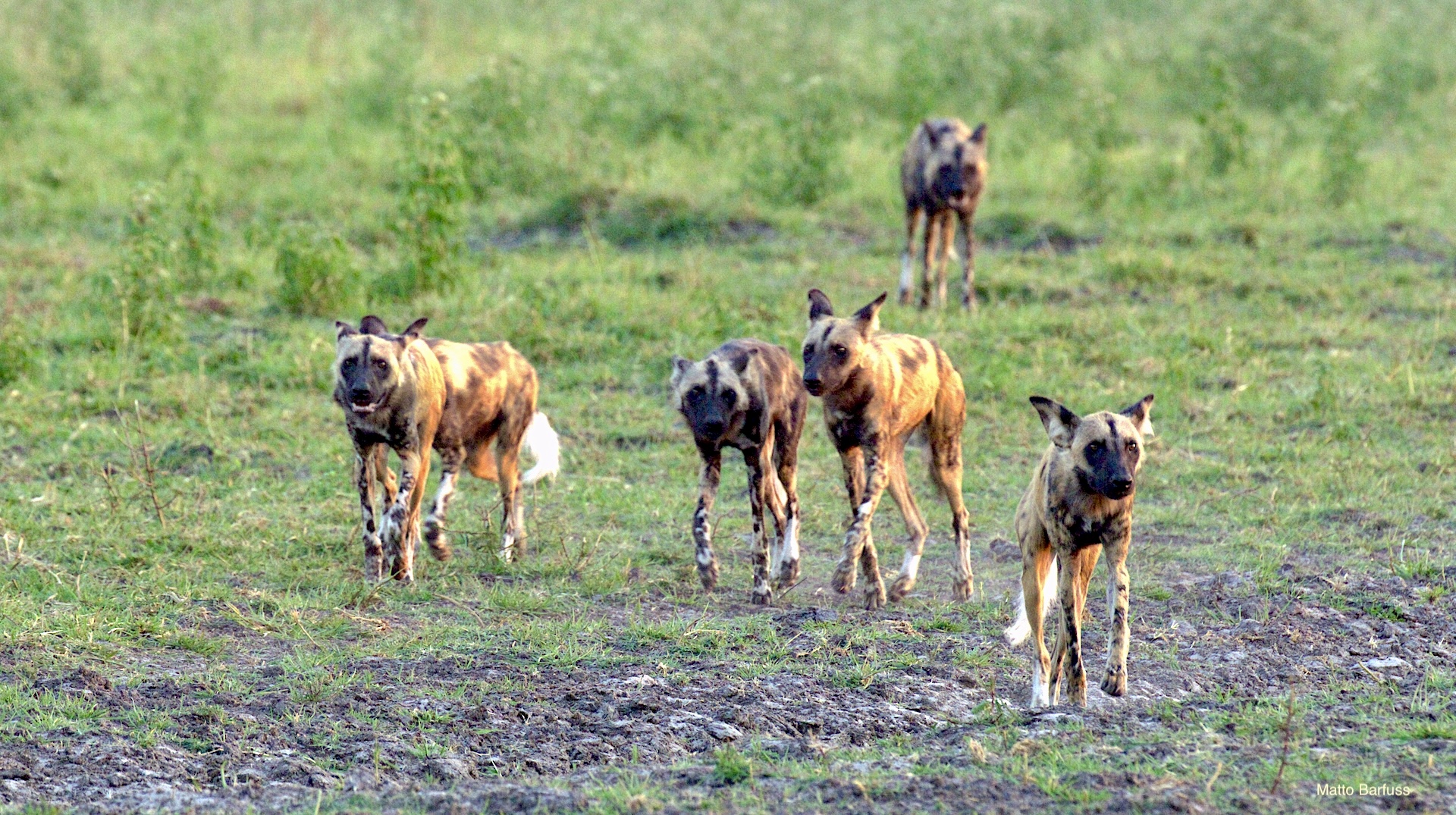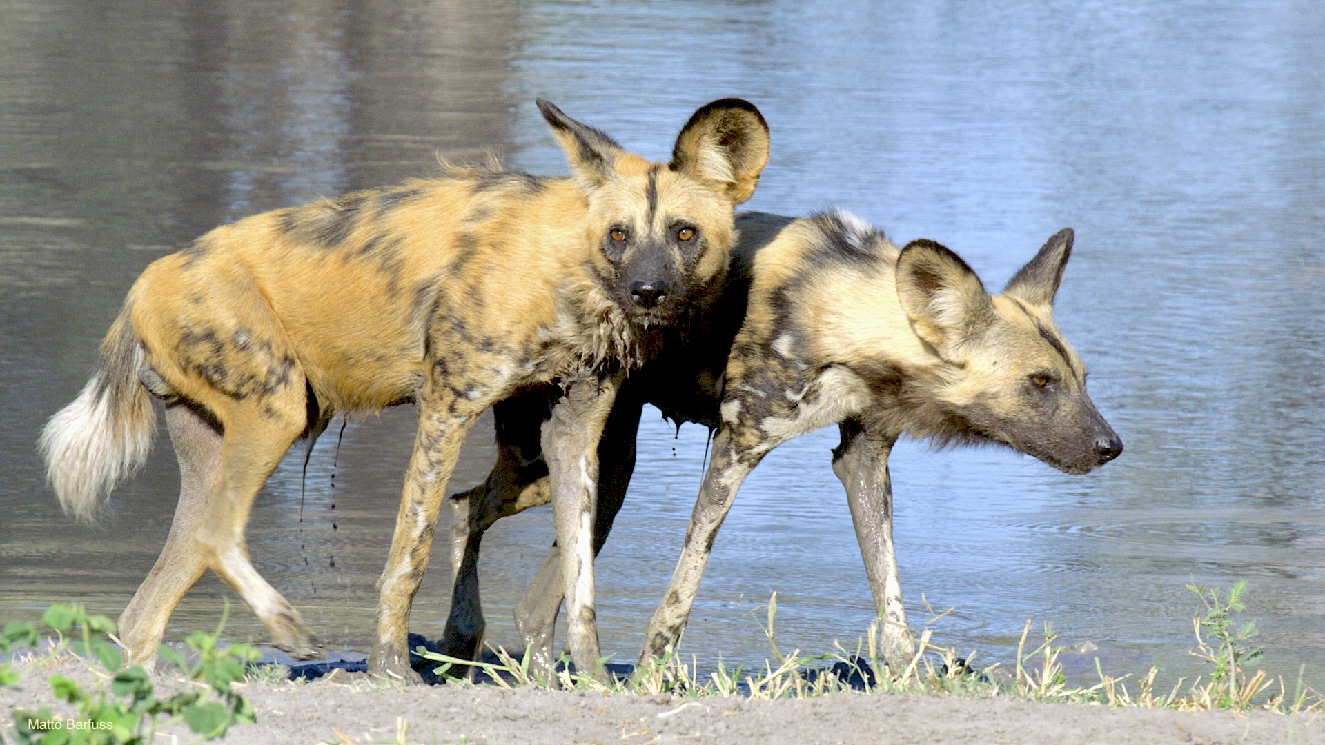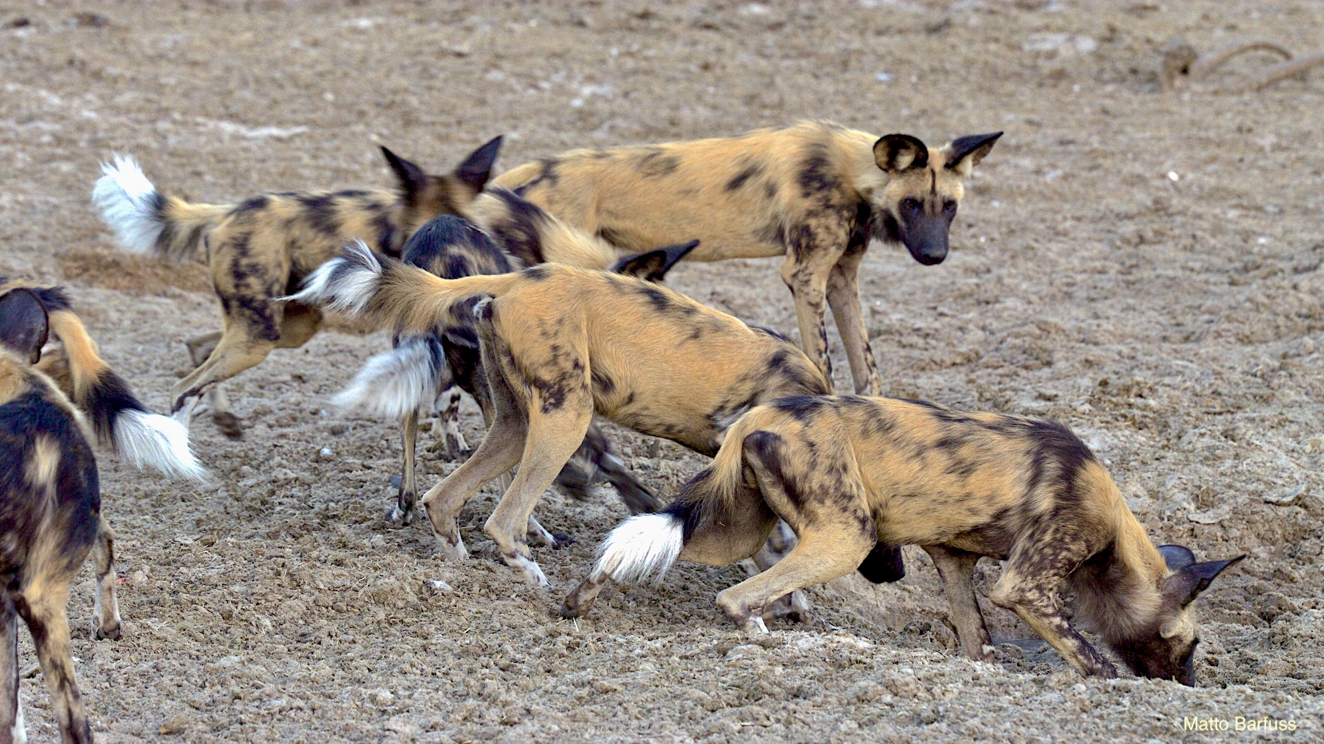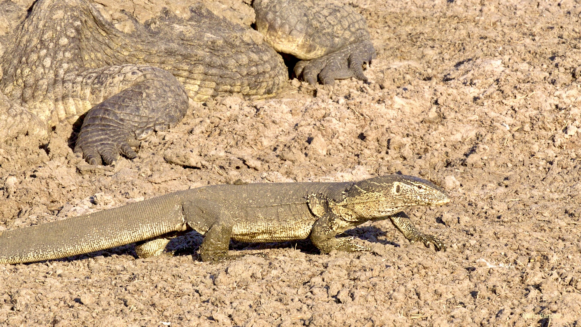 Dieses Krokodil hat schlicht seinen Tümpel an ‚Sonne&Hitze‘ verloren. Kein Problem. Das Krokodil „fährt sein System runter“ und wartet auf bessere Zeiten. Komisch, meinen die Wildhunde. Das Krokodil jedenfalls findet es nicht lustig, von hungrigen Hunden angegafft zu werden.