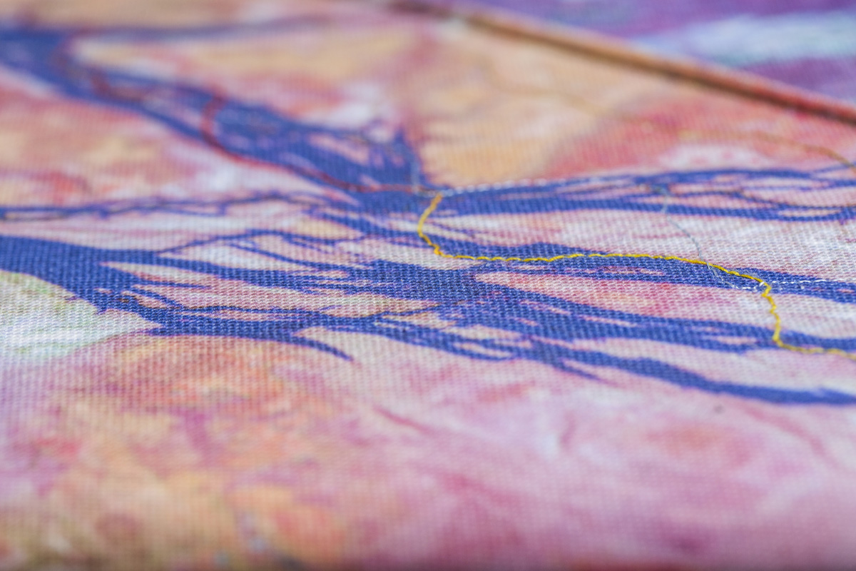 The plinth documents a decade of rainfall and fractional cover data, derived from the false colour landsat 8 satellite images that make up the seat. The same fractional cover data is visualised in embroidery on the seat.