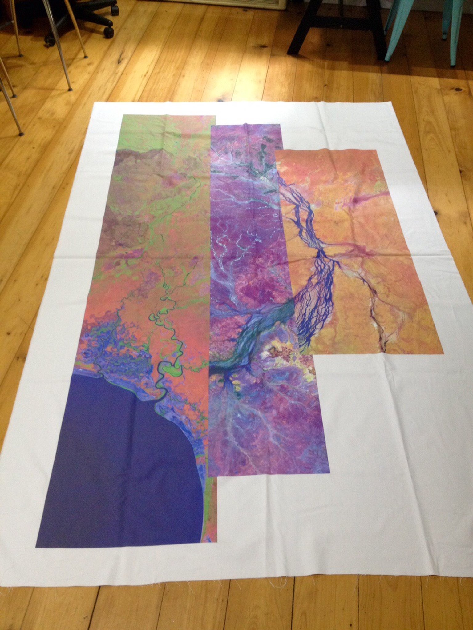 I was very intrigued by the possibilities in the use of the non visible spectrum in visualising the landscape, and the aerial viewpoint of these images, in contrast to the majority of western landscape traditions. As a result of these initial ideas, I spent some time exploring the possibility of painting landscapes from these images.