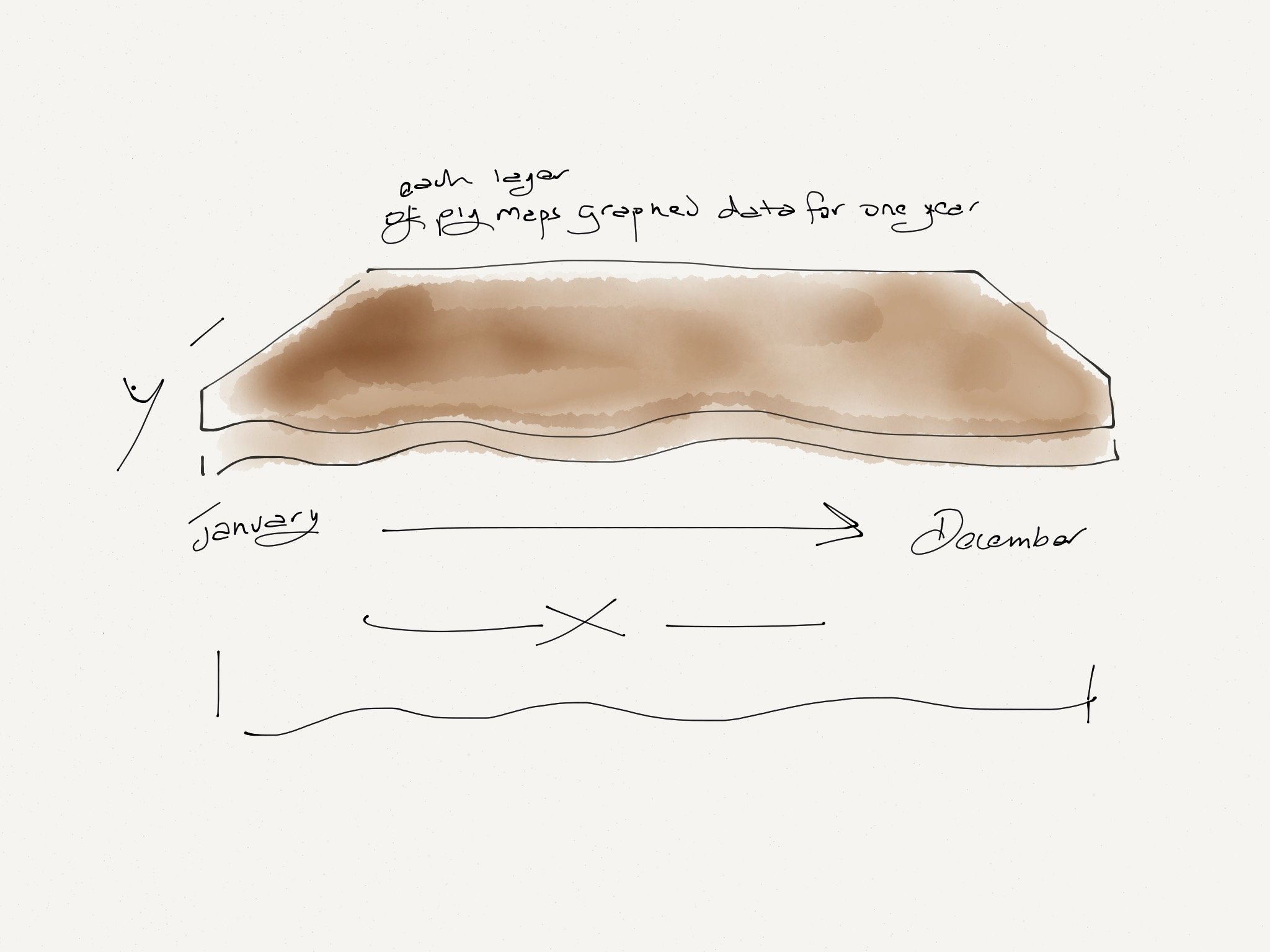 In turn, each set has four layers, showing the percentages of bare ground, dry vegetation, green vegetation and rainfall throughout the year. The three sides of the plinth show the data layers from a location on one of the images. The different patterns in these different landscapes are clearly visible throughout the year and over the decade. These create different landscape-like forms, with the histogram formed the corners of the plinth. This references the urban landscape, and records both the 31st of December (lhs) and first of January (rhs) data for every year.