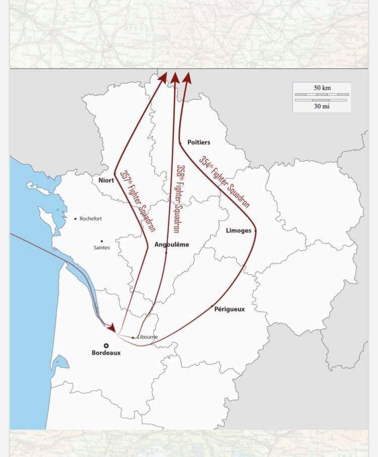 On June 7, 1944, activity remained just as intense as the previous day for all the American fighter pilots who were once again departing for two consecutive missions in one day. Lieutenant Colonel Raymond B. Myers led the 358th Fighter Squadron, Lieutenant Colonel Clairborne H. Kinnard Jr. was assigned to the 354th Fighter Squadron, and Captain Carl C. Colson was in charge of the 357th Squadron. David A. Donovan was on the Yellow Patrol. The three squadrons flew in separate areas from morning until early afternoon. The 358th Fighter Squadron's objective was to bomb targets in the vicinity of the town of Évreux, near Rouen, a mission that lasted from 05:05 to 08:00. Nearly thirty-five bombs were dropped. The American pilots, including David, mainly machine-gunned the roads of this sector, obviously keeping a lookout for any trucks, but also for all the positions that could contain German soldiers. Intense firepower from Flak guns was encountered over the yard in the town of Evreux, but all the aircraft managed to return safely to Steeple Morden Air Force Base. Nevertheless, June 7, 1944 was a dark day for the 355th Fighter Group, which recorded the loss of six pilots in the various squadrons.
