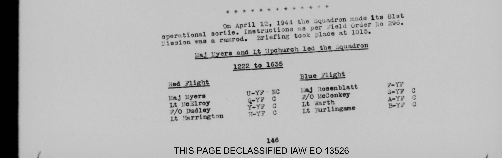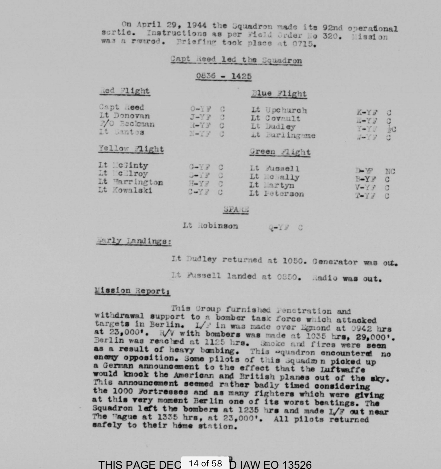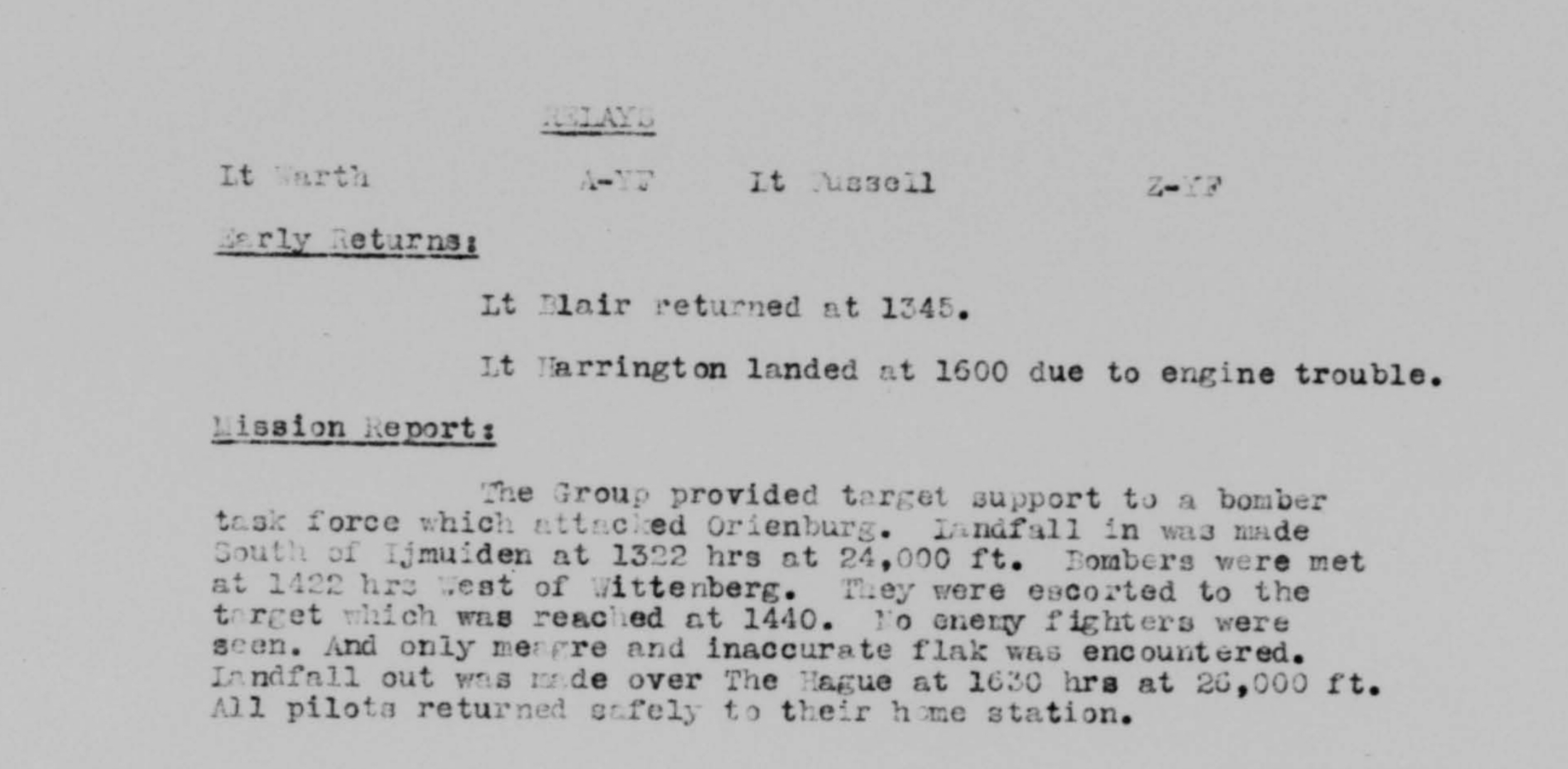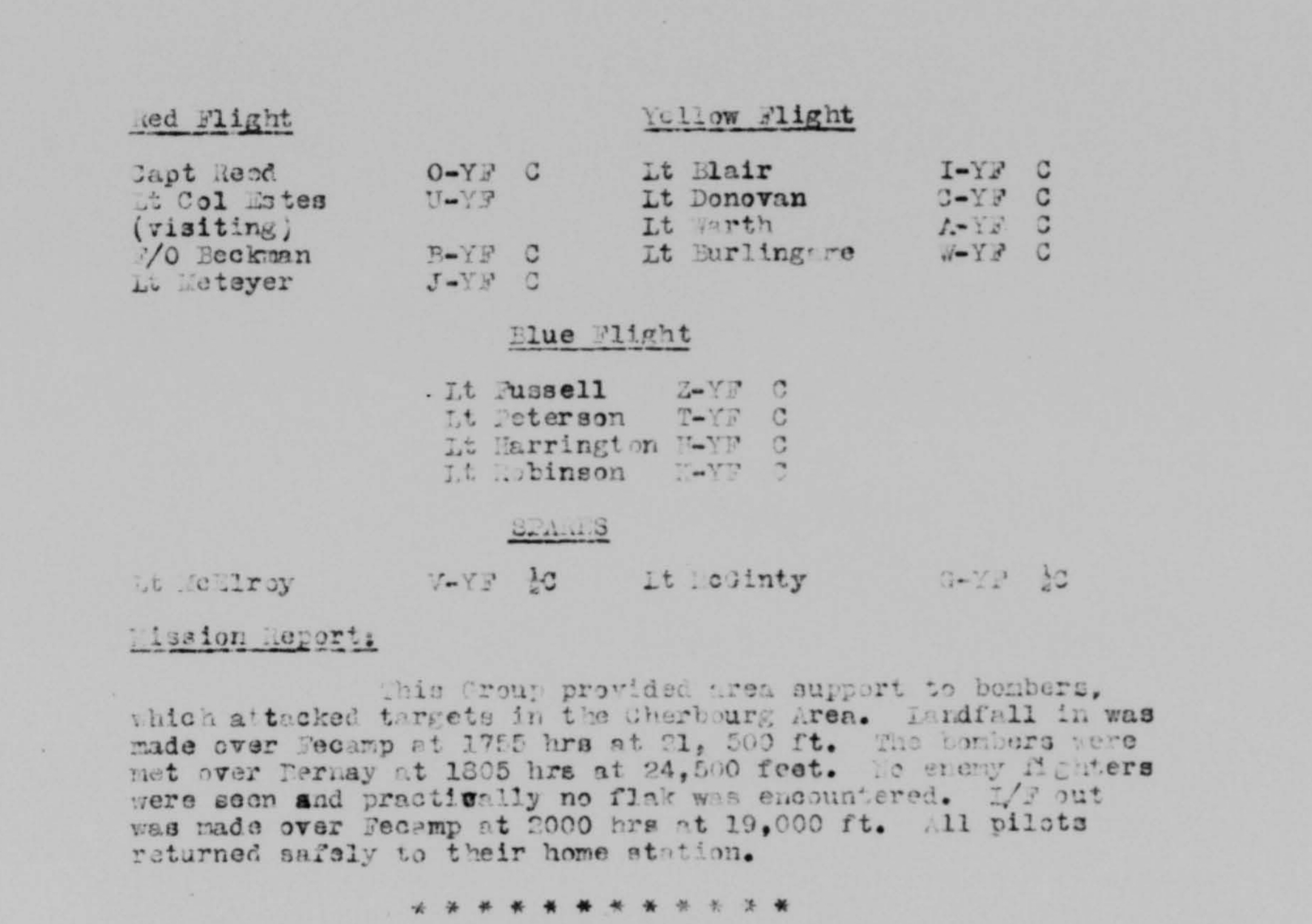 On June 8, 1944, at 14:24 (2:24 PM), Lt. Donovan, piloting aircraft YF-K “Mary-Joyce” #43-6879, took off from his air base Station F-122.