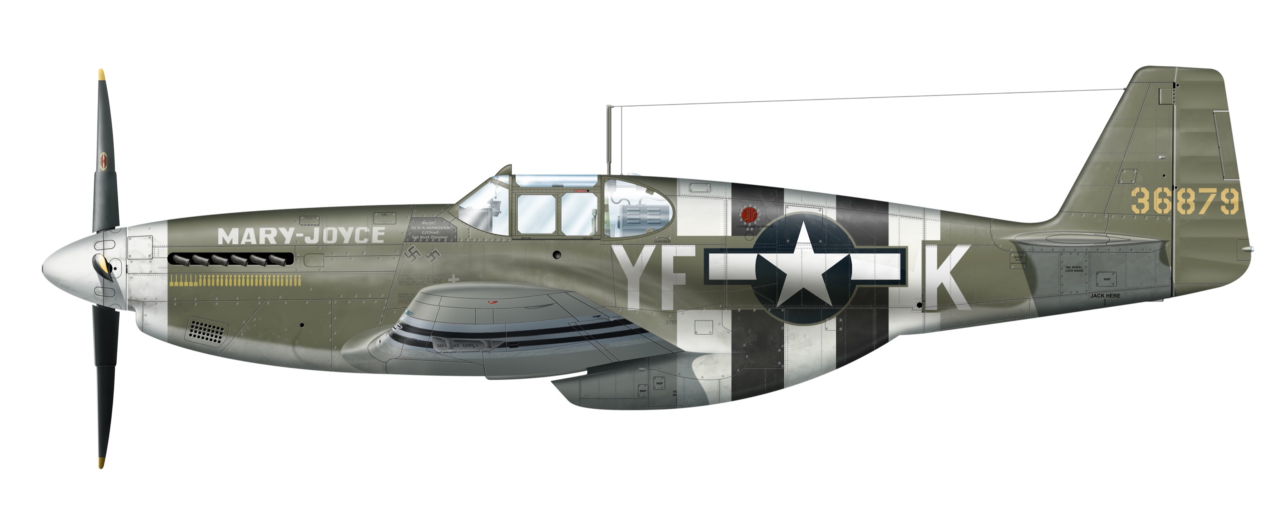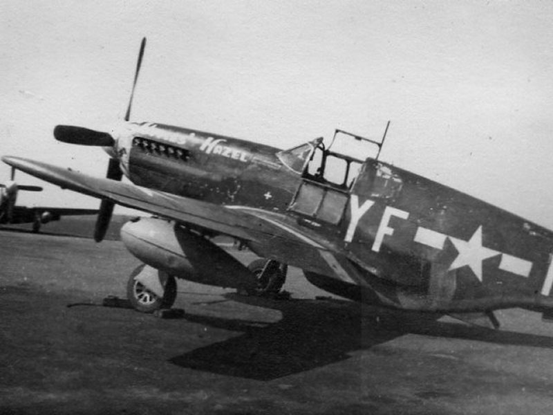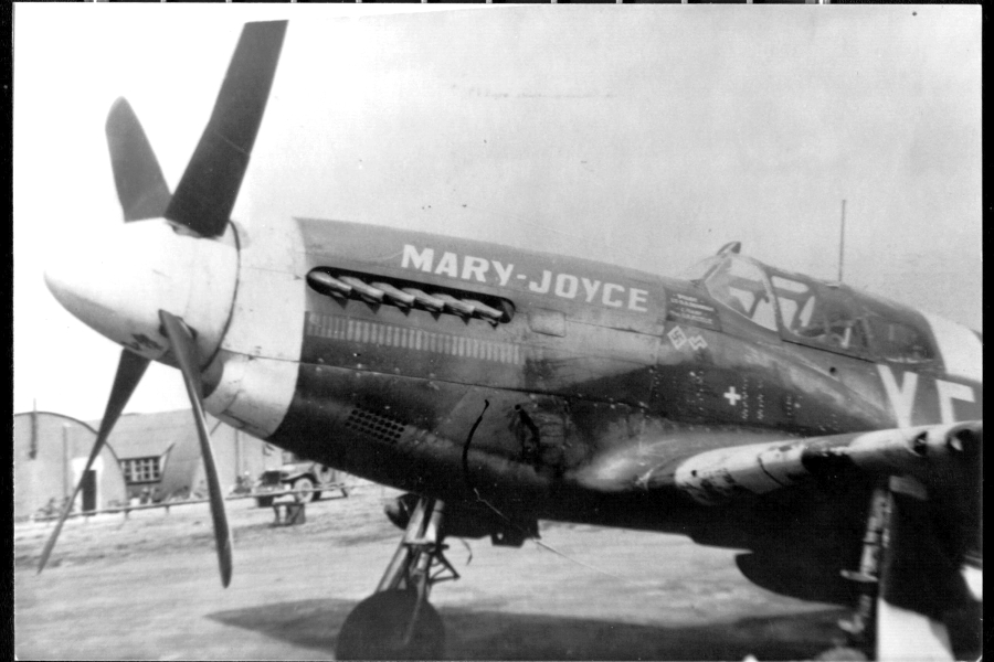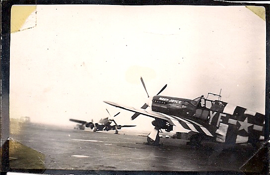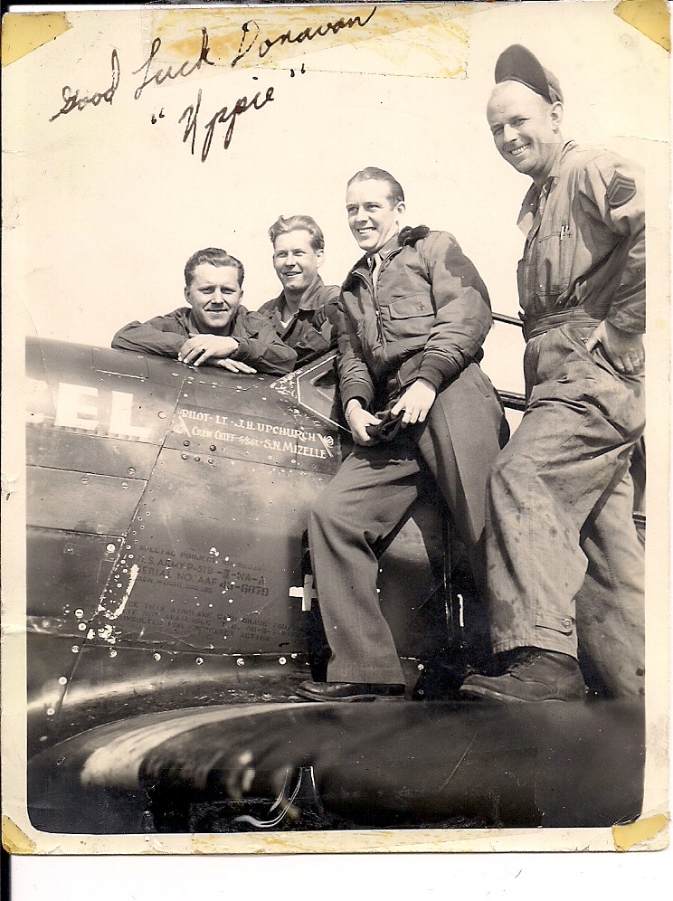 When the Mustang first arrived at Steeple Morden it was assigned to Captain James Upchurch of the 358th Fighter Squadron (YF) who named it “Uppie’s Hazel. Donovan would fly Uppie's Hazel on occasion as well as other Mustangs on various missions. On May 13, 1944 (twelve days after Mary Joyce’s first birthday) "Uppie's Hazel" became “Mary-Joyce”.