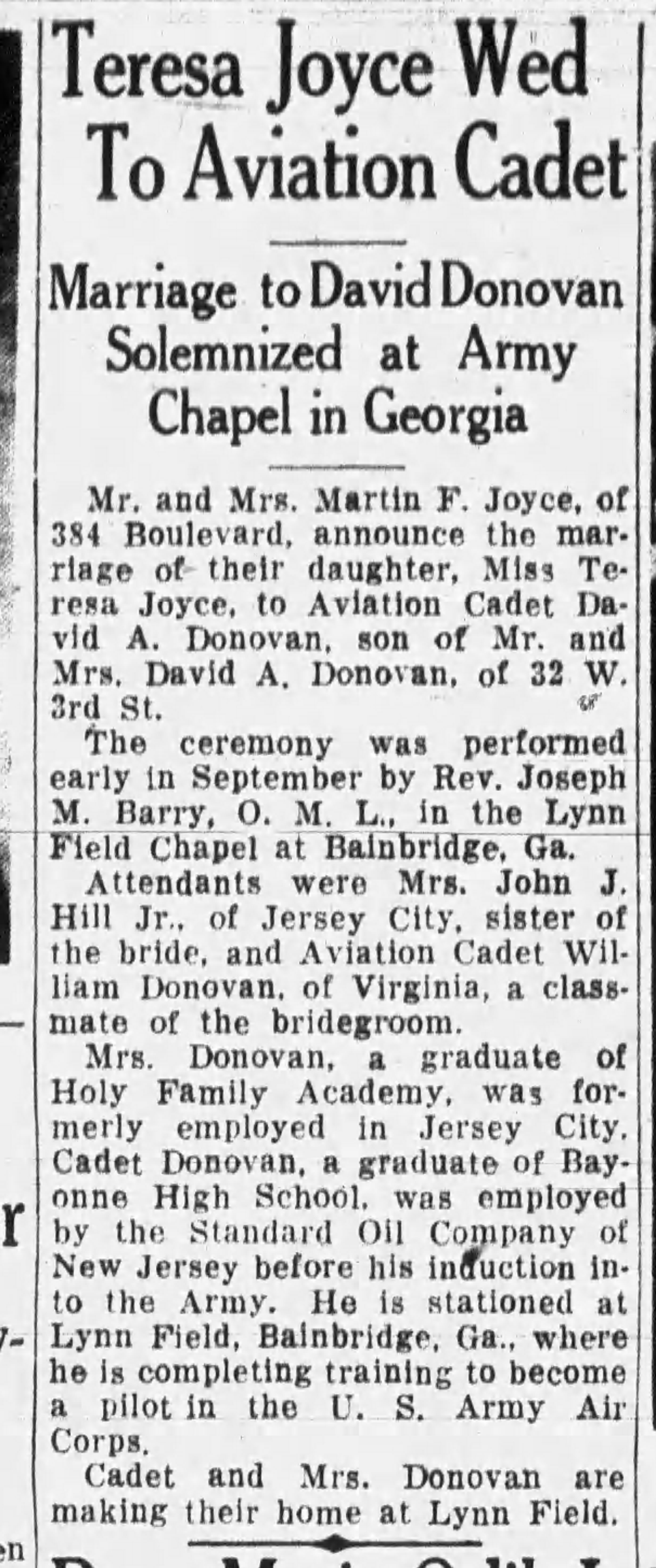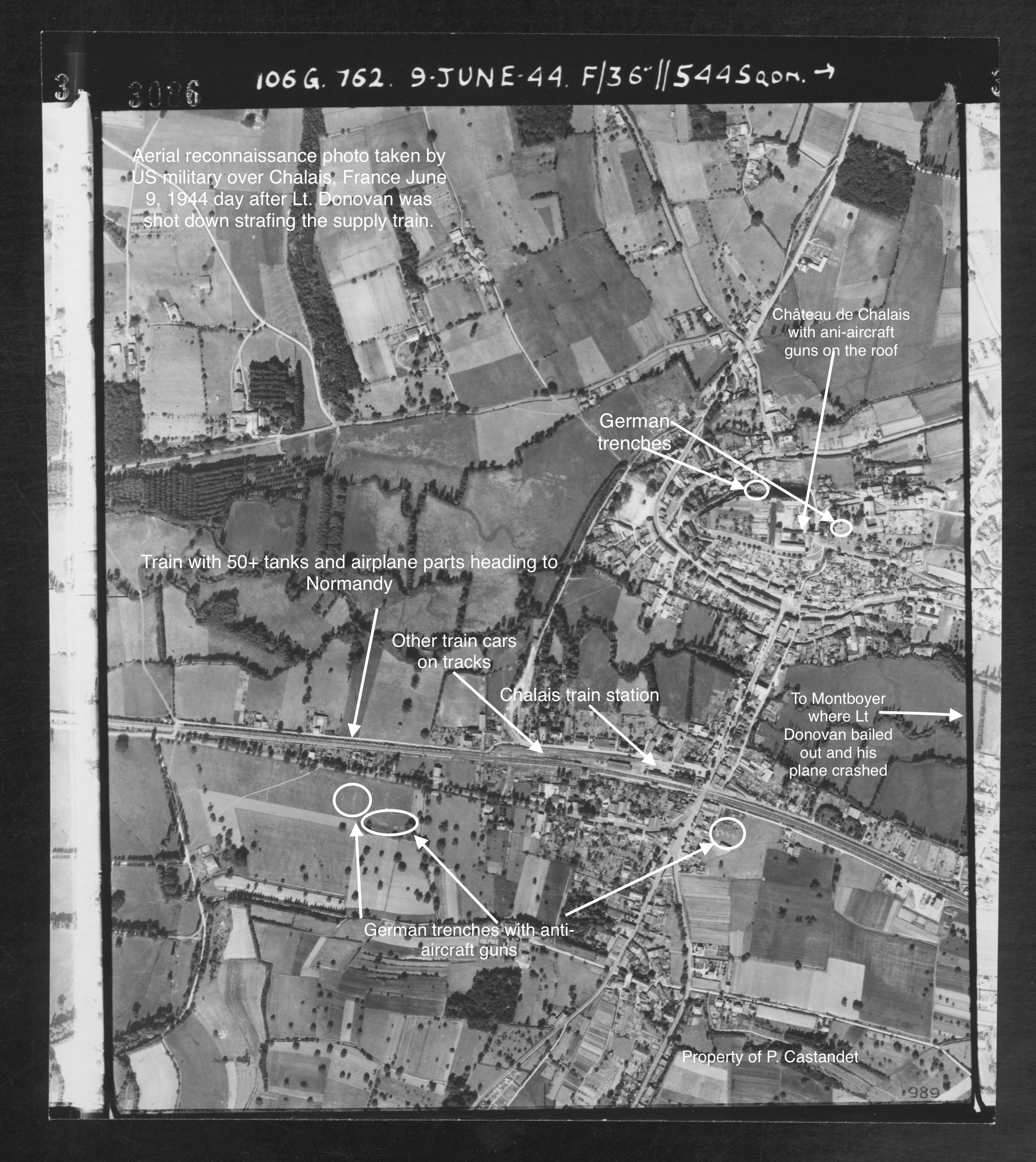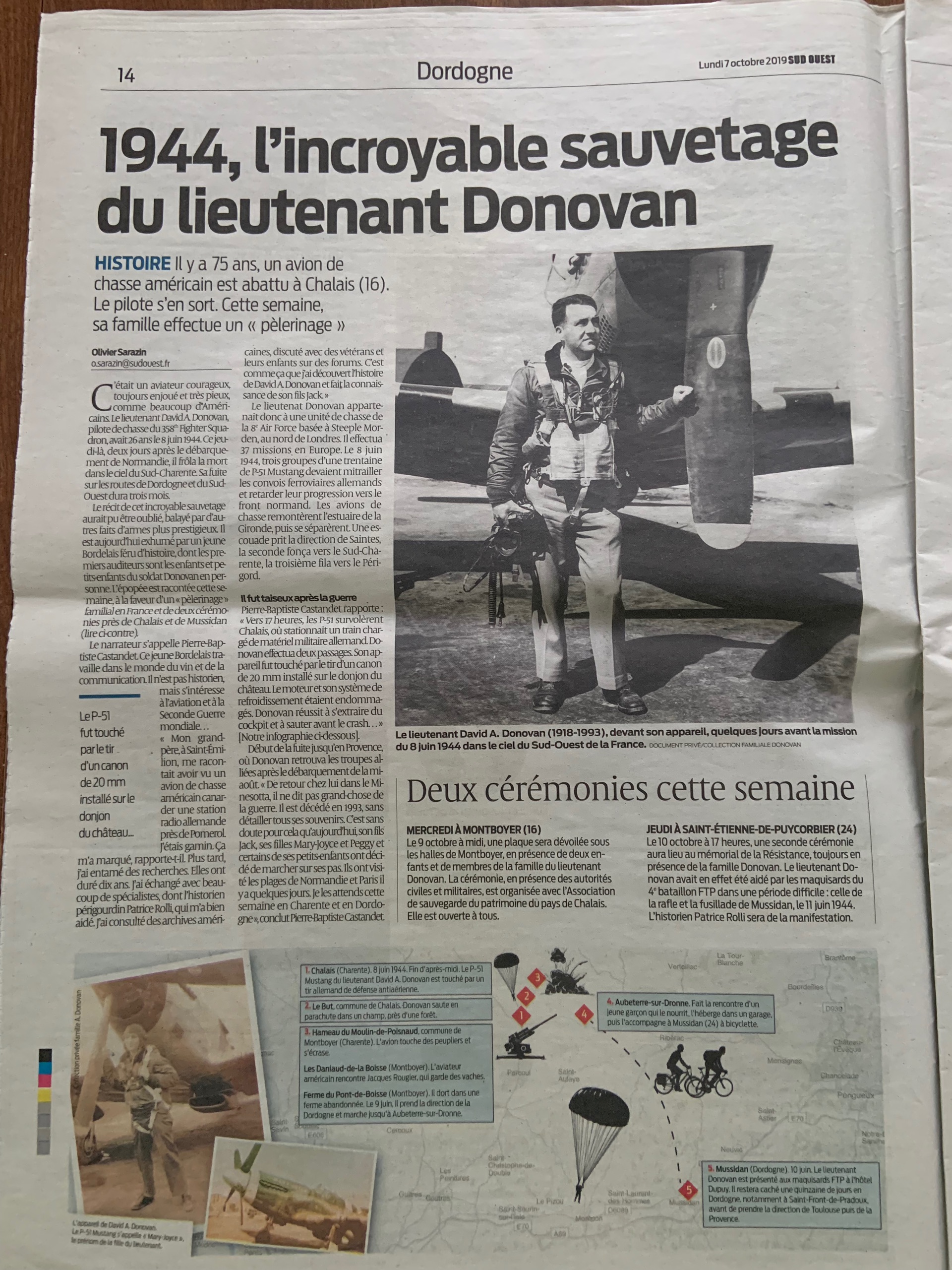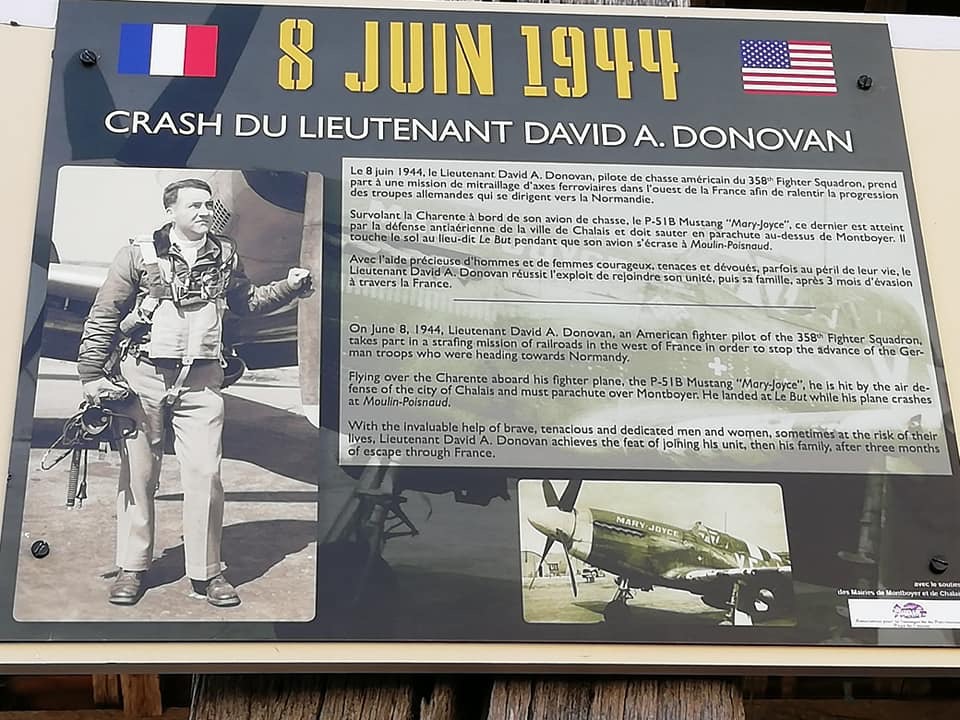On June 8, 1944, two days after D-Day my father, Lt. David A. Donovan, was shot down in his P-51B mustang while strafing a German military supply train that was heading towards Normandy. This took place above the small village of Chalais in the department of Charente 55 miles northeast of Bordeaux. The mission that day for the 355th Fighter Group was to disrupt communication's and to cut off the main line railroad to Normandy. When Lt. Donovan’s plane was hit, he knew he was in trouble. He had to get his mustang, named “Mary-Joyce” after his 13-month-old daughter back home in Bayonne, New Jersey, to a higher altitude to safety bail out.