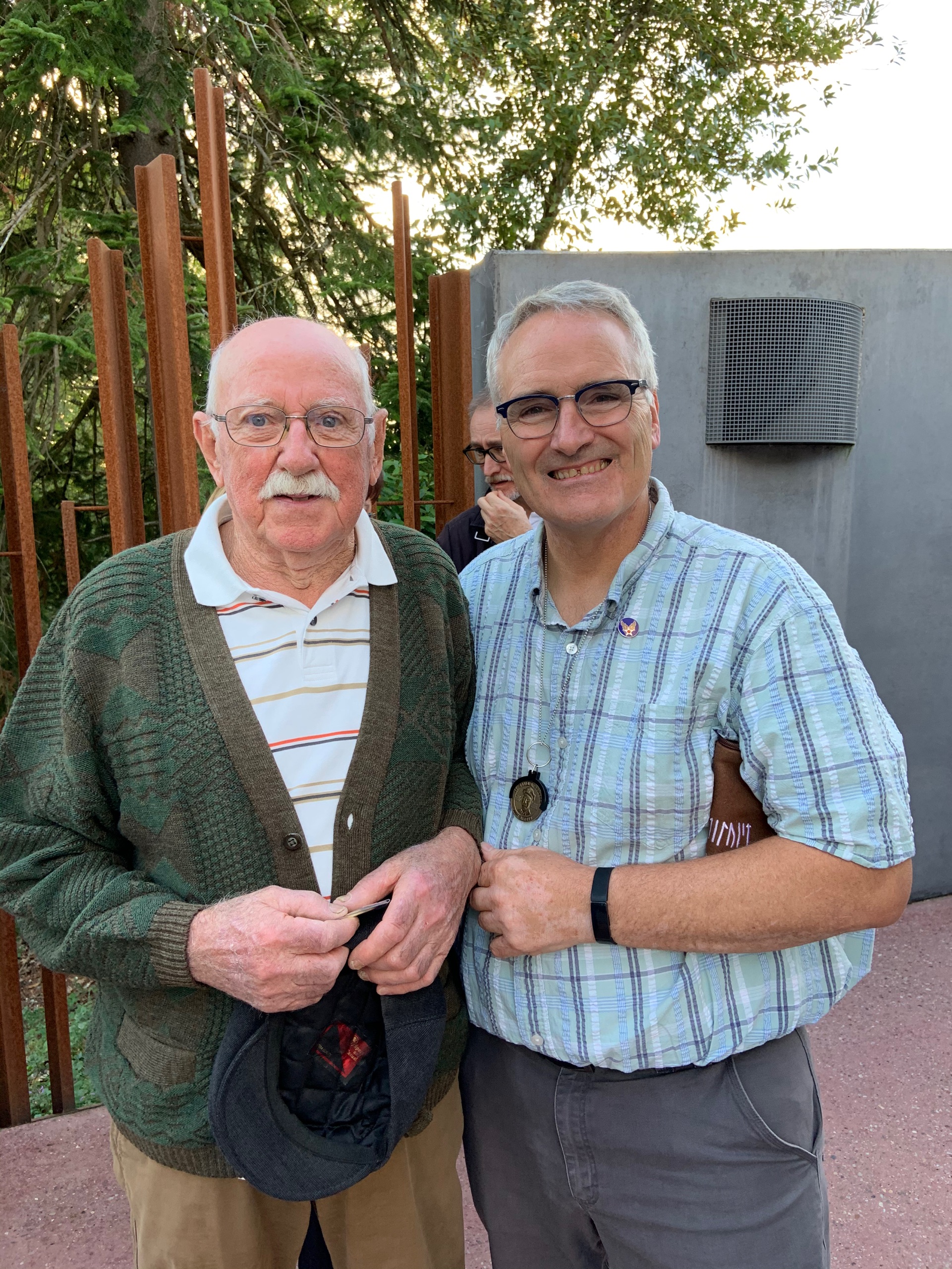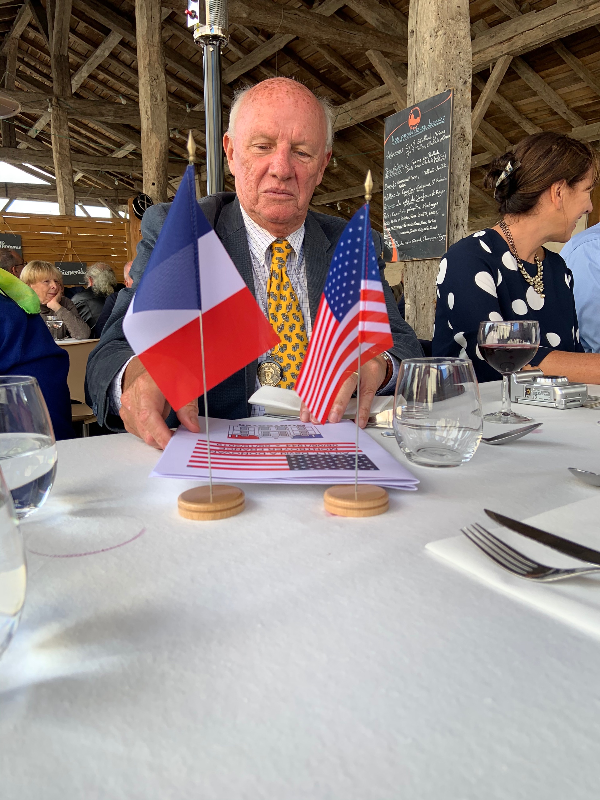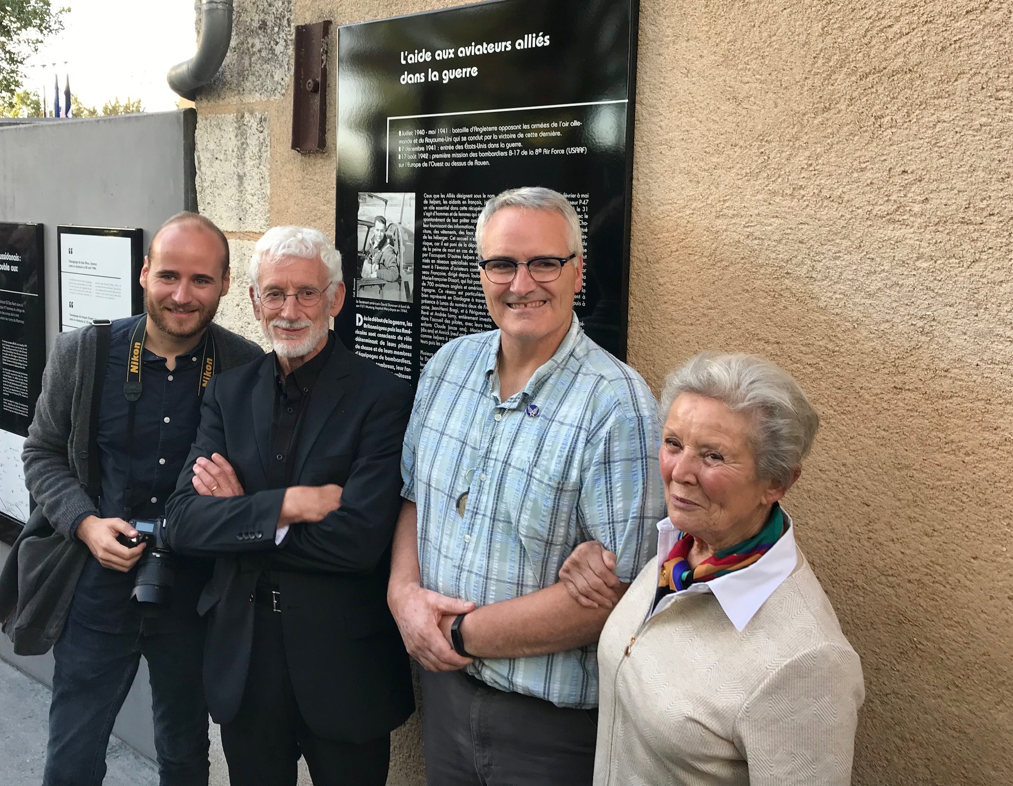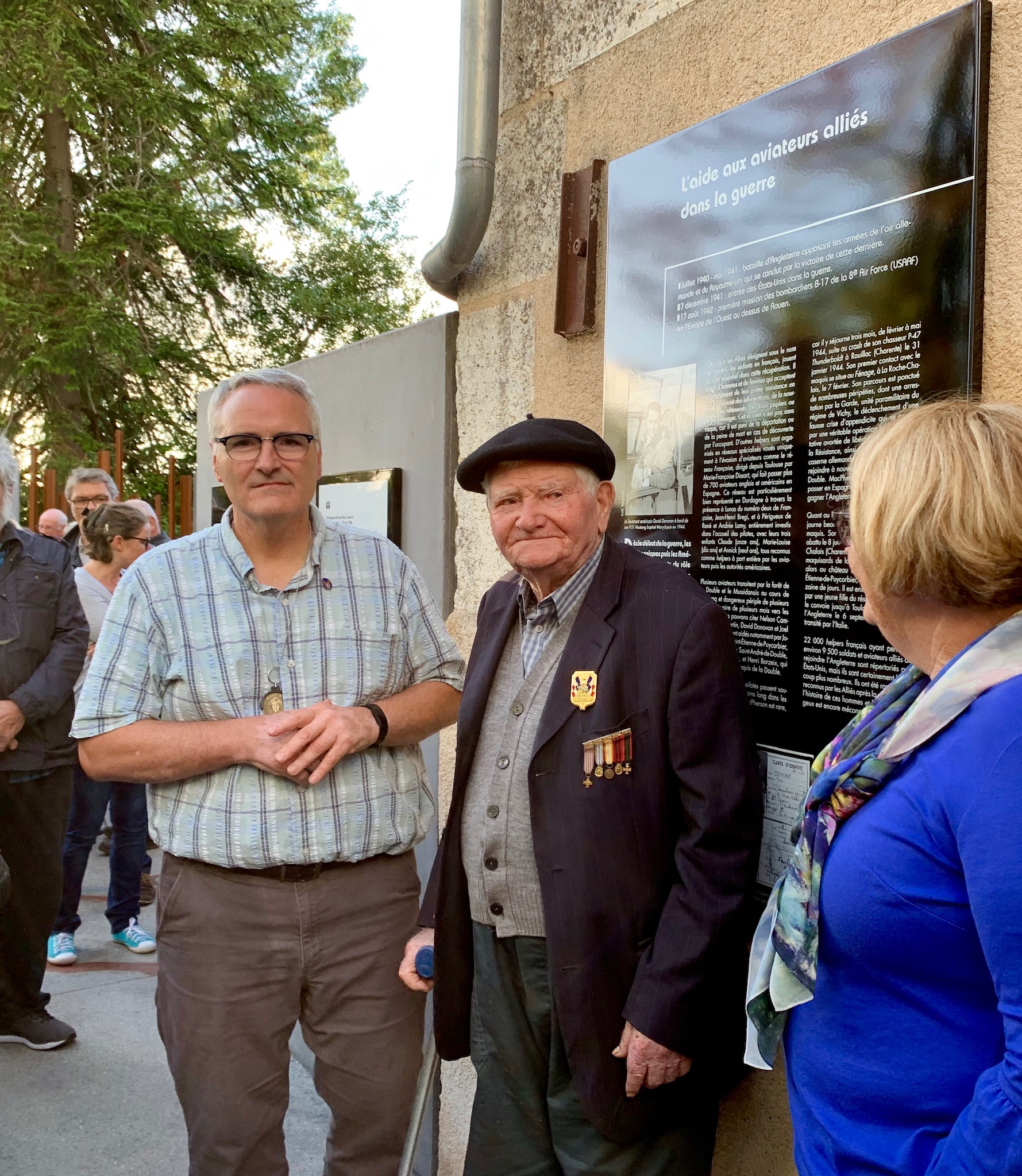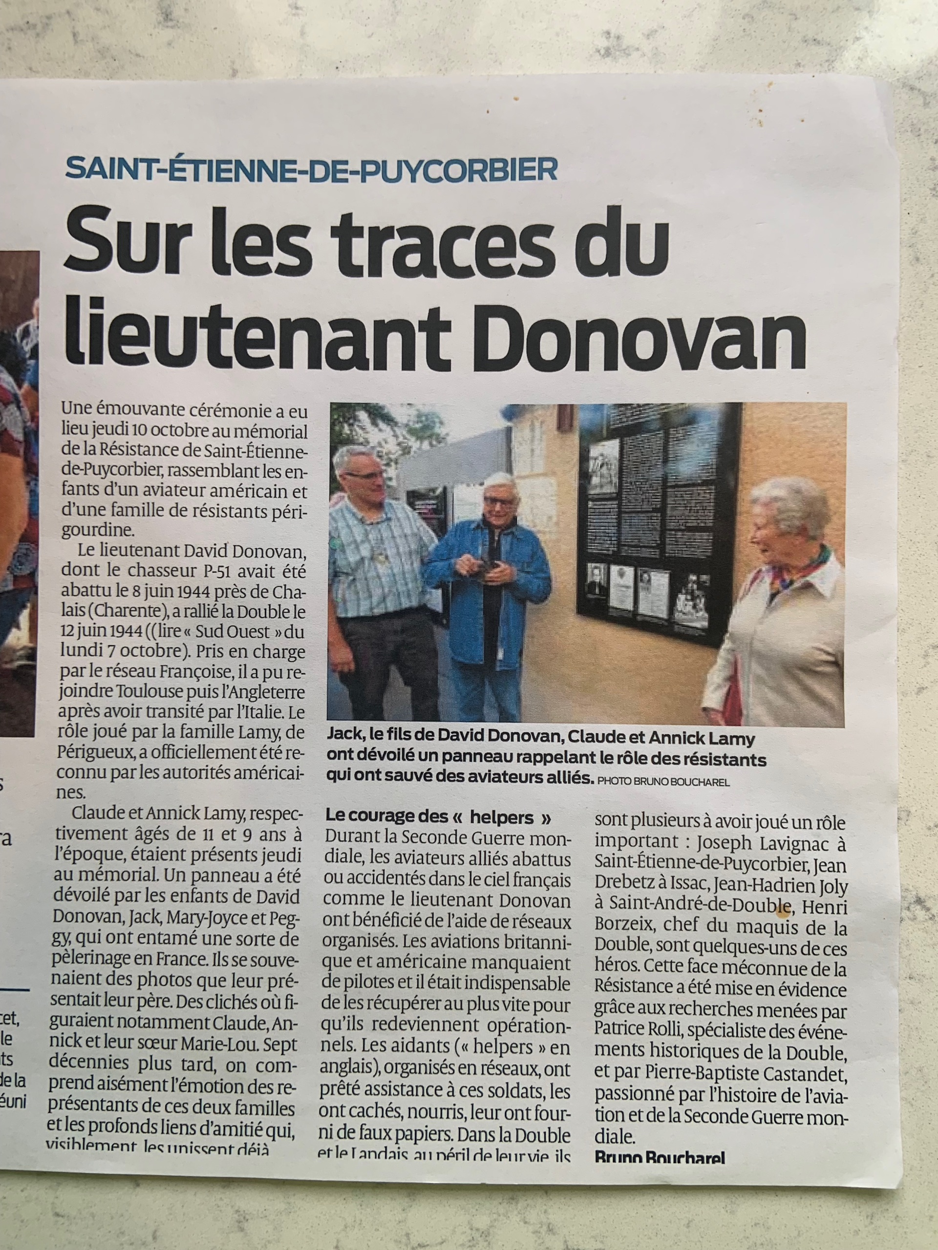 Monsieur Pichardie and his lovely wife came to the ceremony at the Memorial de la Resistance. It was Mme Pichardie that read in the newspaper that the family of David Donovan was coming to Mussidan and persuaded Michel to come and tell his story. He never told anyone until this day that Lt. Donovan stayed in their house for a short time. Michel’s father, Auguste was working for the Resistance and was friends with Yves Bouche. Their houses were very close in Saint-Front-de-Pradoux. Michel told me through an interpreter while his father, Auguste, was away doing work for the Resistance my father stayed with him and his younger sister. It was perhaps only a day or two. He said my dad even prepared meals for them. When my father left, he gave Michels’ sister a patch. It was pilots' wings.