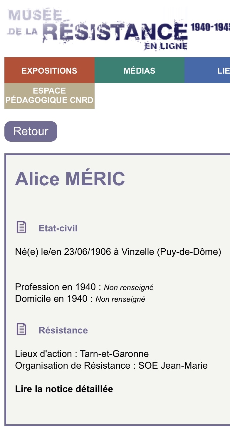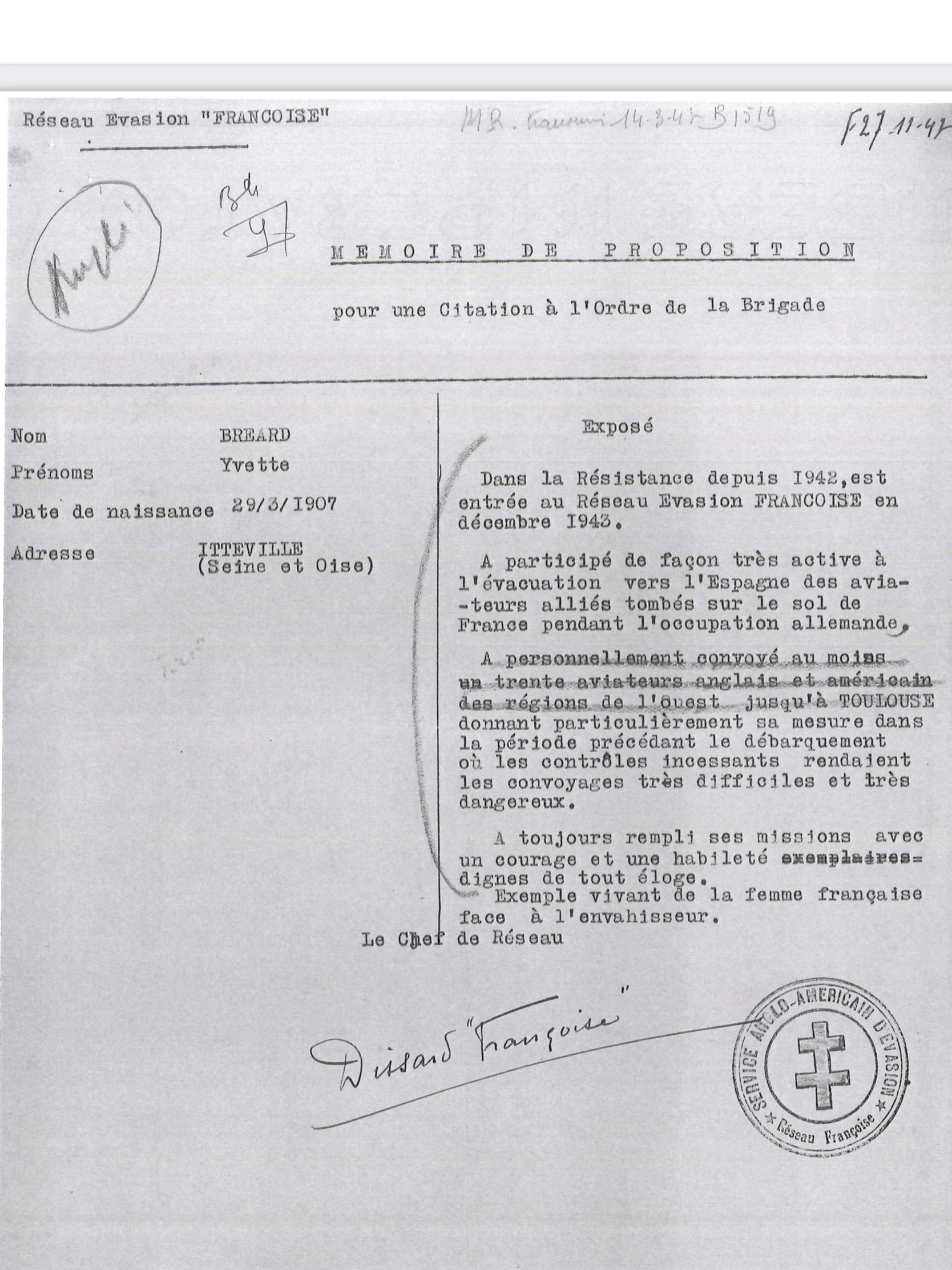 Yvette was born on March 29, 1907 in Sens (Yonne) France. She was living in Itteville (south of Paris) as a hairdresser when she was working for the Françoise Network. She was recruited by Philippe (Jean-Henri Bregi).