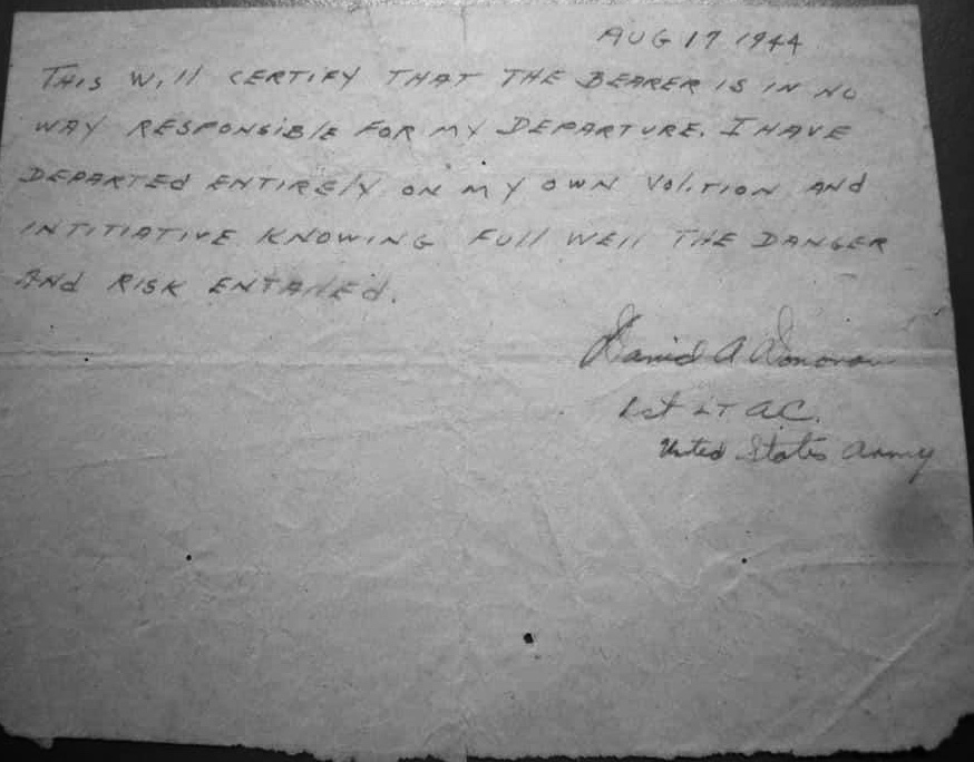 After Jean-Henri Bregi brought David to Laguepie he said he was going to Bordeaux to pick up another pilot and he would come back to get him. David stayed in the Laguepie area for approximately one month and Bregi did not return because he was arrested on a bogus charge by the local police. So, David decided to go off on his own. He headed north and ran into a naturalized French citizen from Australia. His name was Steven Post, and he took Pop to Villefranche (Aveyron). But before he left, Lt. Donovan was instructed to write down his intention. The document below was just discovered on 8/19/20 seventy-six years later to the day. Note the date on the document.