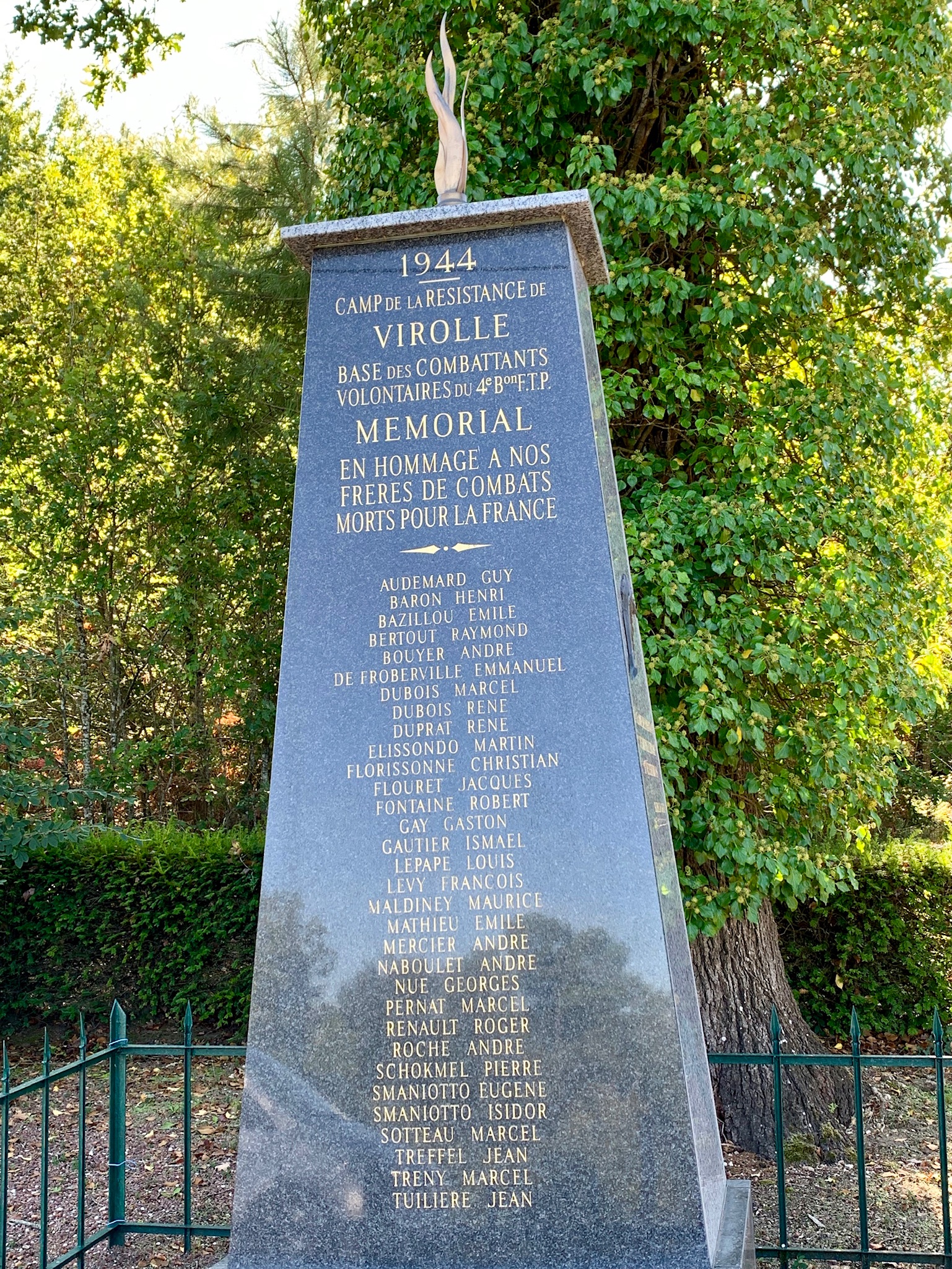 There is a memorial for the Resistance of Saint Etienne de Puycorbier (a village near Mussidan) that Mr. Rolli was commissioned to write some of the plaques. This is the maquis [ma' ki] ) that welcomed Dad. Patrice knew these men.