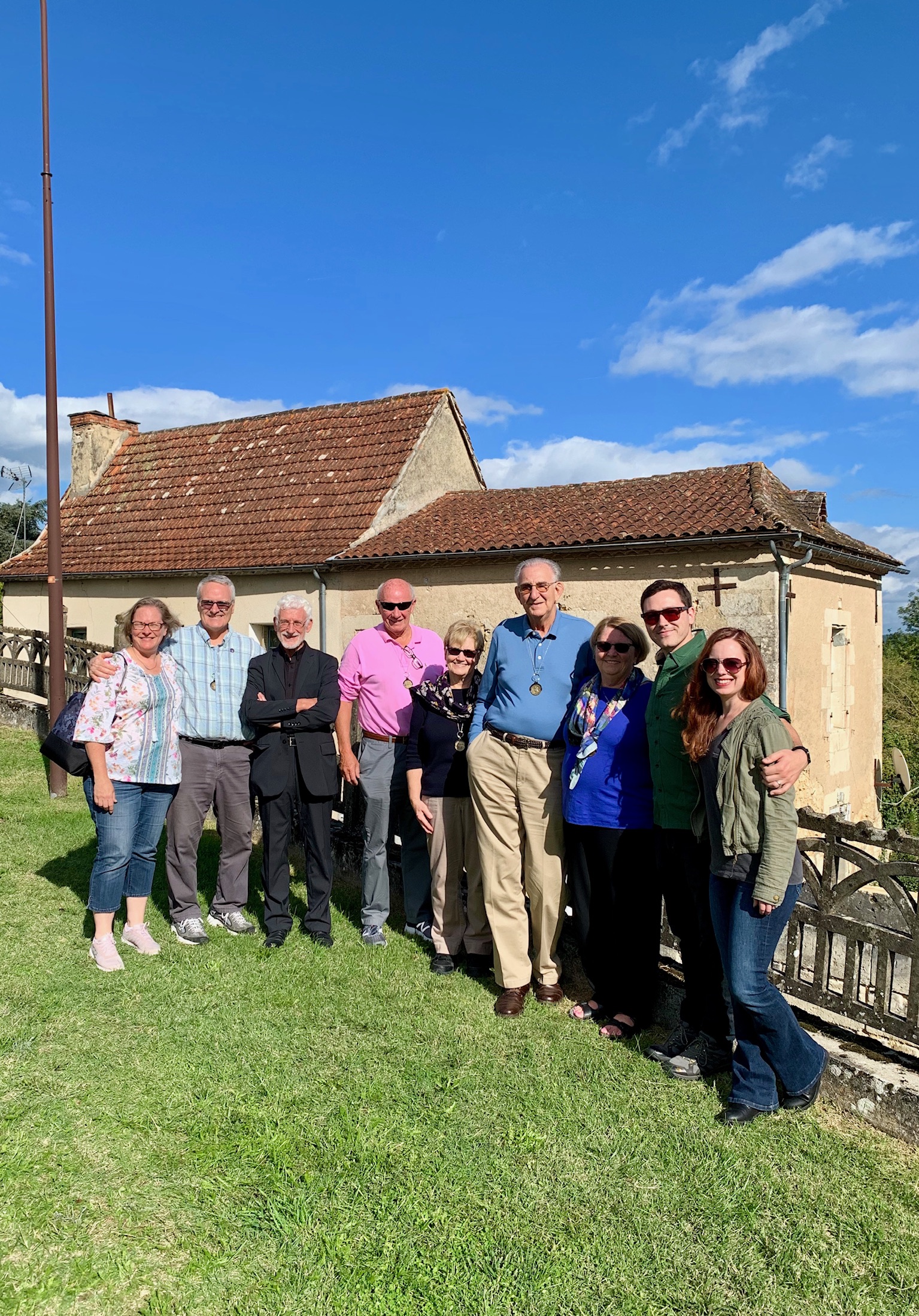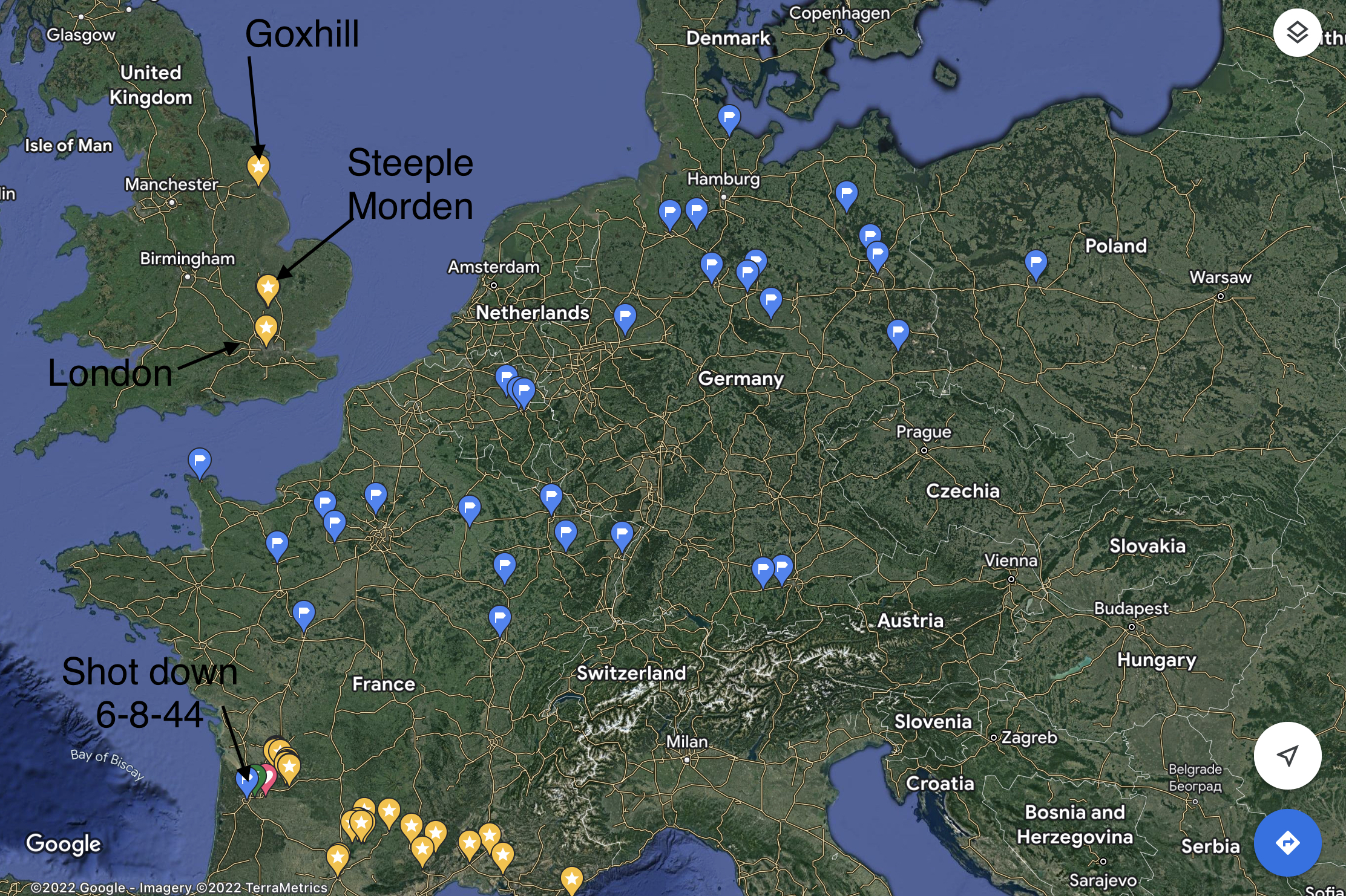 This is where the story begins of his three-month evade and escape from German occupied France. If it wasn’t for very brave ordinary citizen’s putting their own lives at risk and for the help of the French Resistance, my father might not have made it home. In October of 2019 (75 years later) three of my sisters, (including Mary Joyce), myself and our spouses, spent three weeks following in his footsteps. We visited the small towns and villages he passed through during his evasion. We were able to meet some of the people who were only children in 1944 that witnessed the attack in Chalais. We met people that were children when their parents, at great risk, took my father into their homes to harbor him from the Nazis that occupied their country.