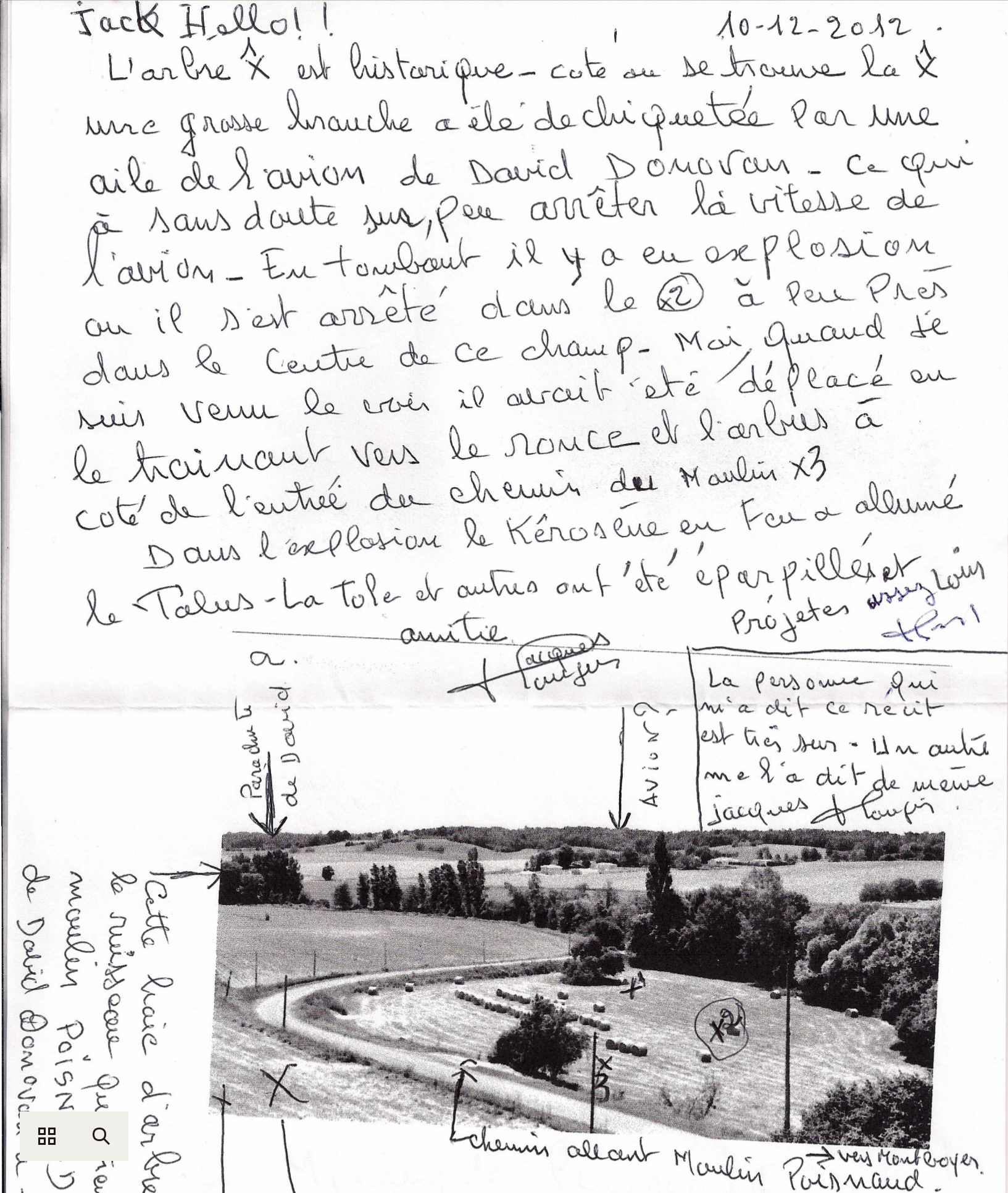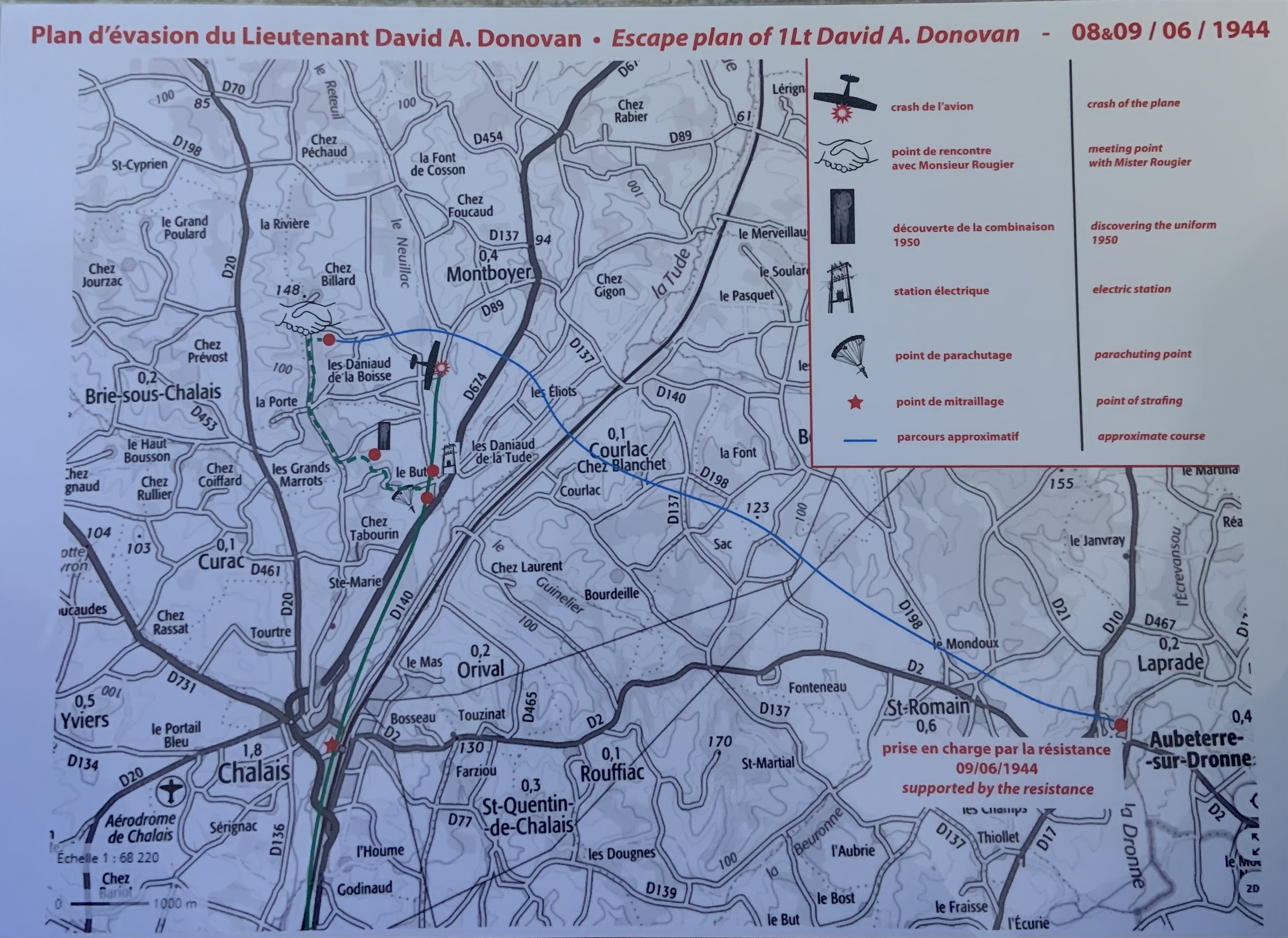 Mr. Poineau was 11-years-old and lived only 500 meters from the spot Dad landed in his parachute. He told us he saw Donovan coming down in his parachute and he saw the Mustang crash in a place called Moulin Poisnaud.