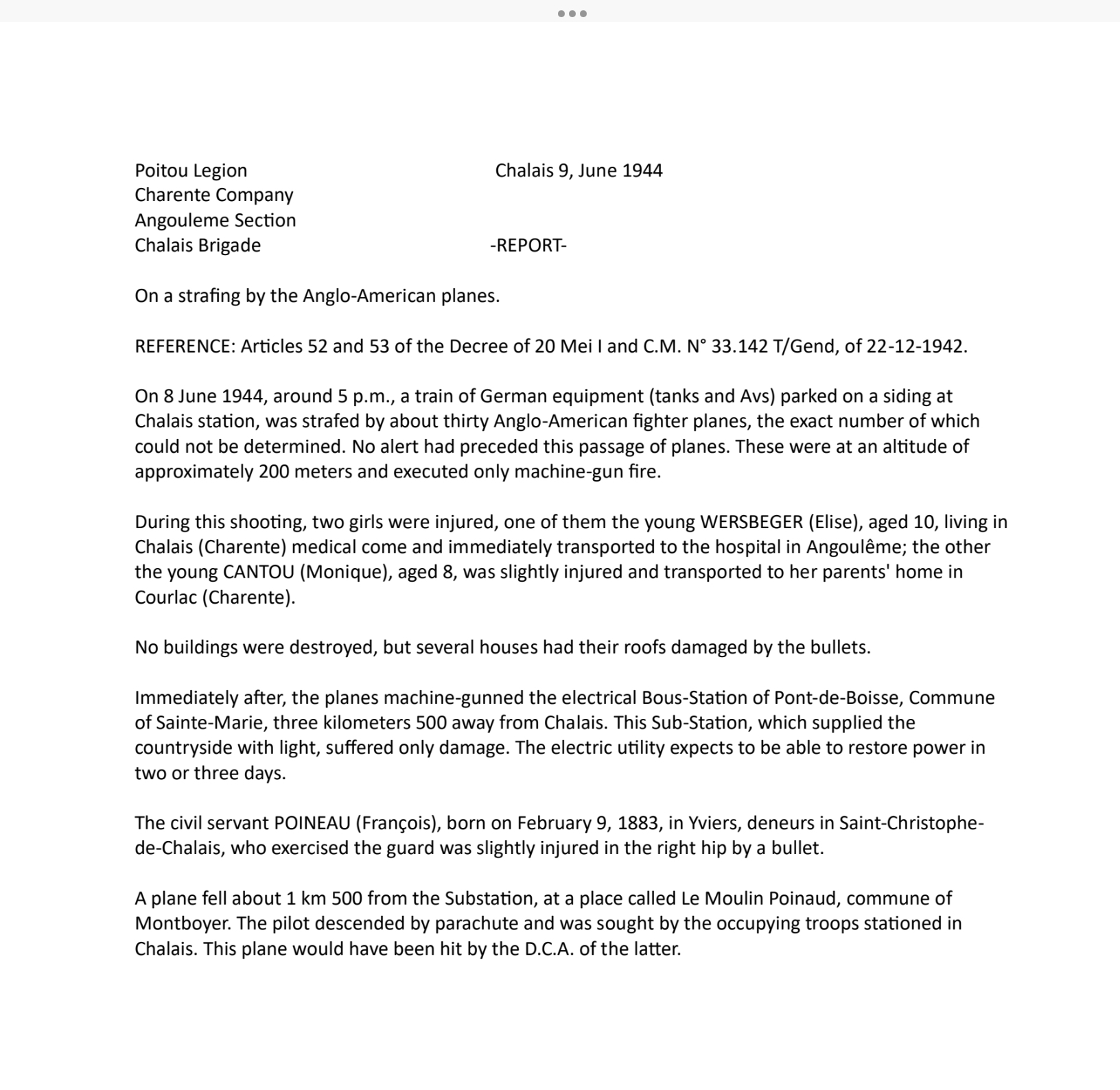 2. Saw in Rodez remains of political prisoners buried in the outskirts of town. They were buried up to there necks and then hit with rifle buts and then killed them with machine guns the heads were not recognizable.