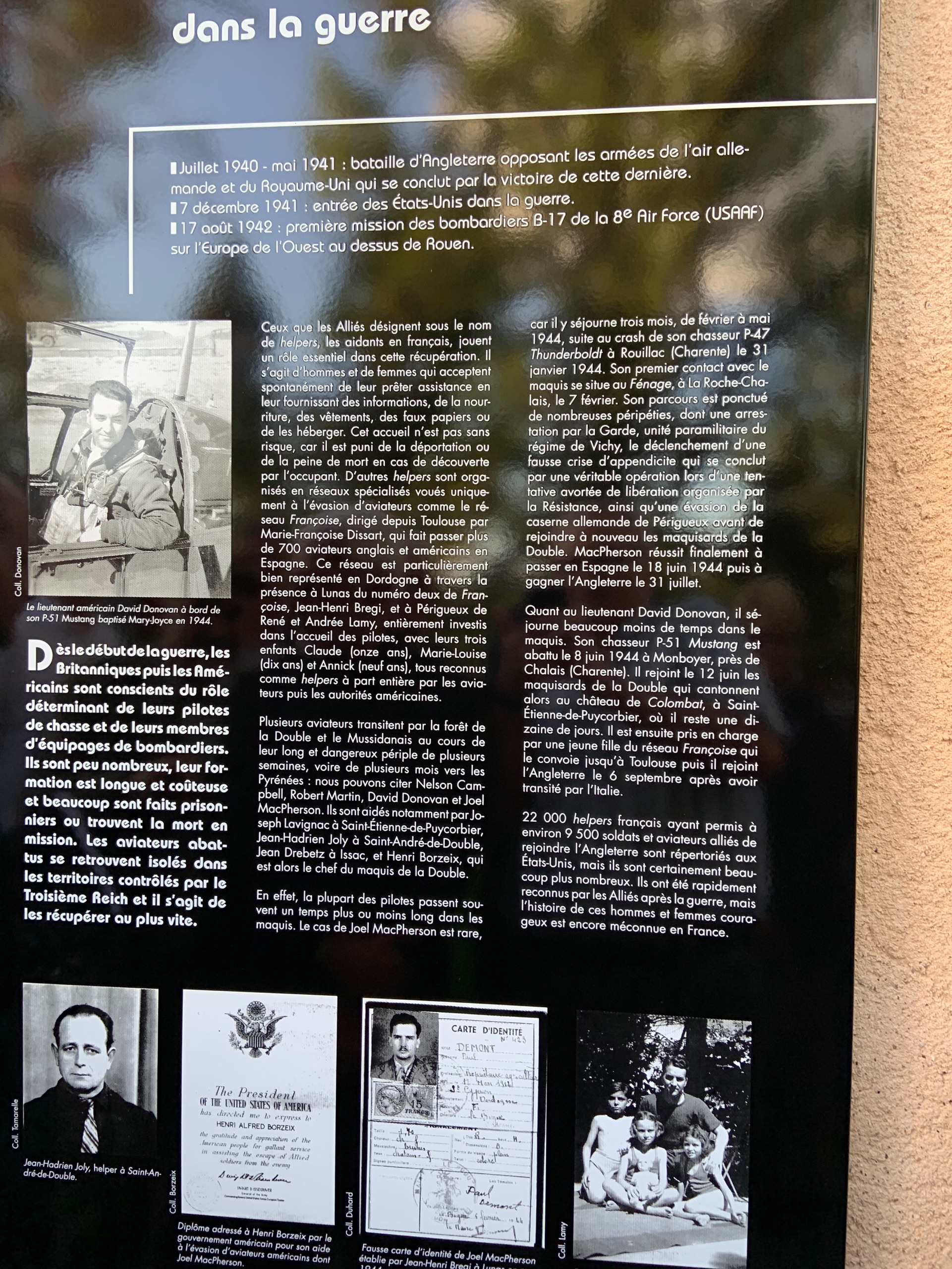 A member of the maquis, Guy Leger recalls "David the Pilot". "It was Yves Bouche who brought me David. This American pilot came from Charentes. He stayed with us two weeks. He showed us how to use the guns we received from the Americans. He was very pious. On all the Sundays he wanting to go to mass. So Lucien Laforet escorted him to the church in Saint-Michel-de-Double and stood guard at the door at while David was inside".
