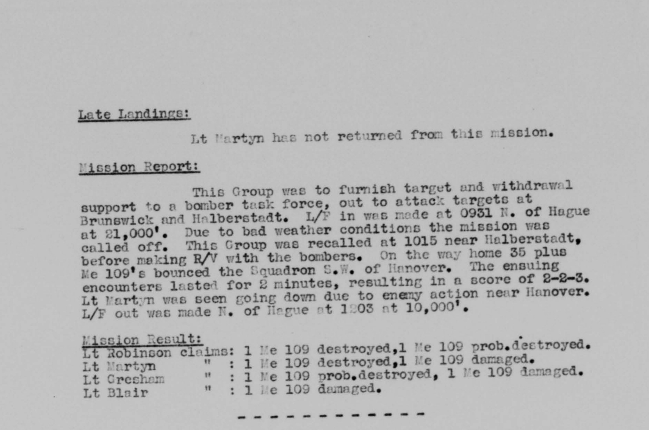 They met up with the bombers near Berlin. Near the city of Brunswick the pilots of the 358th observed about thirty Bf-109s in the sky, but Capt. Sluga, instead of attacking, he held his squadron close to the bombers to protect them. The 352nd Fighter Group based in Bodney, England, also on this mission, went after the enemy aircraft and managed to shoot down twenty-nine aircraft. Flak was very heavy over the cities of Hanover, Brunswick and Berlin and a few B-17s were shot down.