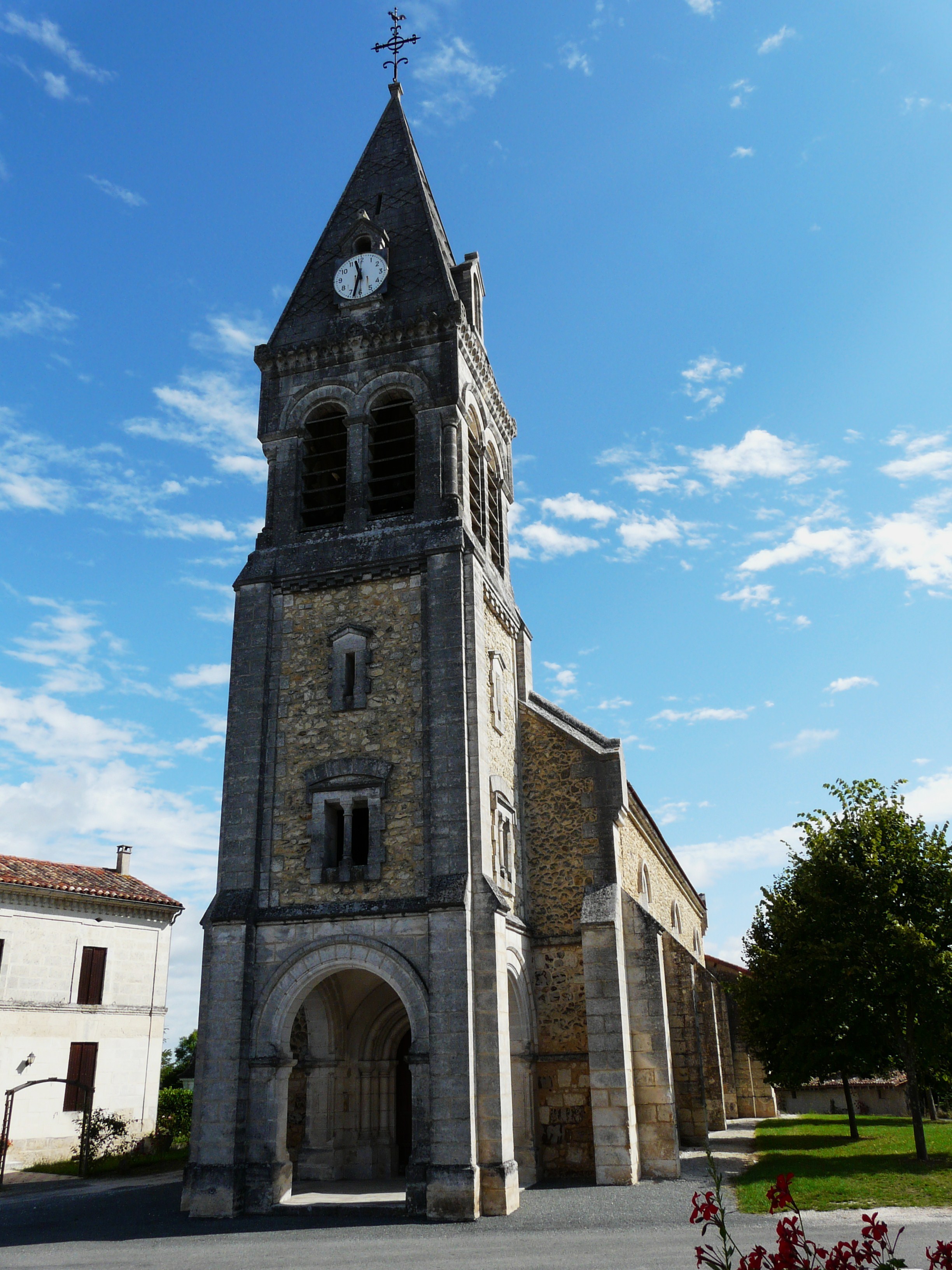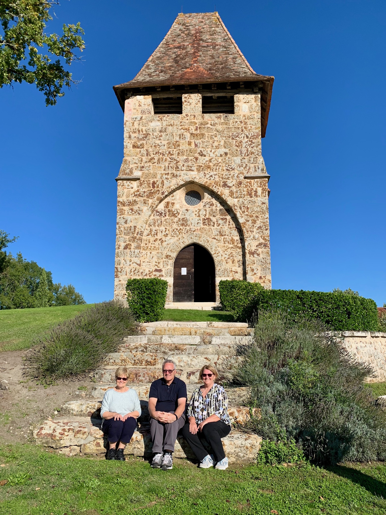 Sitting on the steps of Saint André Church in Saint-André-de-Double (10/11/19).