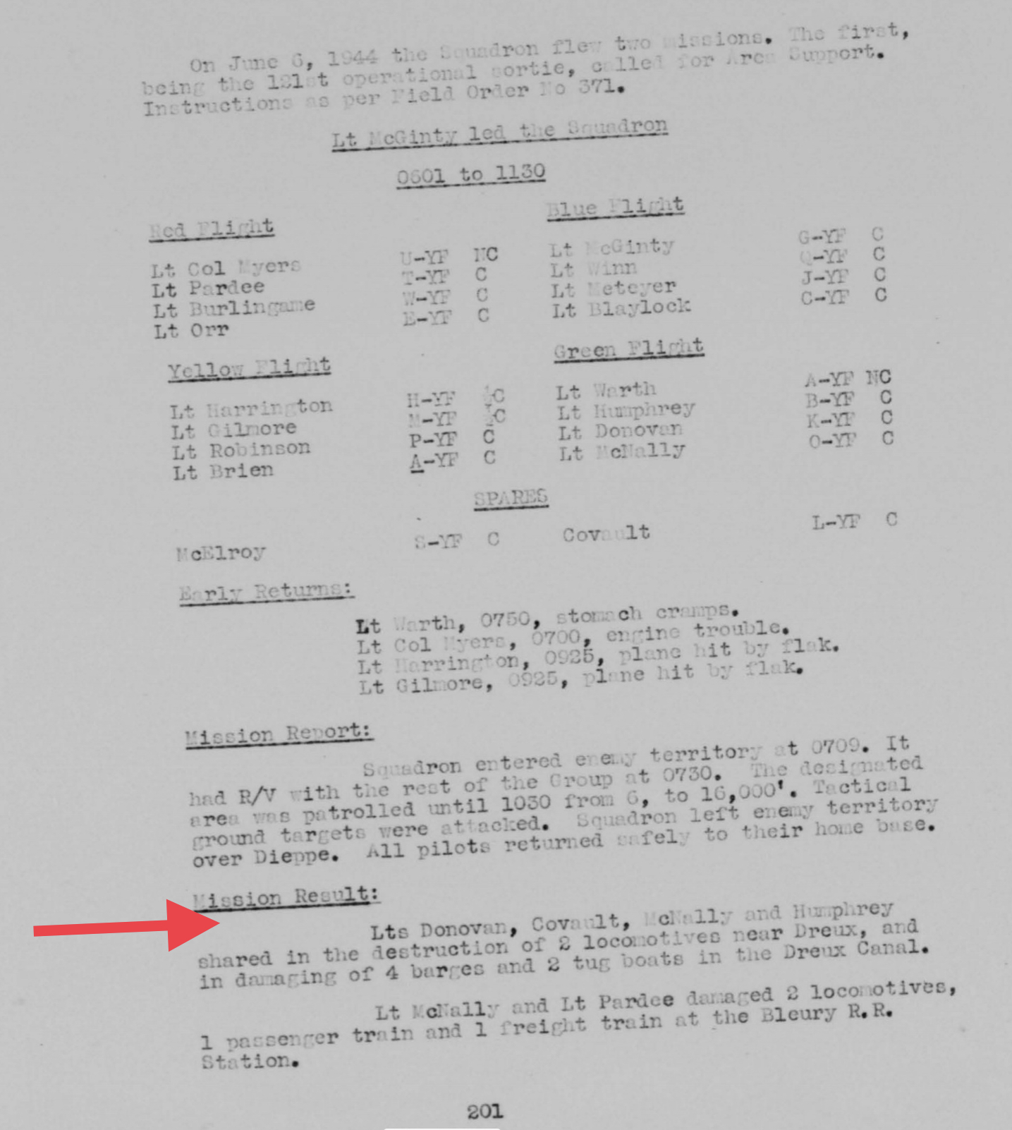 VIII FC FO 371-"FULLHOUSE"-Part B: Lieutenant William J. McGinty led the 358th Fighter Squadron on a "Type 16 Control" mission around the towns of Alençon and Dreux after Lieutenant Colonel Raymond B. Myers had to abandon the mission because of the a problem on his engine. David was on The Green Flight. They took off at 06:01 and reached the top of the target at 07:30. This mission was synonymous with several victories for the group. The patrol consisting of David A. Donovan, Vern W. Covault, Russell J. McNally and William L. Humphrey shared the destruction of two locomotives, four barges, two tugs and a truck near the town of Dreux (57 miles west of Paris). Russell J. McNally and Harry W. Pardee Jr shared two locomotives and two machine-gun trains at Bleury Station. The mission in the area ended at 10:30 a.m. Everyone returned safely from this mission on this special day even though many pilots had received many impacts due to the Flak in their fuselage. The pilots returned to Steeple Morden at 11:30 a.m.