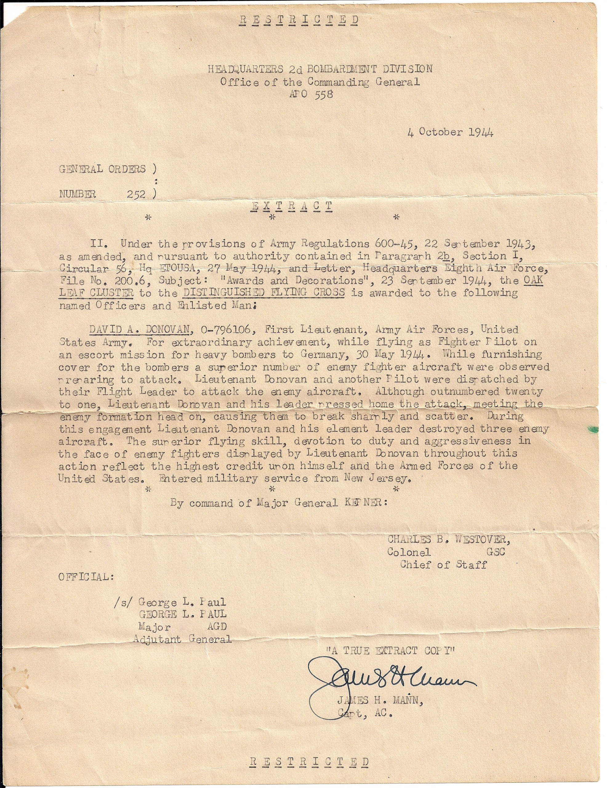 The report written by Major General Kerner (see document below): "David A. Donovan, O-796106, First Lieutenant, Army Air Forces, United States Army. For having completed extraordinarily, then flying as a fighter pilot in an escort mission for heavy bombers in Germany, on May 30, 1944. Providing cover for bombers, a higher number of enemy fighters were noticed, preparing to attack. Lieutenant Donovan and another pilot were dispatched by their Flight Leader to attack the enemy aircraft. Although outnumbered, twenty to one, Lieutenant Donovan and his Leader rushed to the enemy, meeting them head on forcing them to break their formation and disperse. During this engagement, Lieutenant Donovan and his Element Leader will destroy three enemy aircraft. The superiority of their skills, dedication to combat and aggressiveness against the enemy demonstrated by Lieutenant Donovan through this action reflects the highest credit to himself and the armed forces of the United States."