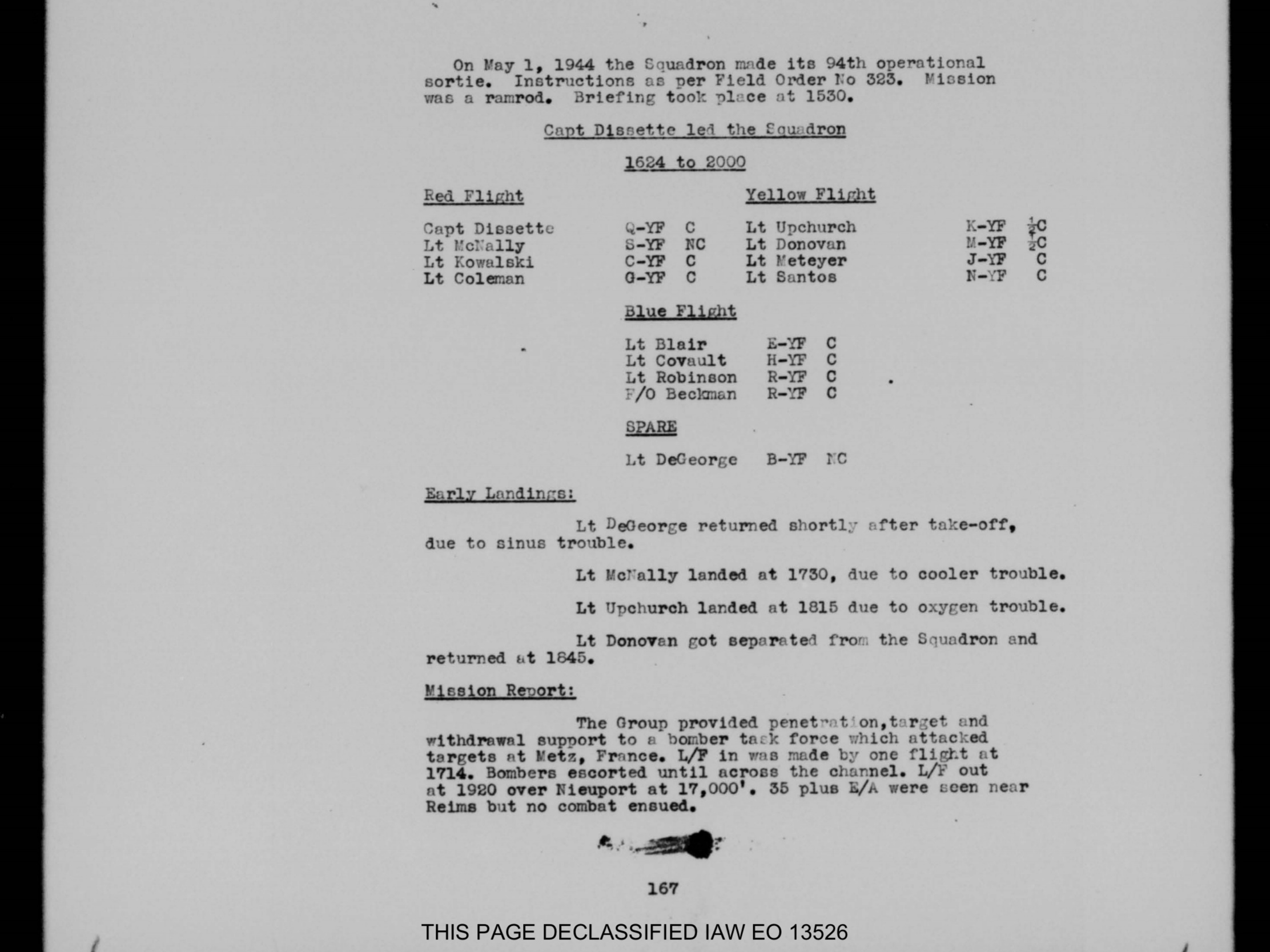 May 20, 1944, Colonel William J. Cummings to lead a mission to the Bierset and Liège area in Belgium. Lt. Donovan was in Green Flight and had a problem with his airplane. His defrost was no longer working twenty minutes after takeoff and he had to return to base.