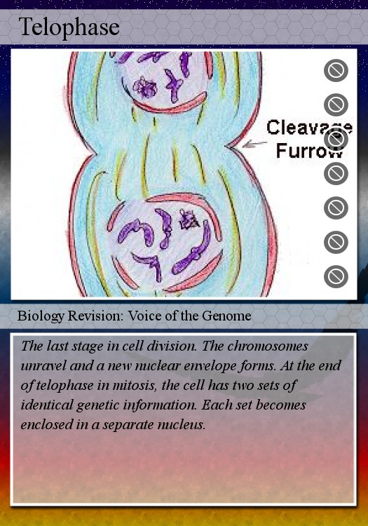 Telophase is the last phase of mitosis. At this stage the cleaveage furrow forms which is the point at which the cell will divide and form the new cell wall. The chromosomes will then be enclosed by their new nuclear envelop during this stage also well.
