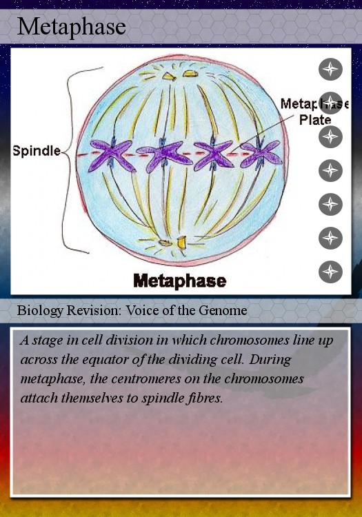 Metaphase is the second phase of mitosis. Metaphase is when the chromosomes line up along the "equater" of the cell and the spindle from fibers attach themselves tho each side of the chromosomes to prepare for the next phase of mitosis.
