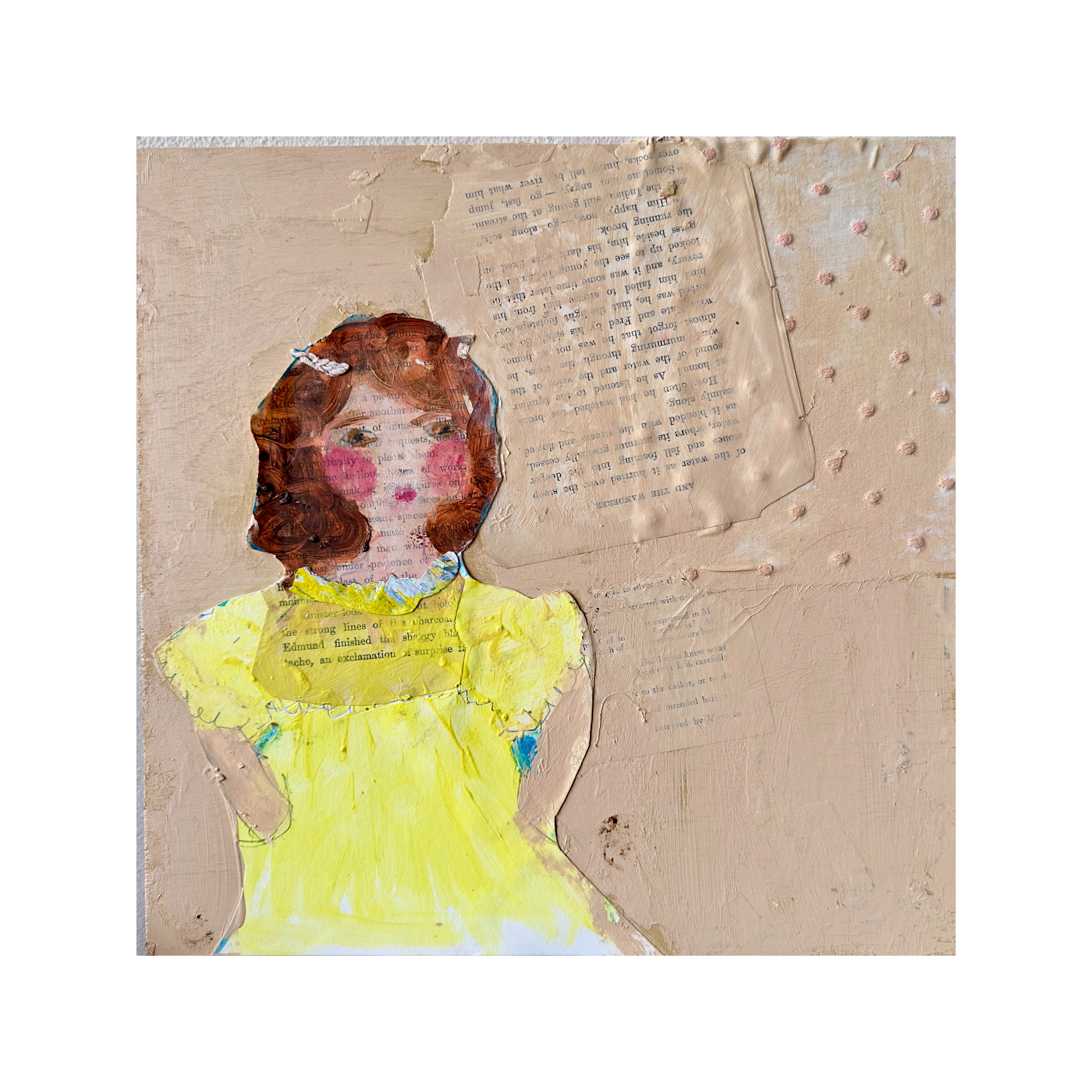 My work delves into the intricate tapestry of human experience, where innocence, storytelling, and abstracted forms converge. Each piece begins with a watercolor illustration, often featuring young girls who symbolize my inner voice. These figures, delicate yet resilient, navigate a world imbued with nostalgia and wonder.