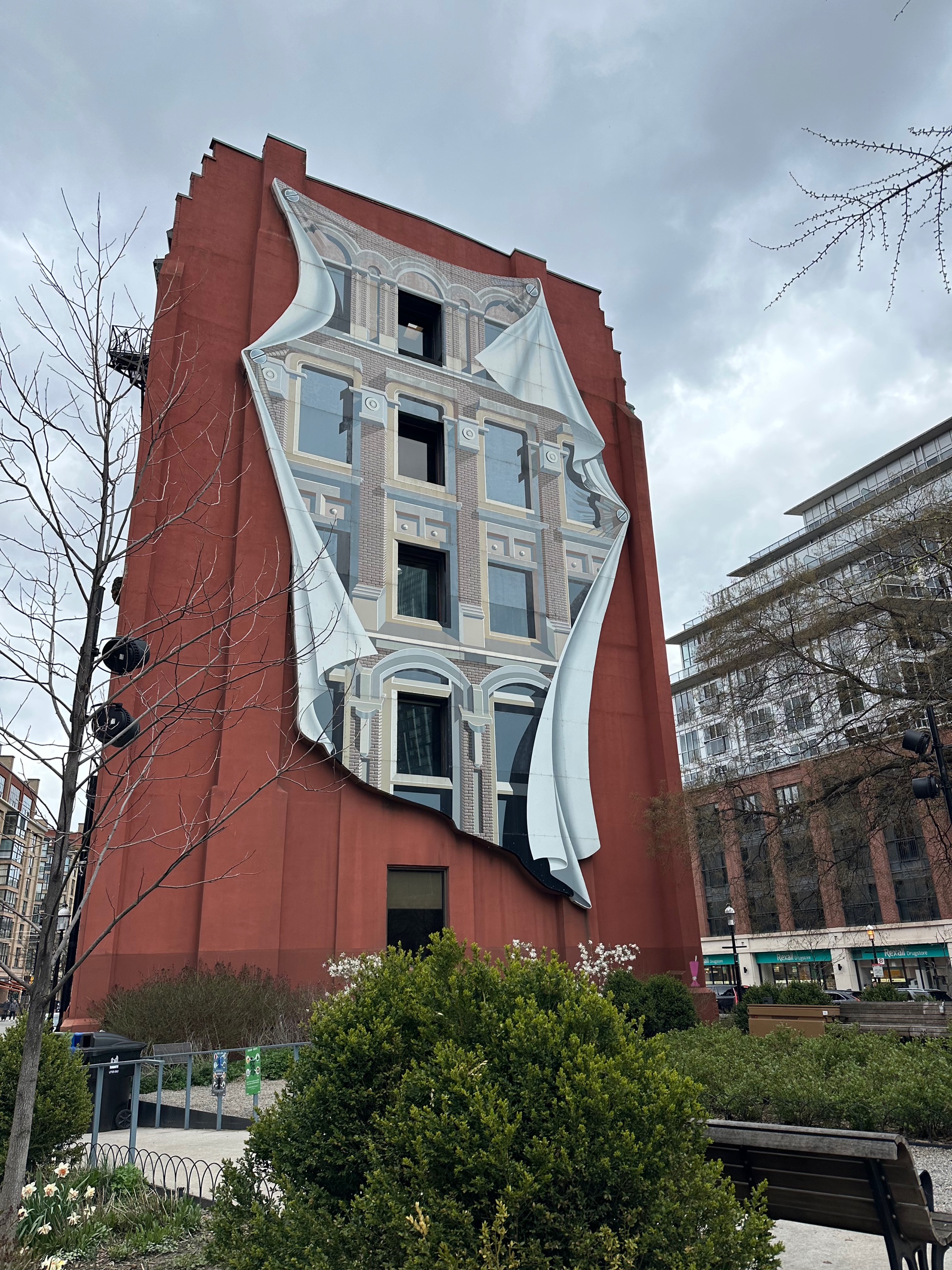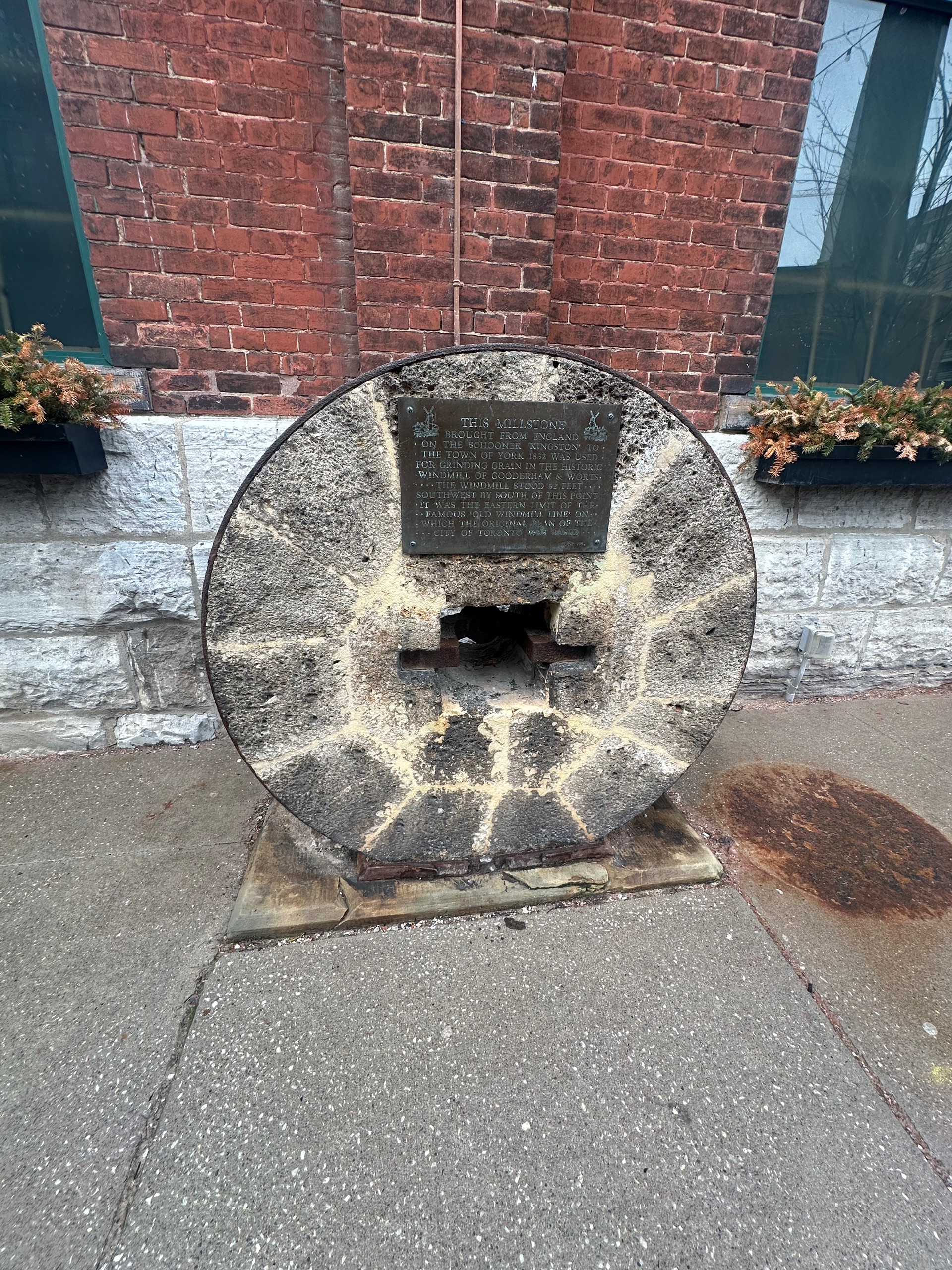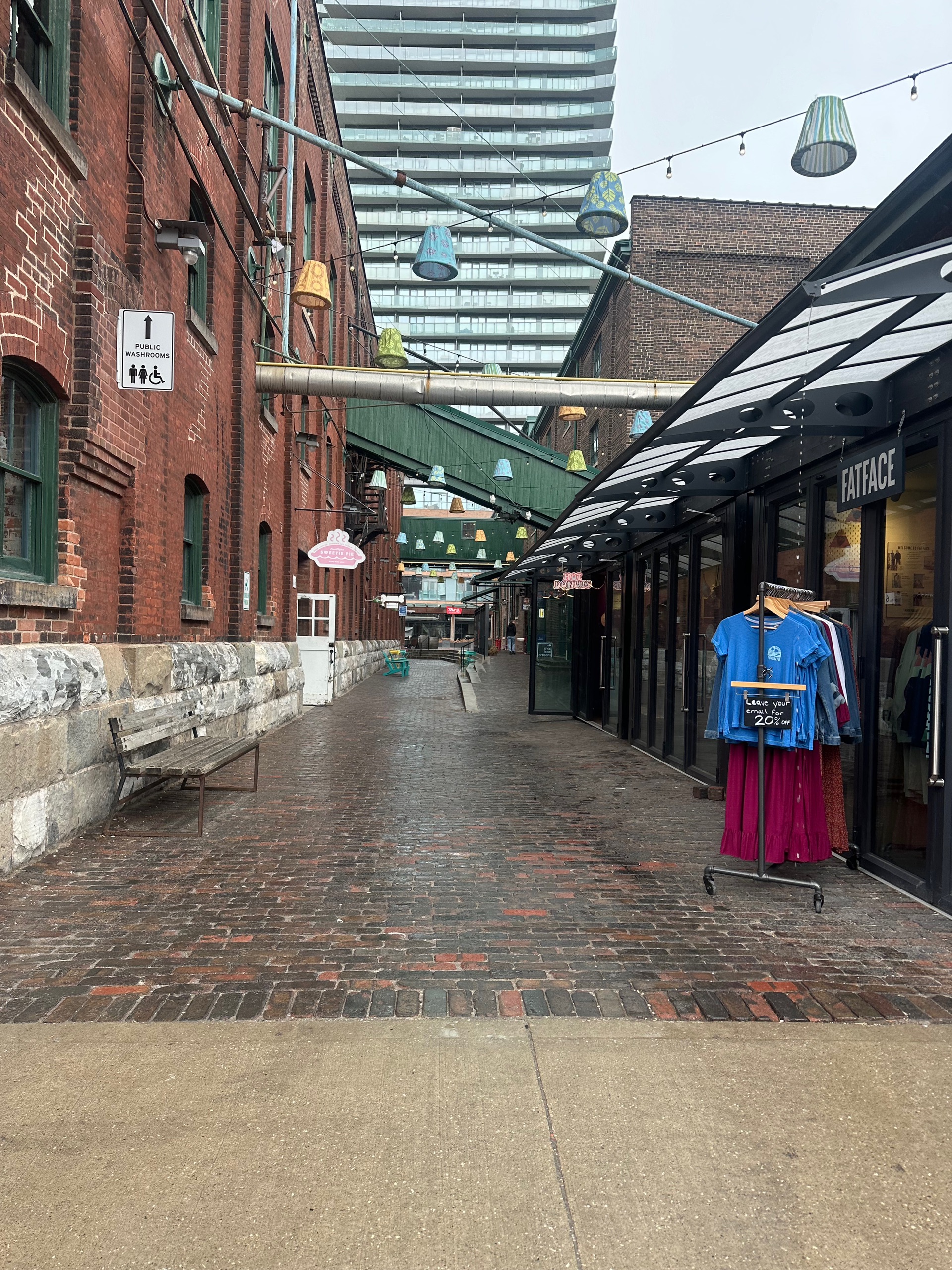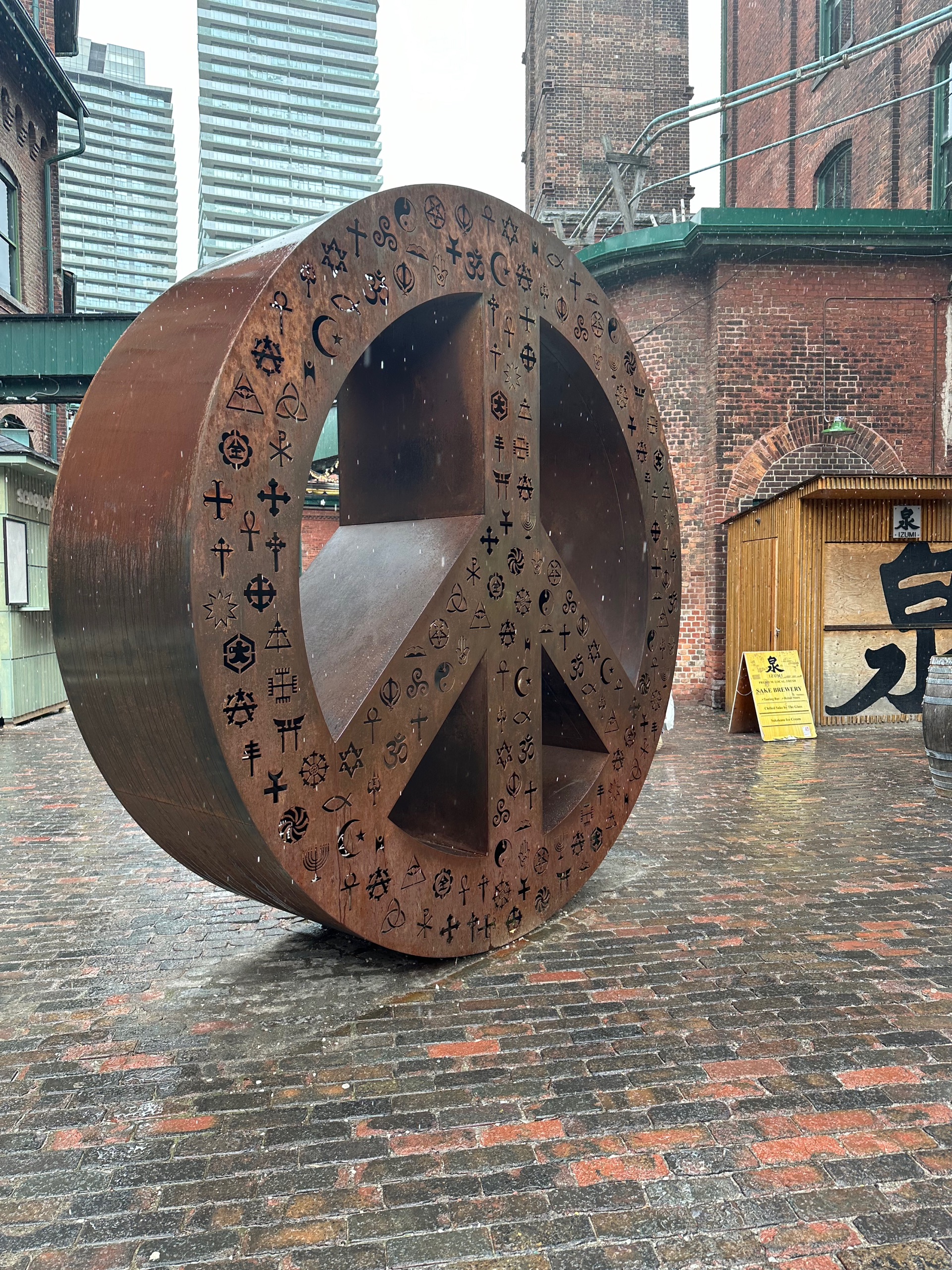 Back to the distillery district for more respite, in the form of a loo visit, some water and a freshly baked cookie. When the hail eventually stopped I wandered back towards downtown Toronto. Google maps told me that there was a mural or art installation or something on that flatiron firkin pub, and so it proved. Not sure how I missed it in the morning, given it looms over the dog fountain.