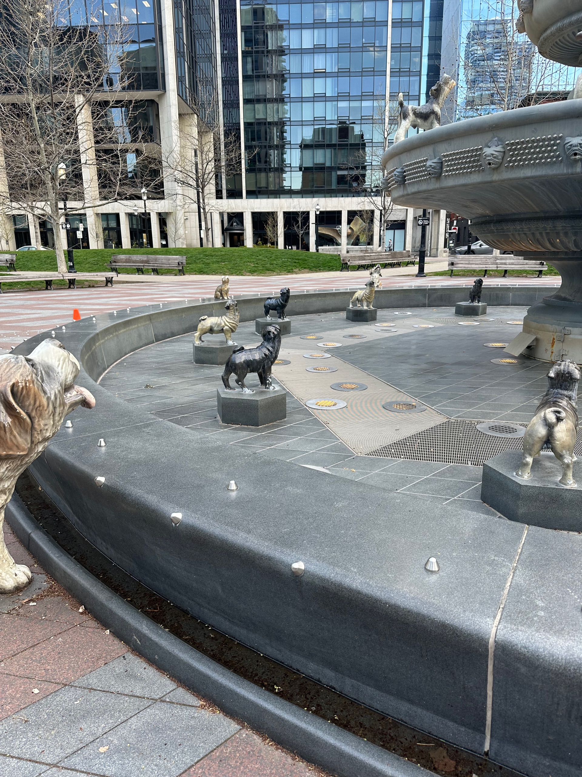 Left the hotel at about 0715, weather decent. The subway station I needed to get to is up beyond the flatiron building, behind which is a little park that despite my state on Thursday, I had remembered Mike recommending I visit. Enigmatically he’d said “no spoilers”, turns out the park has this really cool dog fountain. Like, a big fountain and a load of statues of dogs. Sadly the water wasn’t running, but you get the idea.