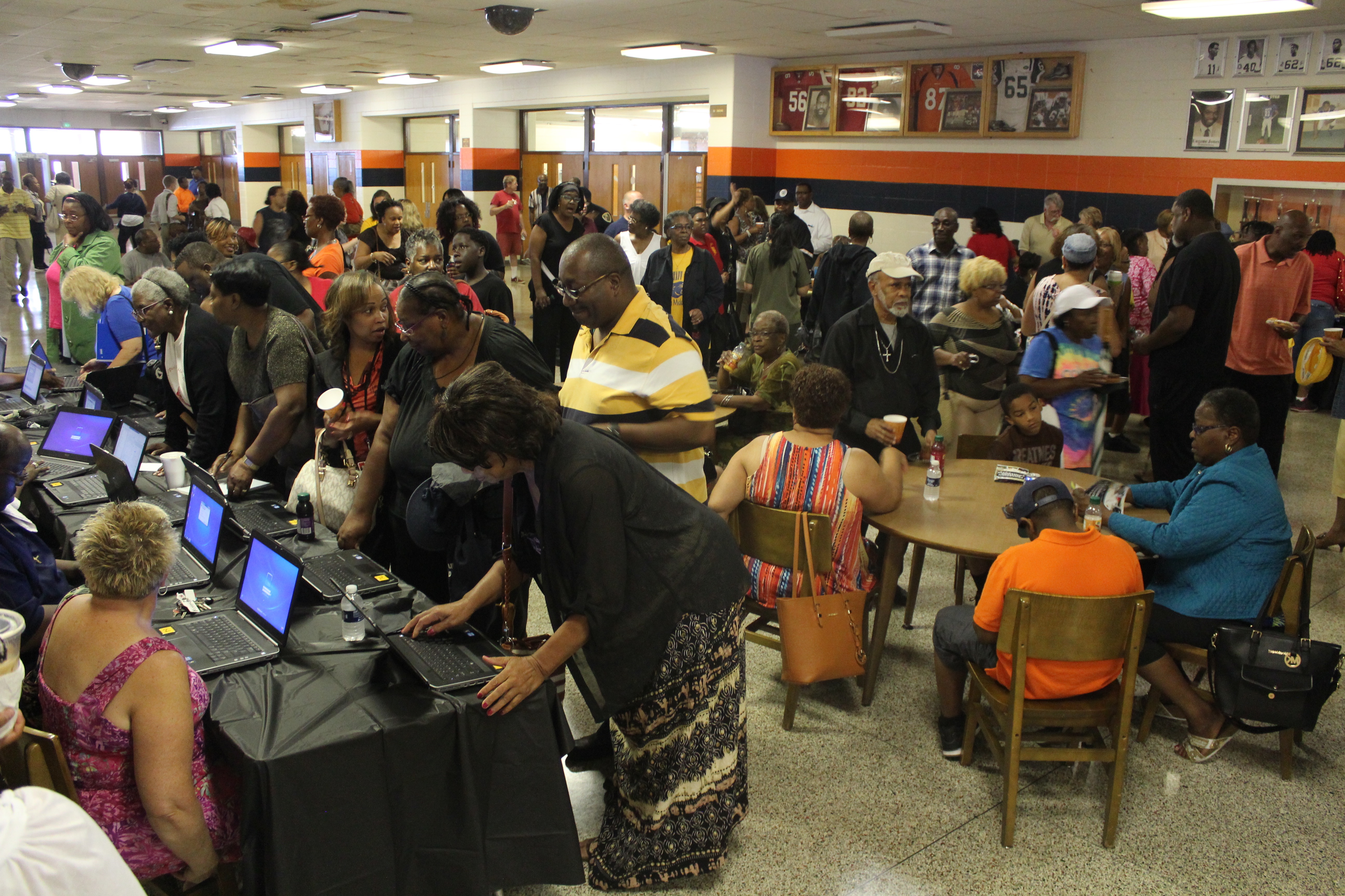 It's a sunny afternoon in late August. Gary students are not back in school yet, but teachers are returning from their own summer break. Adults drift in through the doors at Gary's West Side Leadership Academy, spot their friends and colleagues and rush in for a hug – just like it probably was when they were in high school. Small groups start to form, congregating around folding tables stacked with snacks and bottled water.