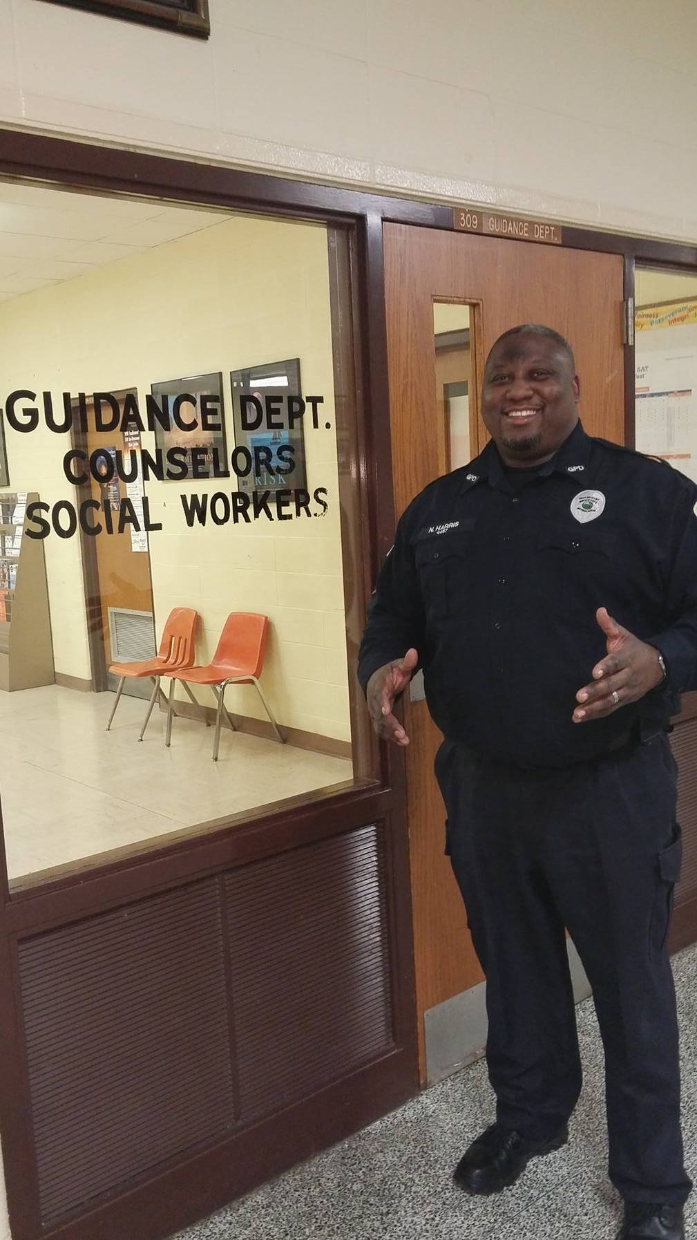 Officer Harris is tall, he’s big, he has a booming voice – but to Gary staff and students, he’s “Officer Friendly.”