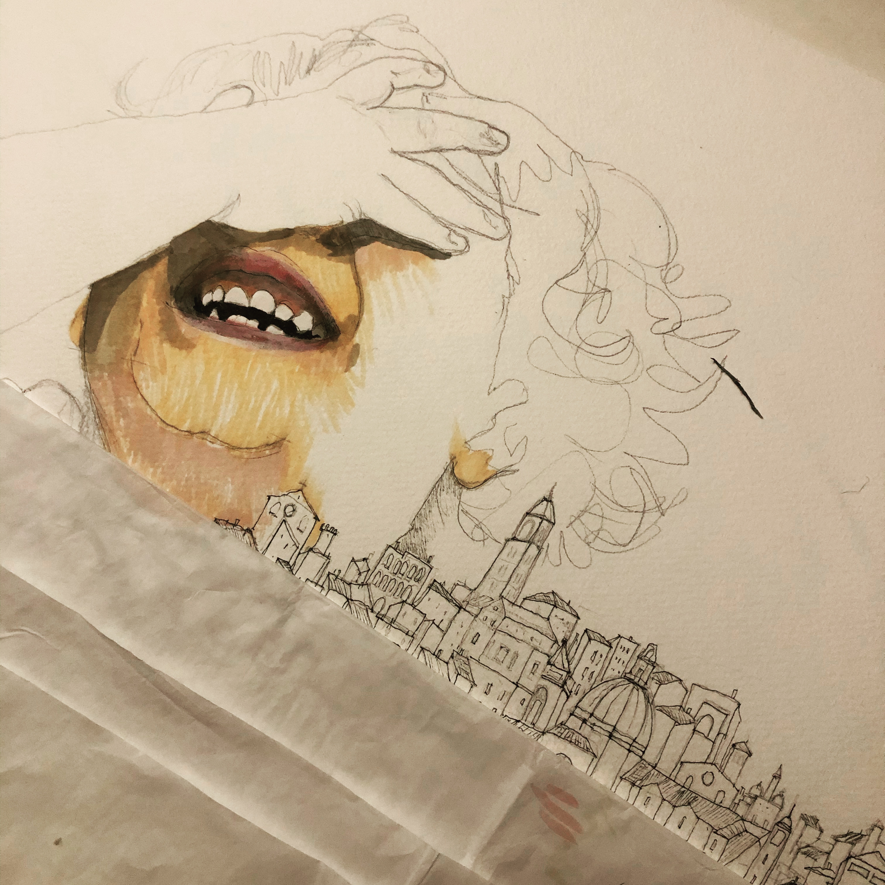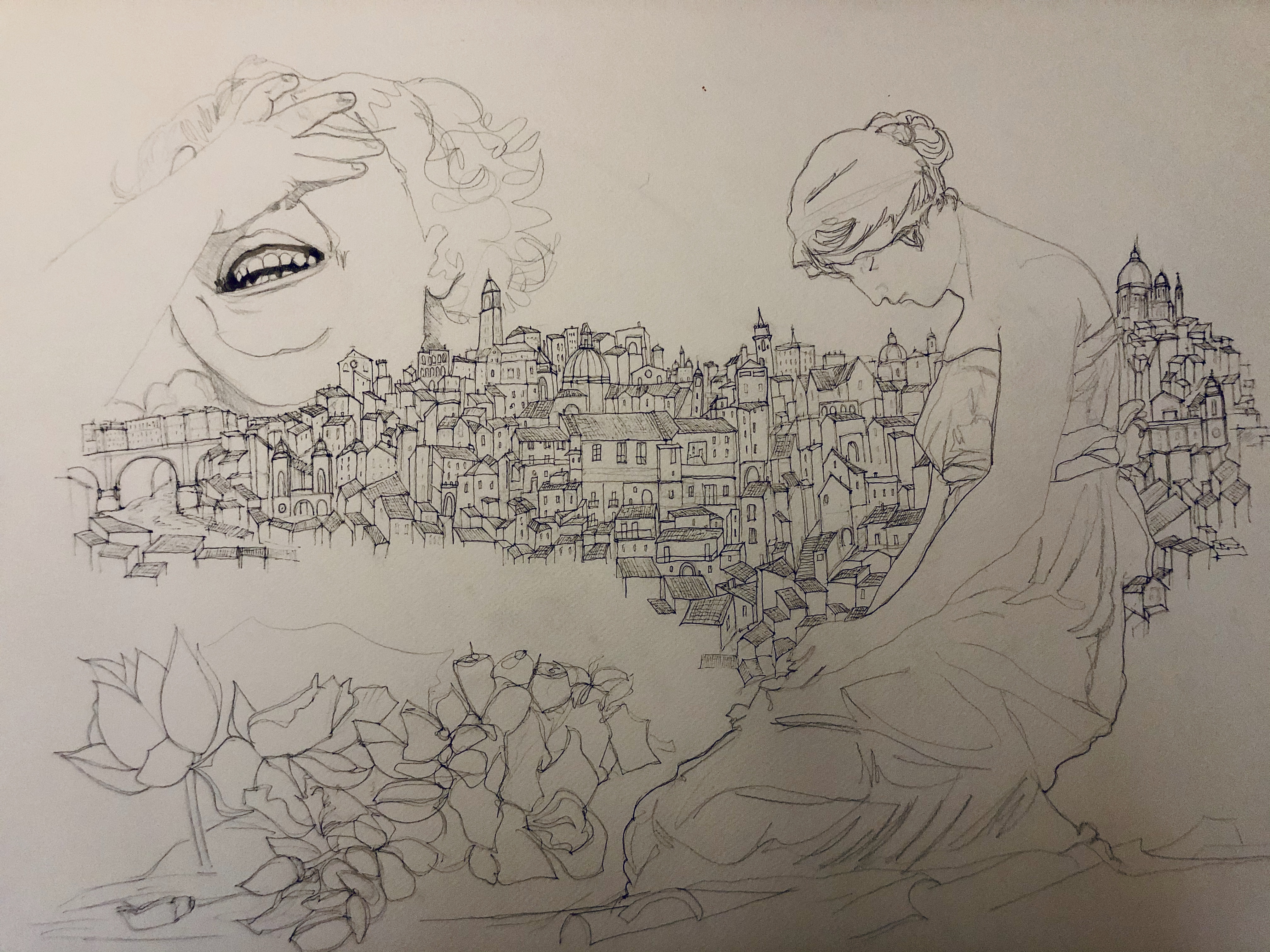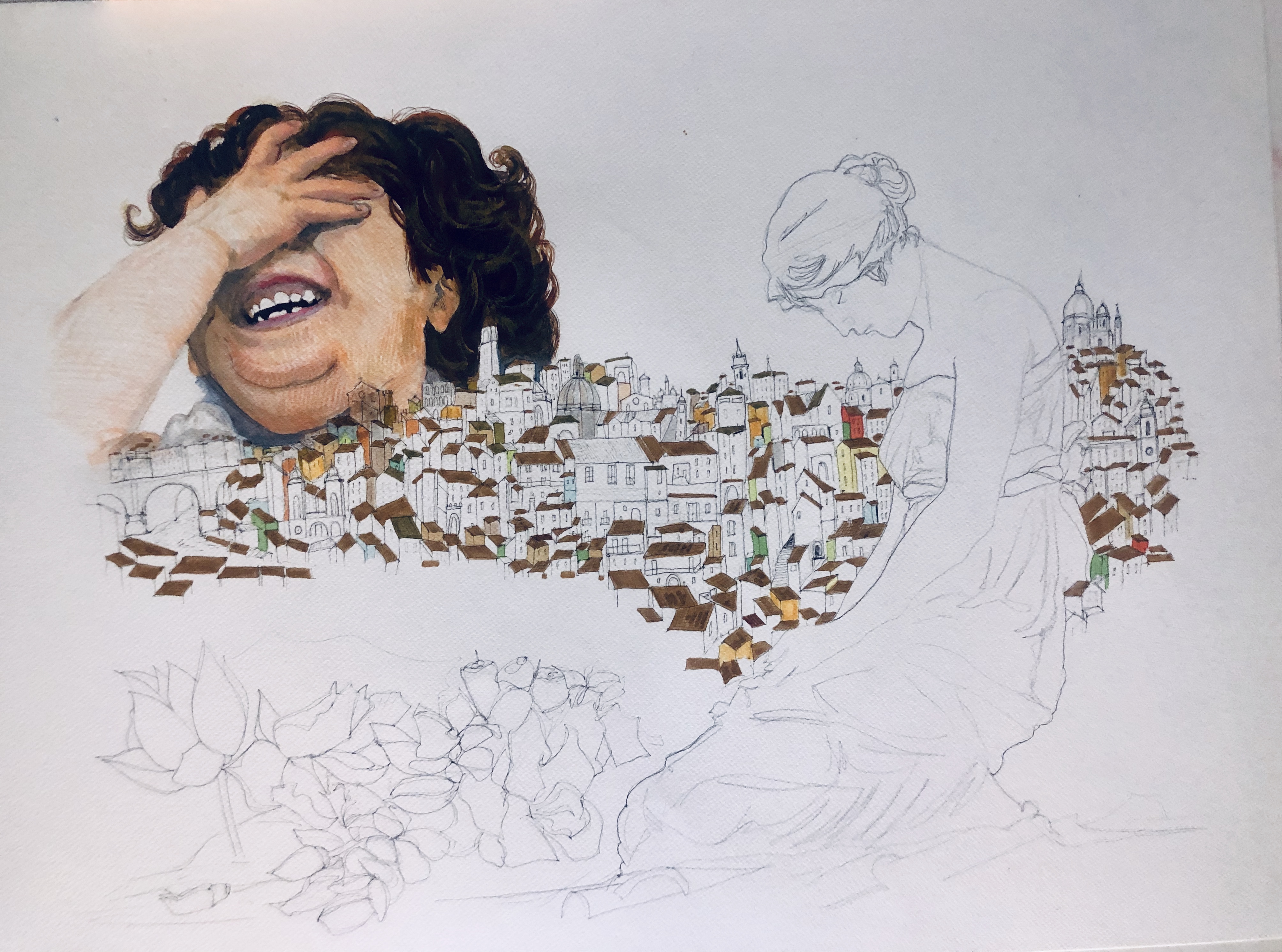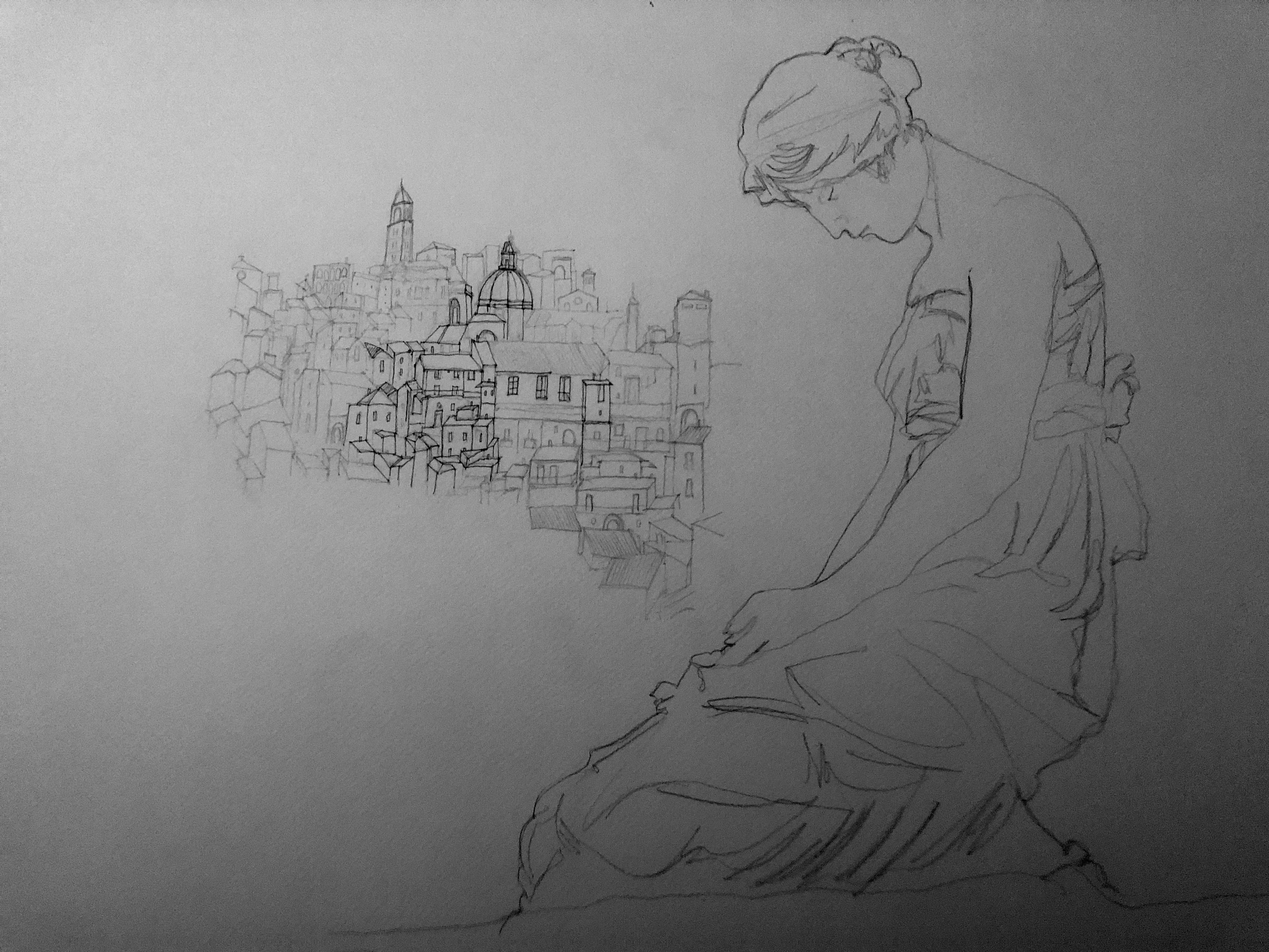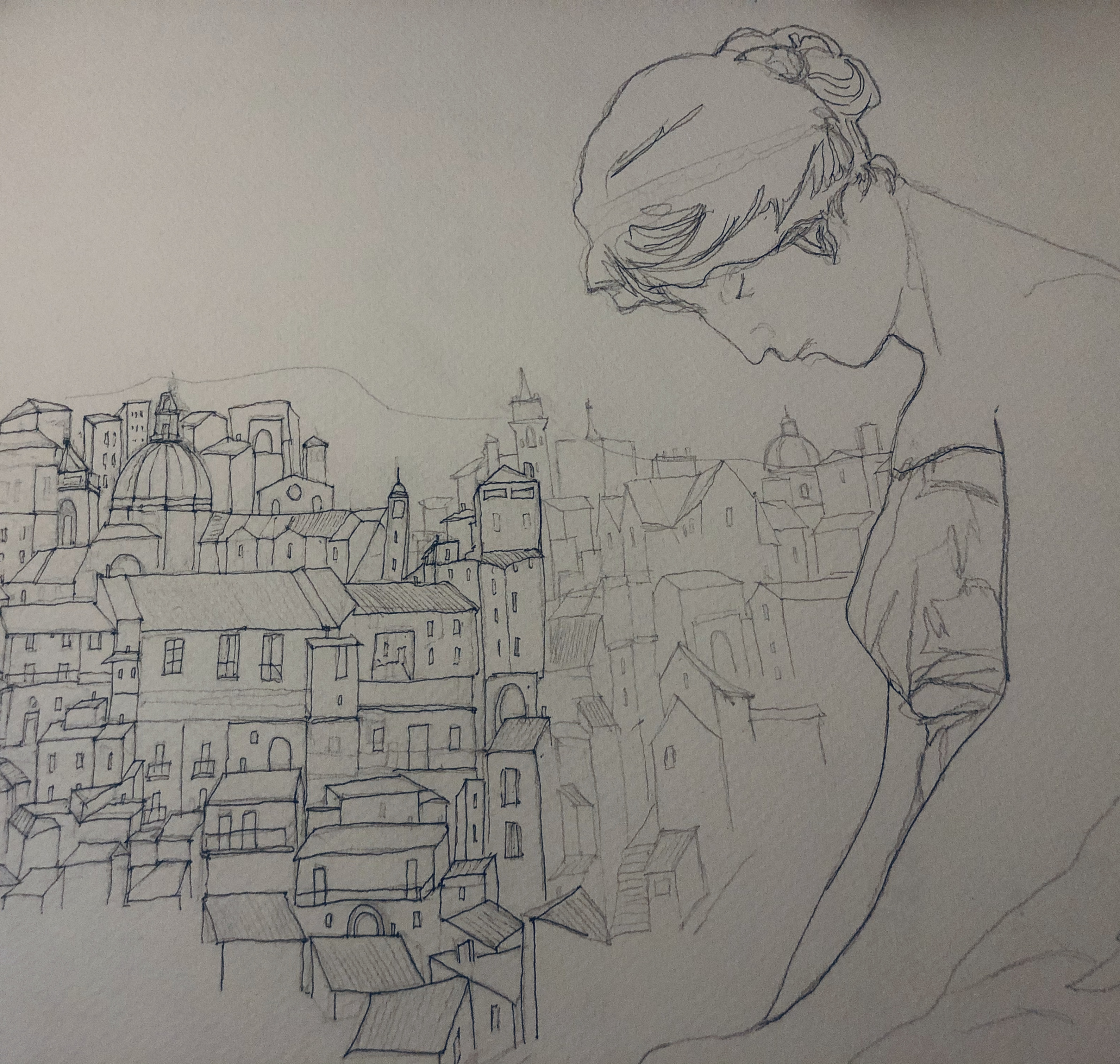 Scelgo un formato grande, un foglio per acquarello 50X70. Mi armo di matita e comincio ad abbozzare l'idea.